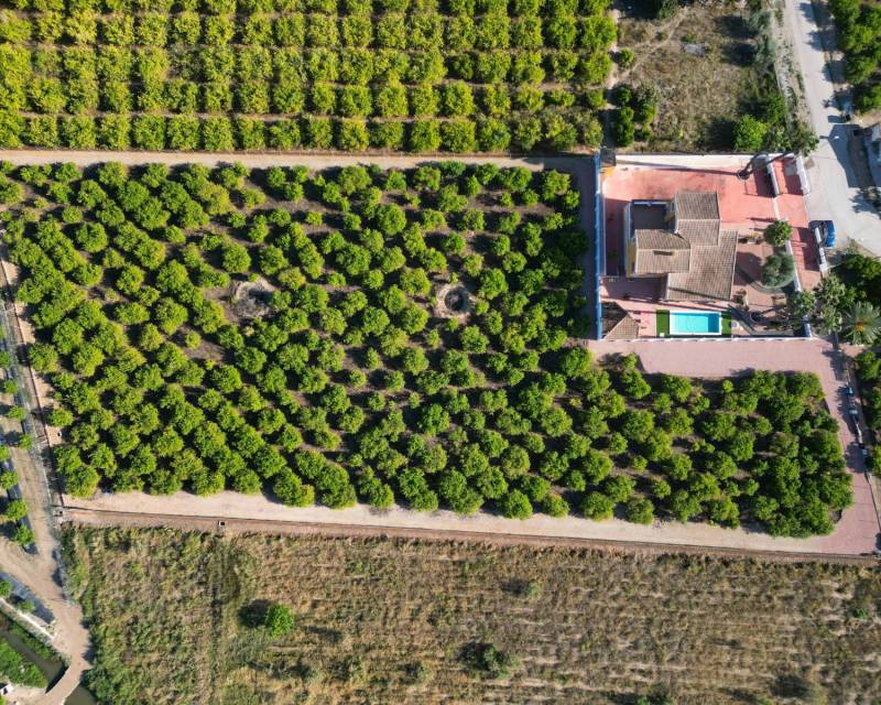 La propiedad tiene 9.480 m2 y está completamente vallada, con una casa de 495 m2 en una parcela de 1.000 m2 dentro del límite de la propiedad. La casa consta de tres plantas: PLANTA SEMISÓTANO: 224 m2 de superficie útil Cochera para varios vehículos, gimnasio con ducha, sala de entretenimiento, área de manualidades con estantes y banca, una recámara y walk-in closet con zapatero. PLANTA BAJA: 178 m². Superficie útil Consta de amplio salón, amplia cocina con salida a zona de barbacoa exterior, lavadero independiente, coladuría con salida a terraza exterior, 1 baño con ducha, 1 dormitorio con armario empotrado y un despacho con salida a terraza exterior. SEGUNDA PLANTA : 93 m². Superficie útil Dividida en una zona de estar con vistas al salón en la planta baja, un dormitorio principal con balcón, un baño con bañera de hidromasaje y vestidor, 2 dormitorios más (uno de ellos con armario empotrado) y un baño adicional con bañera. SERVICIOS Calefacción central con caldera, radiadores de agua y aire acondicionado en toda la casa. Una caseta exterior alberga los motores del aire acondicionado, la caldera y el depósito de diésel para su mantenimiento. Todas las puertas y ventanas cuentan con mosquiteras. También dispone de cableado de fibra óptica. El edificio tiene acceso desde la cocina a una zona de barbacoa con fregadero y horno. La propiedad también cuenta con piscina y jardín con iluminación exterior. Dispone de puerta de entrada motorizada y garaje. Jardín de limoncillo: La casa está rodeada de una parcela de limoneros fructíferos, regados con métodos tradicionales. La producción anual oscila entre 15.000 y 20.000 €. MAPA INMOBILIARIO La propiedad se encuentra en una zona tranquila, a 5 minutos del centro comercial Carrefour y de los centros urbanos de Orihuela y Bigastro, con buen acceso por carretera a ambos pueblos. Rodeada de edificios residenciales de características similares, la casa es fácilmente accesible. Numerosos supermercados, restaurantes y todos los servicios necesarios se encuentran cerca. Sr. Ext. Aluminio M.Int. Wood caldera de agua caliente Cocina independiente y equipada. Fachada de una sola capa Suelos rústicos Orientación al sureste