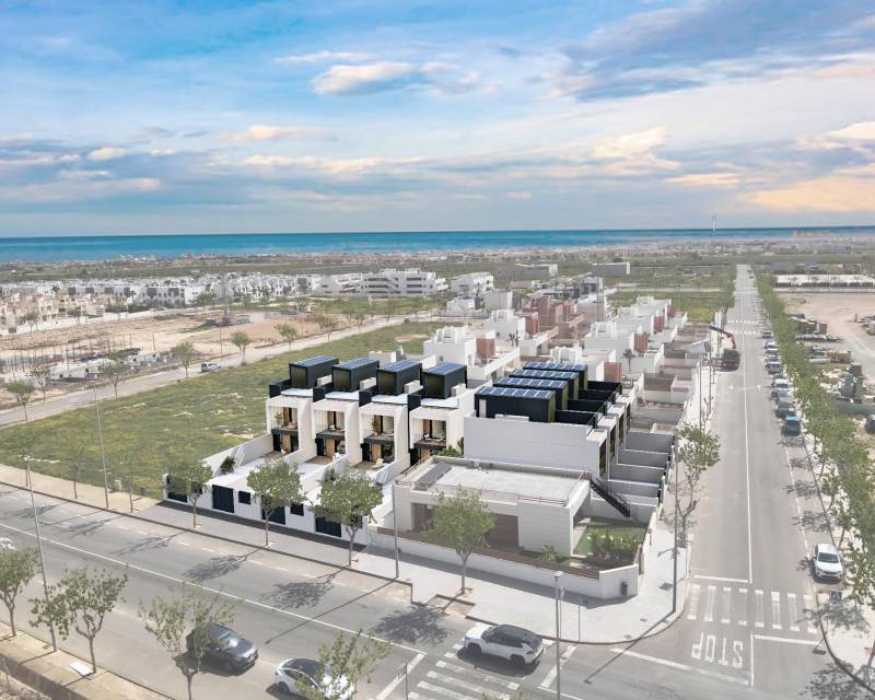 Adosados Sostenibles de Obra Nueva en Pilar de la Horadada, Costa Blanca Viviendas Modernas con Tecnología y Eficiencia Energética Descubre esta exclusiva promoción de obra nueva ubicada en Pilar de la Horadada, una de las zonas más atractivas de la Costa Blanca Sur. Este proyecto de viviendas adosadas combina diseño contemporáneo, sostenibilidad y tecnología para ofrecer un estilo de vida cómodo, eficiente y conectado. El residencial está compuesto por 8 villas adosadas de 3 dormitorios y 3 baños, todas con piscina privada, solárium con cocina de verano, y aparcamiento dentro de la parcela. Además, una de las viviendas se entrega completamente amueblada y lista para entrar a vivir, con 2 dormitorios y 2 baños. Espacios Interiores Elegantes y Funcionales Cada vivienda ha sido diseñada con atención al detalle: Cocina totalmente equipada con electrodomésticos Siemens o similar Baños con lavabos sobre encimera, grifería monomando y mamparas de vidrio de seguridad Preinstalación de aire acondicionado por conductos Sistema de aerotermia para agua caliente sanitaria Iluminación LED interior y exterior, incluyendo tiras decorativas en cocina, salón y baños Las viviendas también incorporan un sistema domótico para el control de persianas, iluminación exterior, climatización y piscina, así como instalación fotovoltaica con 6 paneles solares para autoconsumo. Exteriores Privados y Solárium con Cocina de Verano Disfruta de un amplio espacio exterior con: Piscina privada con ducha y focos LED Jardín con focos integrados Solárium con cocina exterior de aluminio, encimera y fregadero Todo pensado para que puedas disfrutar del clima mediterráneo durante todo el año. Pilar de la Horadada: Calidad de Vida a Pocos Minutos del Mar Este municipio ofrece una excelente infraestructura, una animada vida local y playas de bandera azul a solo 2 km. Además, dispone de carriles bici, rutas de senderismo y múltiples opciones deportivas. Distancias Clave: Playa de Torre de la Horadada: 2 km Campo de golf Lo Romero: 5 km Puerto deportivo Torre de la Horadada: 3 km Centro Comercial Zenia Boulevard: 15 km Aeropuerto de Murcia (Corvera): 40 km Aeropuerto de Alicante: 55 km Solicita Información y Agenda tu Visita Esta es tu oportunidad de adquirir una vivienda eficiente, moderna y cercana al mar en una de las zonas más demandadas de la Costa Blanca. Contáctanos hoy mismo para más información o para programar una visita personalizada.