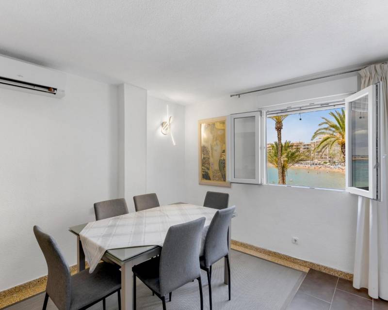 Descubre este fantástico apartamento situado en primera planta, con impresionantes vistas directas a la Playa del Cura. Una vivienda luminosa y espaciosa, ideal tanto como residencia habitual como para disfrutar de tus vacaciones junto al mar.~~La propiedad se compone de tres amplios dormitorios, perfectos para familias o para recibir invitados con total comodidad, y dos cuartos de baño completos. La zona de día está formada por un salón con dos grandes ventanas frontales, desde donde podrás disfrutar de unas vistas espectaculares al mar, además de una zona de comedor y una cocina funcional y bien distribuida.~~Uno de los grandes atractivos de esta vivienda es su terraza semitechada orientada al este, ideal para disfrutar del sol de la mañana mientras desayunas con el sonido del mar de fondo.~~La ubicación es inmejorable, a solo unos pasos de la arena, en una zona con todos los servicios a mano: restaurantes, tiendas, supermercados y transporte público.~~¡Una oportunidad única de vivir frente al mar en una de las playas más emblemáticas de Torrevieja!