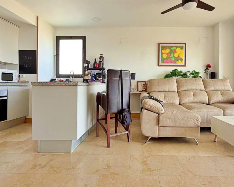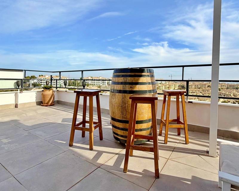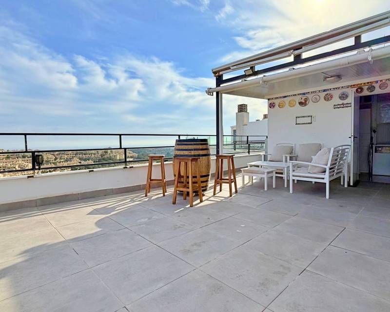 Este espectacular ático en la exclusiva zona de Lomas de Campoamor ofrece una combinación perfecta de lujo y confort con sus 87 m² de vivienda en excelente estado y un impresionante solárium privado de 52 m² equipado con cocina propia para disfrutar de cenas inolvidables frente al Mediterráneo mientras se contempla el atardecer en un entorno de máxima privacidad La propiedad cuenta con 2 amplios dormitorios con armarios empotrados y 2 baños completos con acabados de calidad destacando su luminosa orientación sur que garantiza sol durante todo el día además de una magnífica terraza acristalada que se encuentra totalmente unida al salón ampliando el espacio de vida y creando un ambiente diáfano y acogedor que permite deleitarse con las vistas despejadas al mar desde el interior de la vivienda en cualquier época del año Situada estratégicamente junto al prestigioso campo de golf y a tan solo 3 km de las paradisíacas playas de la zona la vivienda dispone de todas las comodidades modernas como sistema de aire acondicionado frío y calor junto con una plaza de garaje incluida en el precio Todo ello se ubica dentro de una urbanización privada de alto nivel que cuenta con servicios de seguridad permanente control de accesos y cámaras de vigilancia para su total tranquilidad y la de su familia representando una oportunidad única tanto para residencia habitual como para una inversión segura en una de las áreas más demandadas y cuidadas de la Costa Blanca donde el silencio y la exclusividad se fusionan con la cercanía a todos los servicios necesarios como centros comerciales restaurantes y zonas de ocio de primer nivel