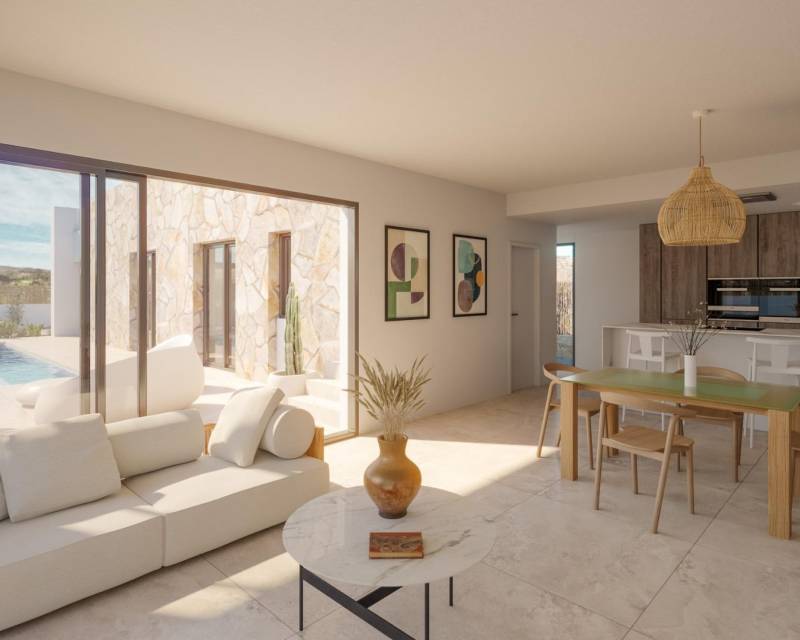 Villas de lujo de nueva construcción junto al campo de golf La Finca en Algorfa Villas exclusivas en un prestigioso entorno de golf Esta urbanización boutique de solo 8 villas independientes de lujo se encuentra en segunda línea del famoso complejo de golf La Finca en Algorfa. Situadas en una zona residencial tranquila y bien establecida, estas villas de nueva construcción ofrecen privacidad, comodidad y un estilo de vida mediterráneo excepcional rodeado de naturaleza y paisajes de golf. La ubicación es ideal para aquellos que buscan tranquilidad sin renunciar a la proximidad a los servicios, las opciones de ocio y las mejores playas de la Costa Blanca. Algorfa es una encantadora localidad española conocida por su ambiente relajado, sus restaurantes tradicionales y su proximidad a los mejores complejos de golf. La Finca Golf es uno de los complejos de golf más prestigiosos de la zona, con un campo de 18 hoyos, hotel, spa, instalaciones deportivas y restaurantes de calidad. Diseño moderno de una sola planta con carácter mediterráneo Todas las villas están diseñadas en una sola planta, lo que maximiza la comodidad y la funcionalidad. La distribución en forma de L separa claramente las zonas de estar y la cocina de los dormitorios, creando interiores luminosos y bien equilibrados. Los grandes ventanales permiten que la luz natural fluya por toda la casa y conectan a la perfección con las zonas exteriores. Cada villa ofrece 3 amplios dormitorios y 2 modernos cuartos de baño, construidos en generosas parcelas de más de 400 m². Los espacios exteriores incluyen una piscina privada, un jardín ajardinado con riego automático, aparcamiento en la parcela y un gran solárium privado ideal para disfrutar del sol durante todo el año. Características de alta calidad y eficiencia energética Estas villas combinan la inspiración tradicional mediterránea con la arquitectura contemporánea y la tecnología moderna. Las viviendas se entregan con sistema aerotérmico para agua caliente, preinstalación de aire acondicionado por conductos, sistema domótico, ventanas de aluminio con persianas eléctricas y cocinas totalmente equipadas con electrodomésticos. Los baños incluyen muebles, mamparas de ducha y calefacción por suelo radiante, lo que garantiza el confort y la calidad en cada detalle. Los estándares generales de construcción se centran en la eficiencia, el diseño y el valor a largo plazo. Ubicación estratégica cerca de playas y servicios La Finca Golf Resort ofrece un estilo de vida saludable y relajado con instalaciones deportivas y de ocio en las inmediaciones. Las playas de Guardamar del Segura se encuentran a unos 14 km. Torrevieja y Orihuela Costa, con sus centros comerciales y puertos deportivos, se encuentran a entre 15 y 18 km. El aeropuerto internacional de Alicante se encuentra a unos 35 km y ofrece excelentes conexiones con toda Europa. Hay varios otros campos de golf a menos de 10 km. Una vivienda ideal o una inversión en la Costa Blanca Estas lujosas villas representan una oportunidad única de adquirir una vivienda moderna en una de las zonas de golf más codiciadas del sur de la Costa Blanca. Perfectas como residencia permanente, vivienda vacacional o propiedad de inversión. Póngase en contacto con nosotros hoy mismo para obtener más información o concertar una visita privada a esta exclusiva promoción.