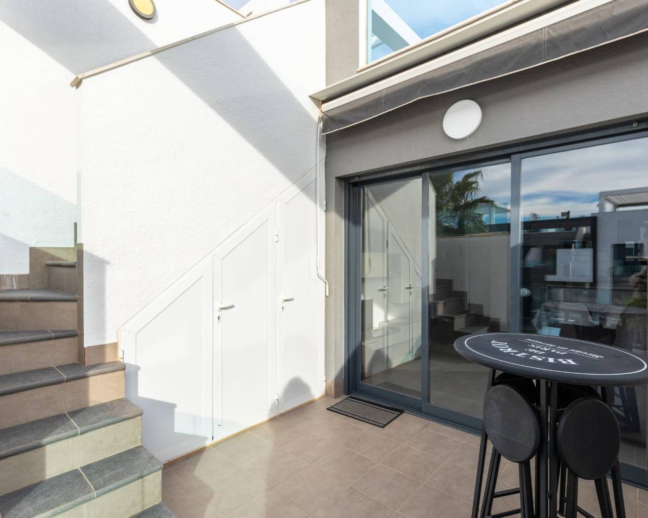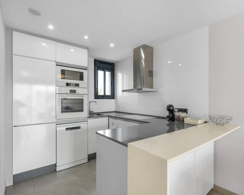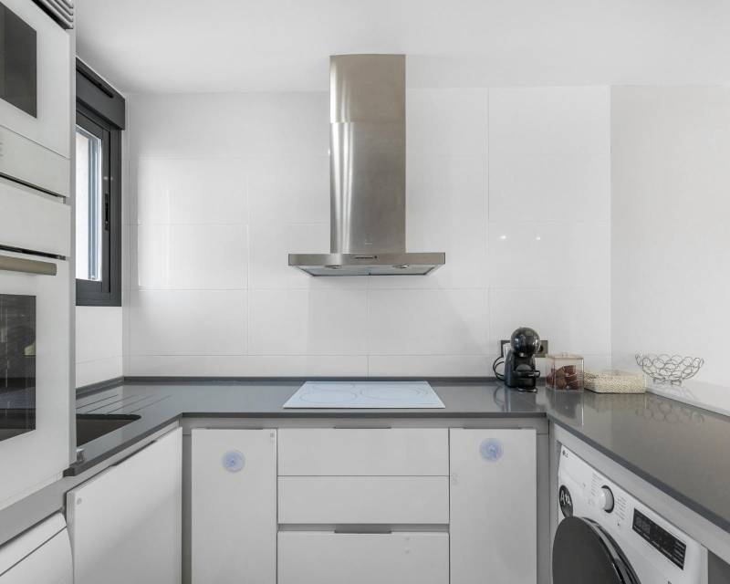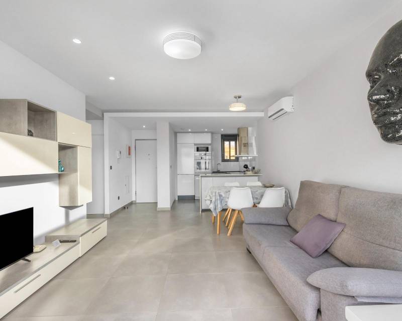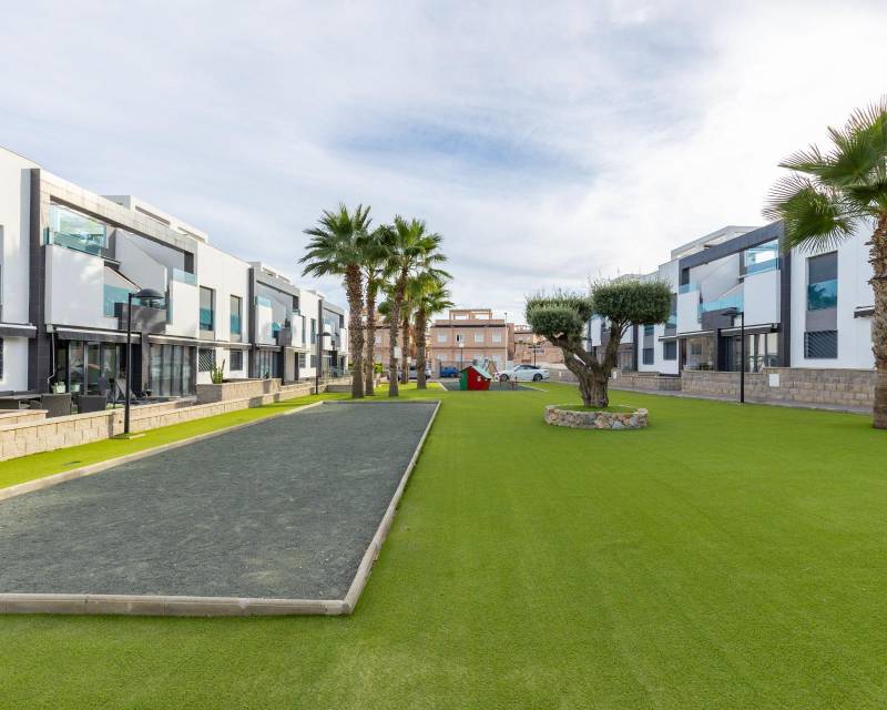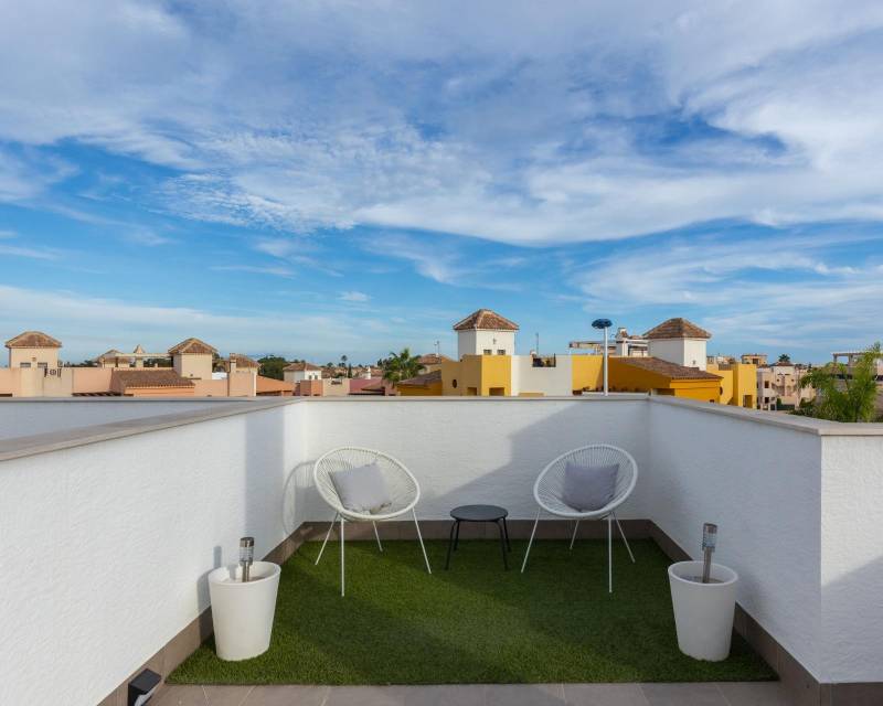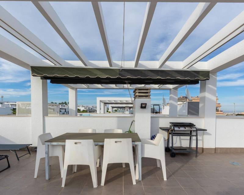 Te presentamos este magnífico bungalow en planta primera, ubicado en el prestigioso residencial Oasis Beach 7, en la zona de Punta Prima, Torrevieja (Alicante). Una vivienda ideal tanto para disfrutar todo el año como para obtener una excelente rentabilidad vacacional, ya que dispone de licencia turística vigente.~~La propiedad cuenta con 2 dormitorios y 2 baños completos, uno de ellos en suite, distribuidos de manera funcional y luminosa gracias a su orientación oeste. El amplio salón se abre a una terraza con preciosas vistas al cuidado entorno del residencial, que destaca por sus amplias zonas verdes y su espectacular piscina comunitaria.~~En la parte superior, disfrutarás de un solárium privado de 58 m2, perfecto para tomar el sol, relajarte o compartir momentos inolvidables con familia y amigos.~~Se vende totalmente amueblado y equipado, listo para entrar a vivir. Además, incluye una plaza de aparcamiento subterránea.~~La ubicación es inmejorable: a solo 1.500 metros de la playa, y a 5 minutos en coche del centro comercial Zenia Boulevard, con una amplia oferta de ocio, restauración y tiendas.~~Si buscas confort, estilo y una inversión segura en la Costa Blanca, esta vivienda lo tiene todo.~~“El precio del inmueble no incluye, ni los gastos de notaría y registro de la propiedad (que están sujetos a aranceles y varían dependiendo del precio de escrituración), ni los impuestos (que en la Comunitat Valenciana varían dependiendo del precio del inmueble y de las características personales del comprador)