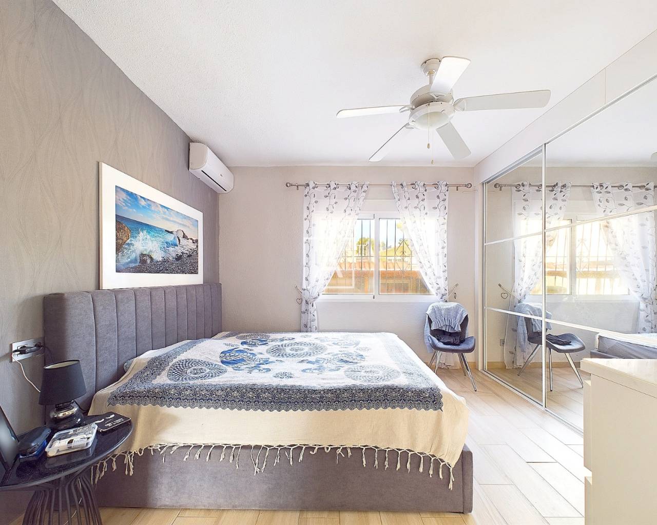 La suite principale est une retraite en soi, située à l'arrière de la villa et dotée d'armoires encastrées avec miroir et d'une salle de bains privative. Les deux autres chambres doubles sont accessibles depuis un couloir à côté de la salle à manger, toutes deux dotées d'armoires encastrées et l'une d'elles étant actuellement utilisée comme bureau. Le couloir mène directement à la piscine, offrant une transition parfaite entre la vie intérieure et extérieure. Toutes les chambres et le salon bénéficient de la climatisation. Les stores du salon et de la salle à manger sont électriques.