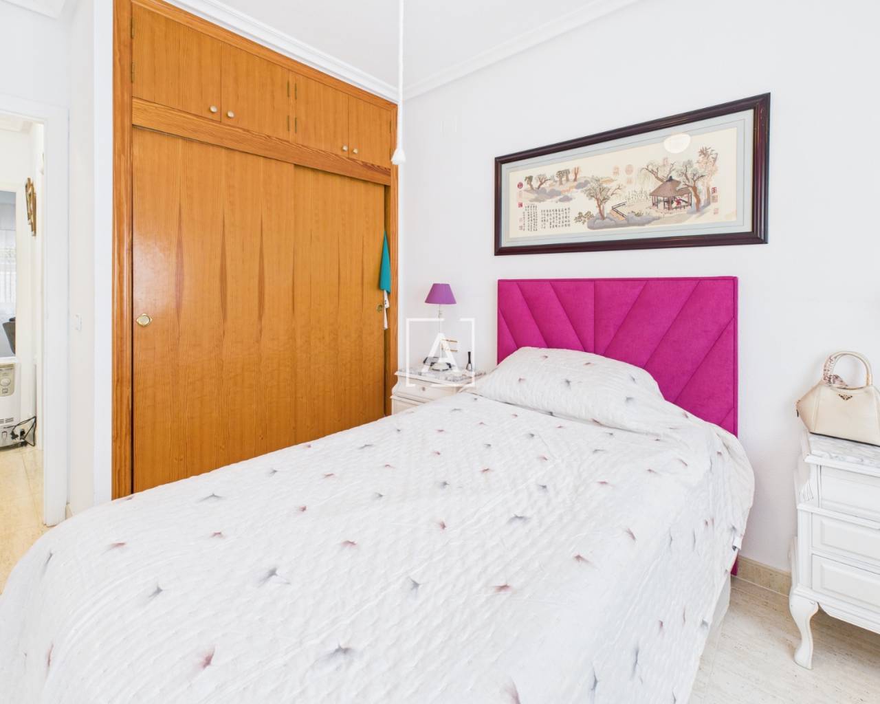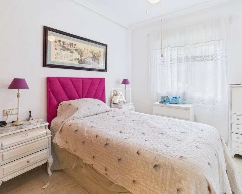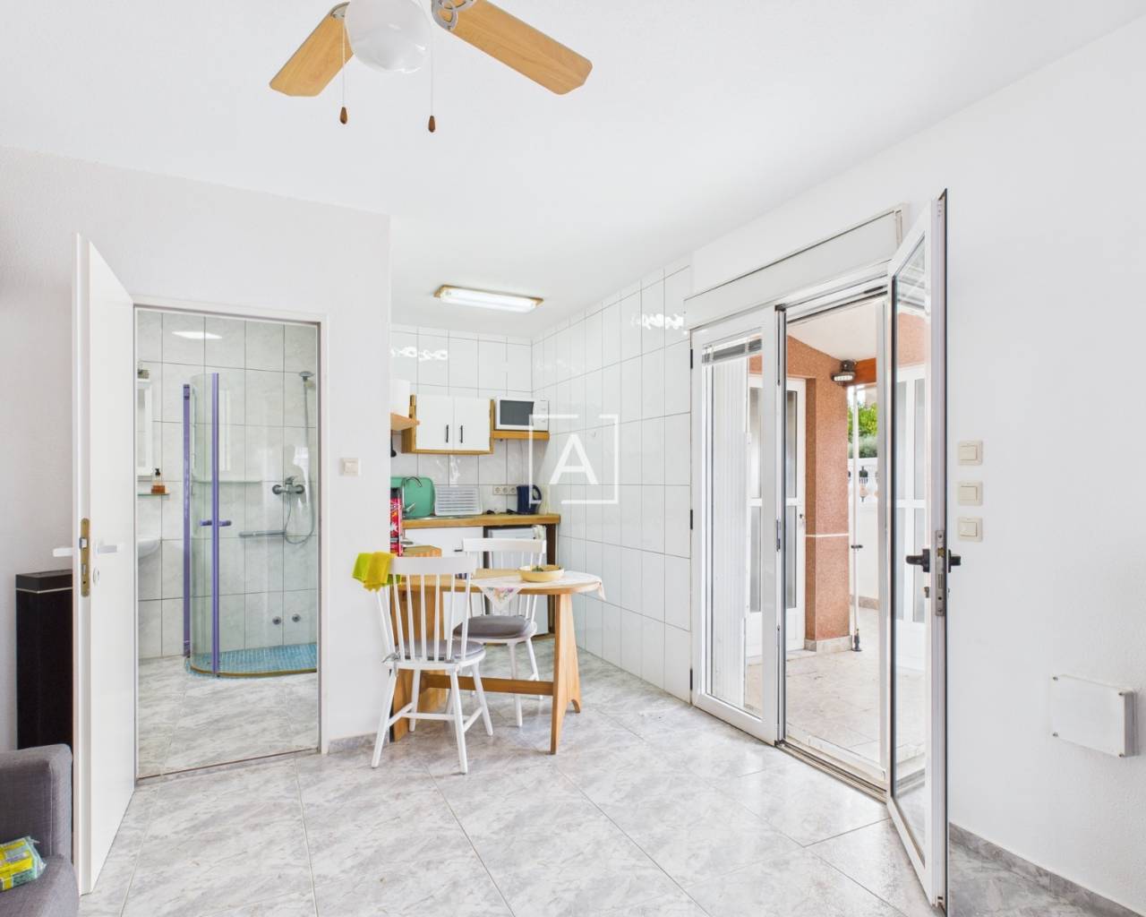 On accède à la propriété par un porche spacieux et fermé, équipé de stores, qui mène à un salon lumineux et à une cuisine américaine. Les deux chambres, accessibles depuis le salon, disposent chacune d'une armoire encastrée. La salle de bains moderne a été récemment rénovée et comprend une douche à l'italienne.