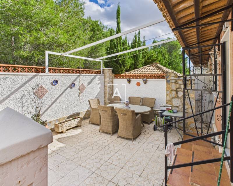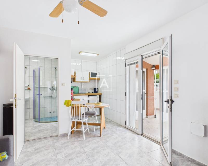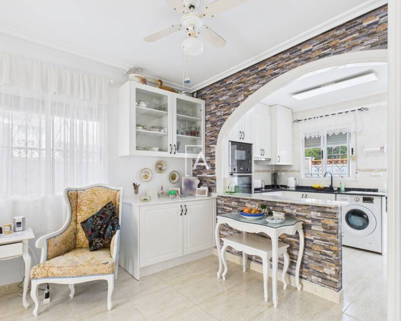 La cuisine offre de nombreux rangements, un bar et un accès direct au jardin arrière, idéal pour les repas en plein air et la détente. Un escalier extérieur mène à un appartement indépendant comprenant un séjour/chambre ouvert, une cuisine et une salle de bains – parfait pour accueillir des invités ou générer un revenu locatif. À l'étage, vous trouverez également un cellier et une véranda exposée plein sud.