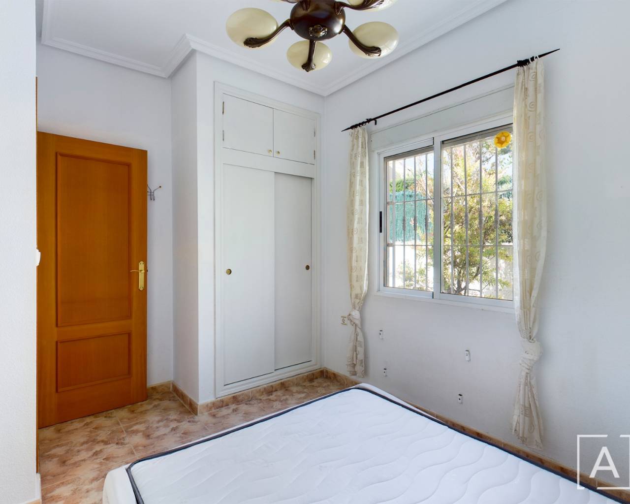 We zijn blij om deze charmante villa met 2 slaapkamers en 1 badkamer te koop aan te bieden, gelegen in het centrum van Pinar de Campoverde. De toegang is via een voetgangerspoort of dubbele poorten die off-road parking voor 1 auto mogelijk maken. Een paar treden leiden u naar een overdekt terras met toegang tot de Villa. U komt direct binnen in de woonkamer, de open keuken is aan de rechterkant evenals de hal die leidt naar de 2 slaapkamers, beide met inbouwkasten en naar de badkamer met douche / Buiten, een trap leidt naar het daksolarium. In de woonkamer is een A/C unit geplaatst.