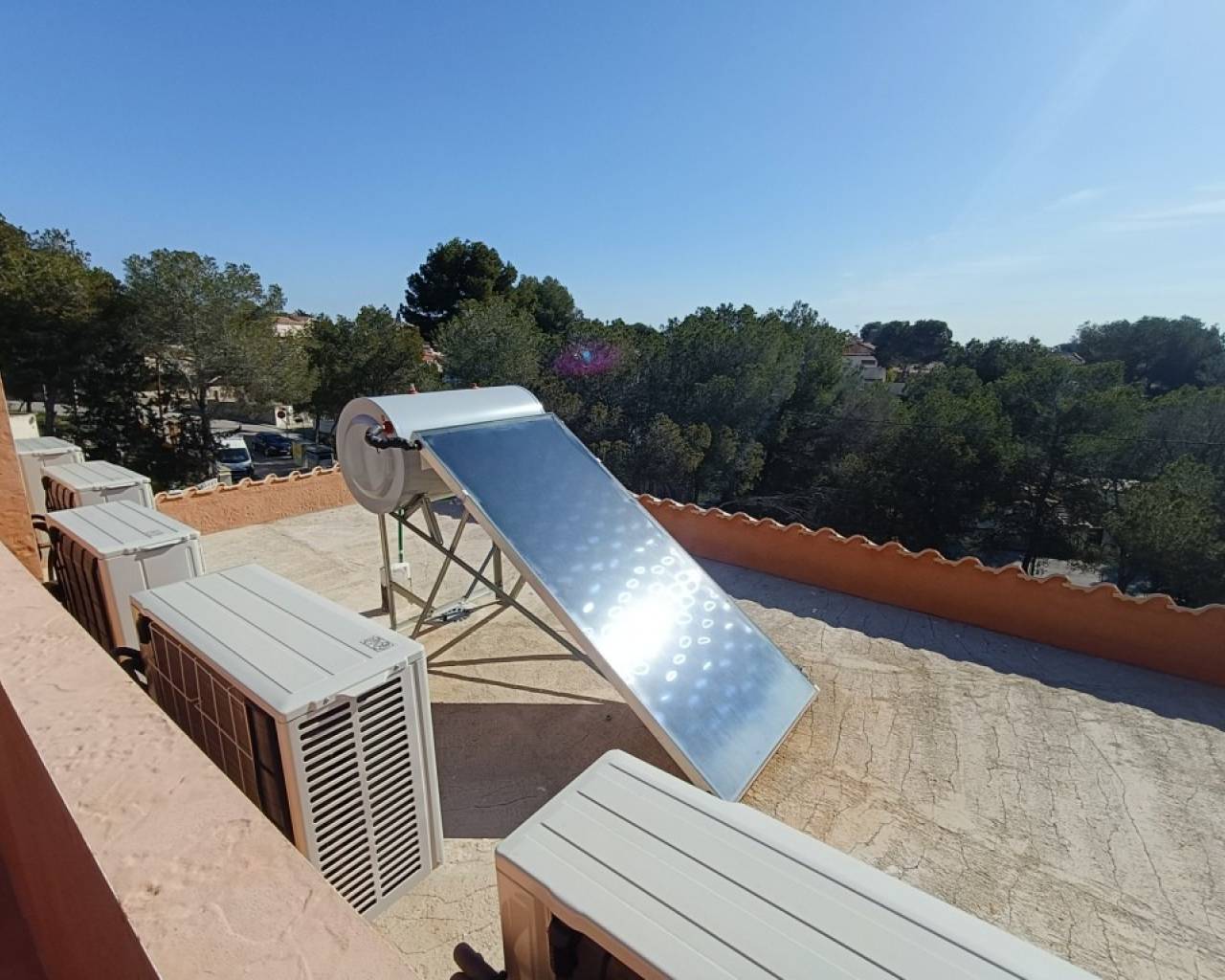 De bovenverdieping van 78.33 m² herbergt drie slaapkamers, waarvan één met een eigen vestiaire en ensuite badkamer. Daarnaast is er nog een aparte badkamer. Via de gang leidt een buitentrap naar het solarium. Op het platte dak bevinden zich de airco-units en een zonneboiler. Vanaf het solarium geniet je van een prachtig open uitzicht.