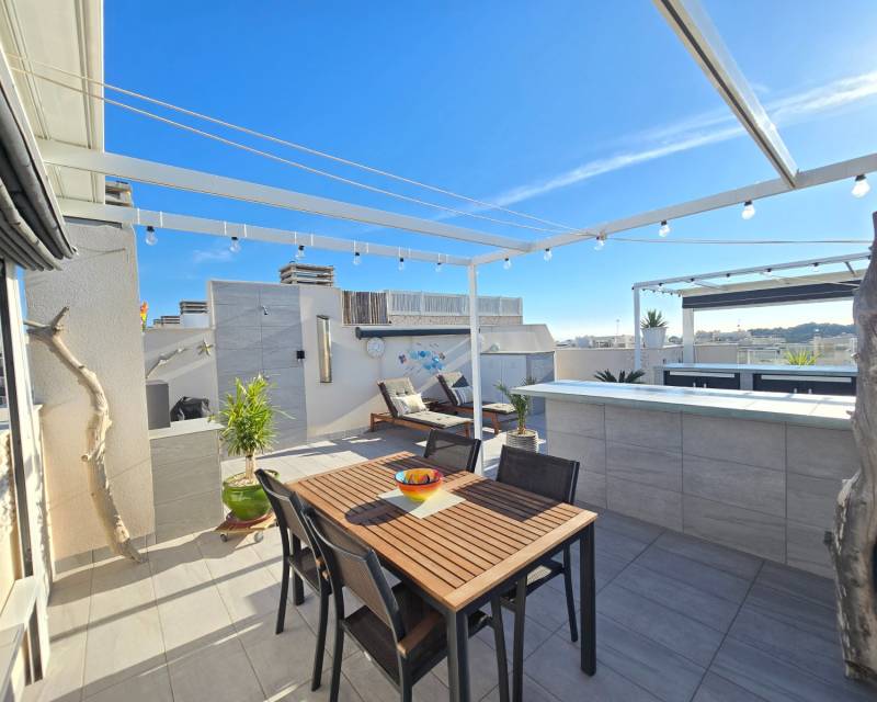 Ontdek dit uitzonderlijke zuidgerichte penthouse met adembenemend zee- en bergzicht, gelegen in een jonge en perfect onderhouden urbanisatie nabij de Golf van Villamartin. Het absolute pronkstuk is het ruime solarium, uitgerust met een volledig ingerichte buitenkeuken, een eet- en loungehoek en zonneterrassen waar je de hele dag door kunt genieten van licht, rust en panoramische vergezichten. Binnen verwelkomt een lichte en ruime leefruimte met open keuken je in een moderne, uitnodigende sfeer. Het penthouse beschikt over twee slaapkamers en twee badkamers, waarvan één en-suite, ontworpen met hoogwaardige materialen en een praktische indeling. Extra comfort vind je in de ondergrondse parkeerplaats (met pre installatie voor elektrische wagen) en twee afzonderlijke bergingen, ideaal voor extra opslag. De urbanisatie zelf biedt een waaier aan faciliteiten: twee zwembaden, een jacuzzi, een buiten gym, een petanquebaan, speeltuin voor de aller kleinste en prachtig aangelegde gemeenschappelijke zones. Alles ligt bovendien op wandelafstand van bars, restaurants en andere voorzieningen, waardoor ontspanning en gemak steeds binnen handbereik zijn. Ter extra’s heeft de woning zonneluifels, wind schermen, water ontkalker + OSMOSE en wordt deze volledig gemeubeld verkocht! Dit penthouse combineert luxueus wonen, comfort en topligging aan de Costa Blanca — perfect als permanente woonst, vakantieverblijf of investering. Twijfel niet een boek snel een bezichtiging! Suma: 249 euro/jaar. Gemeenschapskosten: 920 euro/jaar.