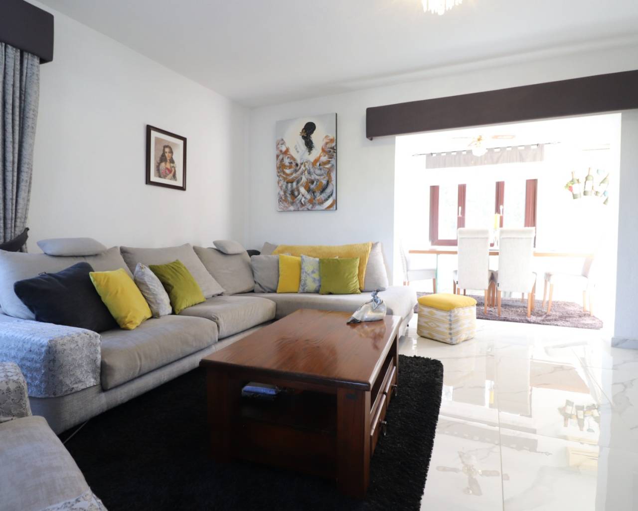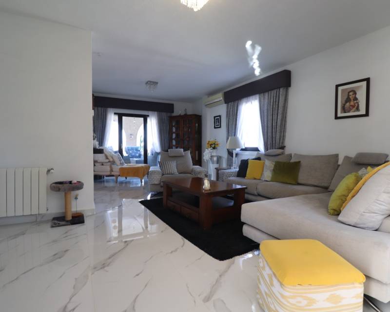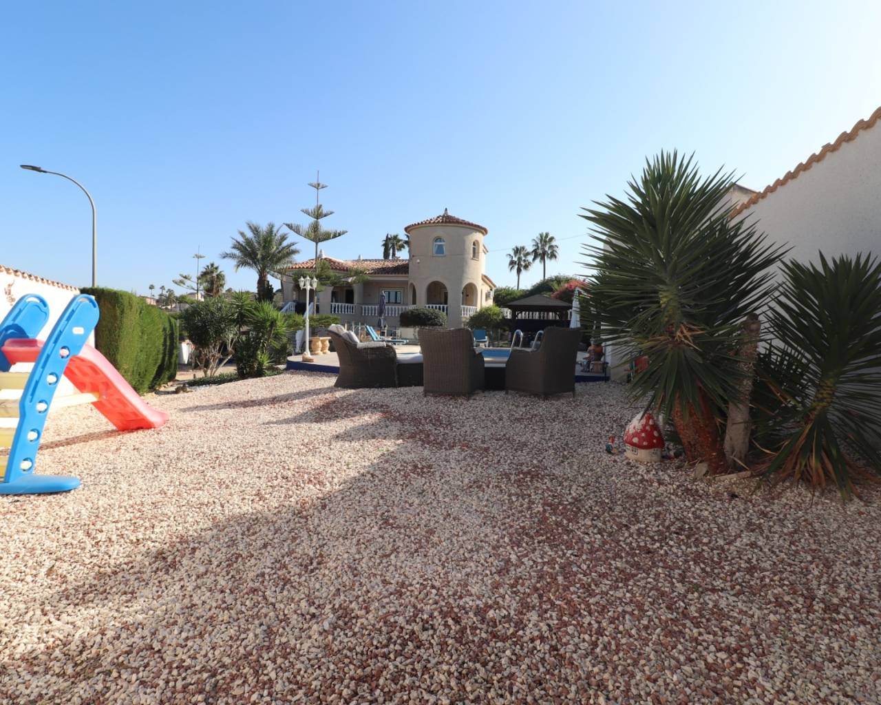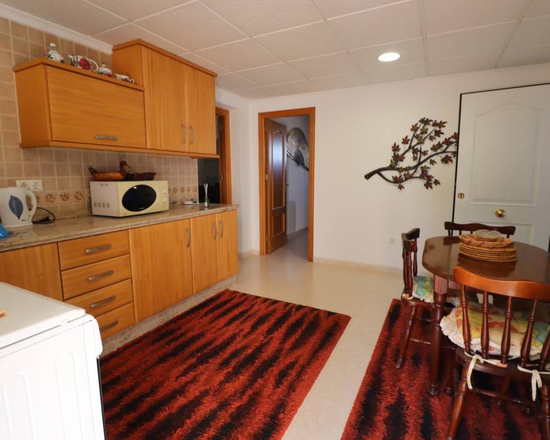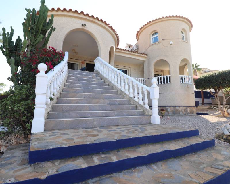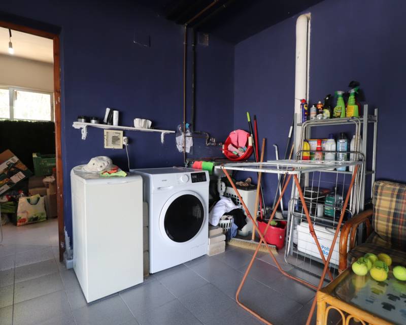 Deze opmerkelijke, op het westen gelegen, hoekvilla met vijf slaapkamers in Lomas de La Juliana ligt op een prominente locatie aan de Costa Blanca Zuid, onder het gebied van Almoradi, maar dichter bij en gunstig gelegen tussen het dorp Algorfa en het prestigieuze La Finca Golf, Hotel & Spa Resort. Met een tennisclub net bovenaan de weg en voorzieningen van het belangrijkste merk op slechts een paar minuten rijden, liggen de stranden met blauwe vlag van Guardamar del Segura ook op slechts 15 minuten afstand! Dit ongelooflijke pand beslaat een indrukwekkende bebouwde oppervlakte van 375 m² op een prachtig perceel van 1.149 m² en biedt een panoramisch uitzicht op het platteland, citrusboomgaarden, bergen en zonsondergangen. De hoofdvilla is volledig geüpdatet en gemoderniseerd, met behoud van karakter en charme, en omvat drie slaapkamers en drie badkamers. Bij binnenkomst leidt de hal naar een open, volledig ingerichte keuken met een ontbijtbar, een ruime woonkamer voor het hele gezin met een gezellige houtkachel en directe toegang tot het grote overdekte terras aan de voorzijde, perfect om te genieten van het adembenemende uitzicht. Er is ook een eetkamer met toegang tot de achtertuin, een doucheruimte en twee slaapkamers op de begane grond, waarvan één met een eigen badkamer en douche. De hoofdslaapkamer op de bovenverdieping heeft een inloopkast, een kaptafel en een eigen badkamer met douche. De aparte annex, gelegen in de onderbouw, biedt twee extra slaapkamers en een badkamer, toegankelijk via de dubbele garage of onafhankelijk van de achterkant. Deze ruimte omvat een aparte keuken en eetkamer, een grote slaapkamer met een woonkamer en kantoor, plus een eigen douche. De garage wordt momenteel gebruikt als een speelkamer met een pooltafel, pingpongtafel, bijkeuken en een aangrenzende berging. Buiten beschikt de grind- en betegelde tuin over een bijgewerkt privézwembad, een barbecueplek, een kleine putting green en voldoende ruimte om buiten te eten en te entertainen. Extra hoogtepunten zijn een carport, off-road parkeren, centrale verwarming op olie, overal airconditioning, plafondventilatoren, inbouwkasten in de hoofdvilla en dubbele ingangen vanaf verschillende wegen. Dit is een buitengewone kans om een aanzienlijk en veelzijdig pand te bezitten met een fantastisch uitzicht op een benijdenswaardige locatie!