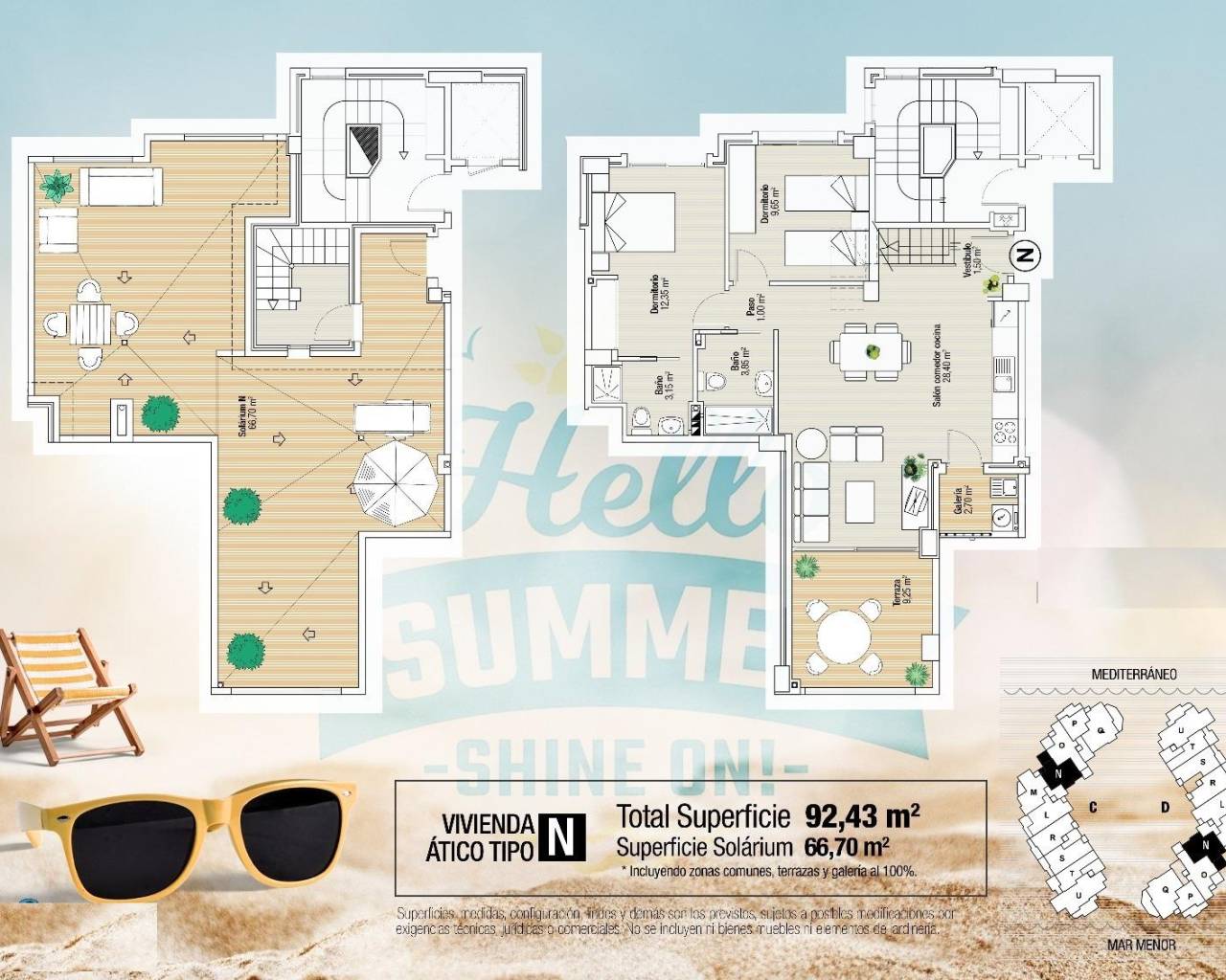 NEW BUILD RESIDENTIAL COMPLEX IN LA MANGA New Build residential complex is located in a unique and special place, between two seas, in a privileged location and with all the services you may need at your fingertips in the Region of Murcia, beautiful coastline with the beaches of transparent and shallow waters. At this residential complex apartments have been designed to make the most of every last corner of the property, as well as the the choice of materials and the design of the homes. Live a world of sensations and pleasurable moments with all the services and activities that you desire at your fingertips. Installations - Air conditioning: Air conditioning system by ducts, for hot and cold, throughout the house (except in distributors and bathrooms) and operated by central console. Electrical appliances: Stainless steel oven. Black ceramic hob with three burners. Stainless steel refrigerator. Extractor hood integrated in furniture. Integrated dishwasher. Common areas: Access to the building via white PVC door and double glazing with air chamber. Entrance halls and stair treads specially decorated with national marble. White thermo-lacquered aluminium handrail on interior staircases. Lighting by presence detection in basement and interior common areas. White motorised sectional garage access door. Stainless steel urbanisation railings. Video door entry system. Satellite dish with European channels. Swimming pool with landscaped solarium. La Manga del Mar Menor is a natural strip of land surrounded by two seas, the Mar Menor and the Mediterranean Sea. To this rarity you can add the multiple leisure and free time options, restaurants, supermarkets, medical censers, pharmacies, nautical sports censers, golf courses. La Manga is located on the north coast of the Costa Calida and is a popular holiday destination for tourists. The narrow land strip separating the warm lagoon and the colder sea has a unique microclimate. It's one of the most exotic areas in Spain. Corvera airport is about 1 hour drive away and Alicante airport about 2 hours away. 607