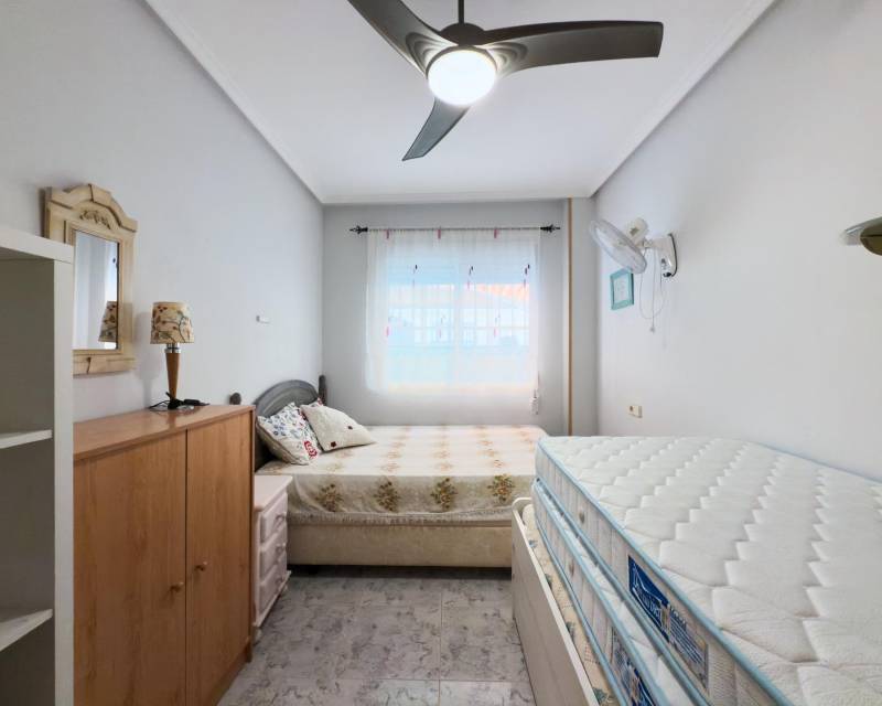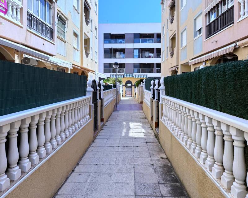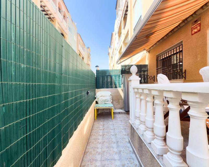 Looking for comfort, location, and extra outdoor space? This charming ground floor apartment has it all. Located in a gated residential complex with a communal pool, and just 100 meters from La Mata beach, you can enjoy the Mediterranean lifestyle with all the conveniences.~~The property features two double bedrooms, a full bathroom with bathtub, and a separate kitchen that opens directly onto a spacious private patio of approximately 15 m2. This outdoor area provides excellent ventilation and natural light, and is perfect for relaxing, dining, or extra storage.~~It is sold unfurnished, allowing you to decorate and personalize it to your taste. The home is equipped with wall-mounted split air conditioning and a retractable awning to keep cool on hot summer days.~~An ideal opportunity whether you’re looking for a year-round residence or a holiday retreat by the sea. Come and see it – you’ll fall in love with its location and potential!