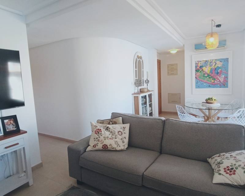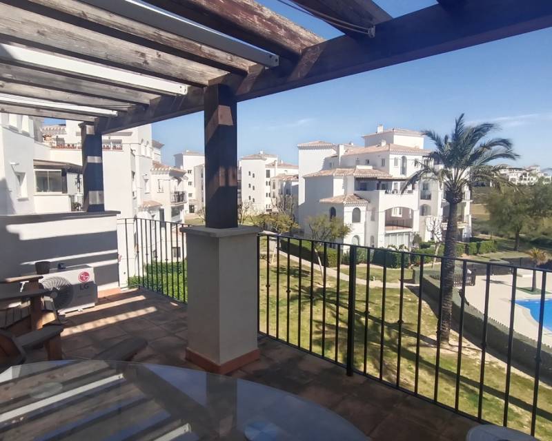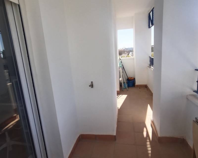 This light, bright and exceptionally spacious apartment on Calle Adriático truly has it all — spectacular golf and lake views, dual terraces, lift access, underground parking, and an enviable position just 200 metres to the town centre restaurant and supermarket.The apartment opens into a generous living–dining area featuring an attractive curved wall design that creates a defined dining space. The room is furnished with a glass dining table and chairs, comfortable sofa, auxiliary seating, and storage units, offering a welcoming and practical layout.Large patio doors lead directly onto the spacious east-facing terrace, where you can enjoy spectacular open views across the swimming pool, golf course and lake. Perfect for morning coffee and sunrise views, this terrace benefits from one of the resort’s most sought-after orientations while remaining conveniently close to the bar and amenities.To the left of the entrance hallway is the impressively large, square kitchen — fully fitted with ample cabinetry and complete with fridge-freezer, washing machine, dishwasher, ceramic hob, oven and extractor fan. A kitchen window frames beautiful golf course views, making it both bright and enjoyable to work in.The curved wall in the living room leads through to an inner hallway giving access to the sleeping accommodation.On the left is a spacious family bathroom, fitted with shower, WC and vanity unit.There are two bedrooms:Master bedroom with double bed, fitted wardrobes, bedside cabinets and air conditioningSecond bedroom currently arranged with a single sofa bed and air conditioningBoth bedrooms benefit from patio doors opening onto a second west-facing terrace, enjoying mountain views and evening sunshine — ideal for relaxing at the end of the day. With doors open to both east and west terraces, the apartment benefits from excellent natural airflow and a wonderful cross-breeze.The property is sold fully furnished as seen and is located in a prestigious building with lift access. An underground parking space is included in the sale.Set within the beautiful Hacienda Riquelme Golf Resort, residents enjoy:19 communal swimming poolsLandscaped gardens24-hour securityGolf course and driving rangeSports facilitiesOn-site supermarket and restaurantThe charming village of Sucina is just a short drive away, with the coast and airport approximately 20 minutes by car.This is an ideal lock-up-and-leave holiday home, yet spacious enough for comfortable permanent living. Early viewing is highly recommended.