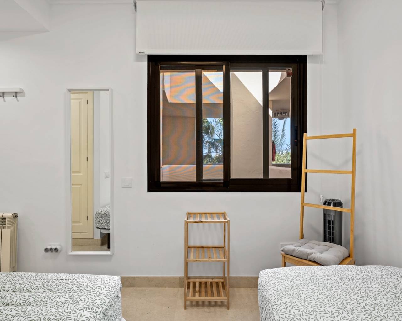 This stylish property is completely ready for immediate use. Thanks to its favorable south-facing orientation, you can enjoy sunshine on the terrace all day long, well into the evening, with beautiful views of the landscaped surroundings. A staircase on the terrace leads to the spacious private rooftop terrace, where you can enjoy stunning panoramic views. The apartment features two comfortable bedrooms and two modern bathrooms, one of which is en-suite with a walk-in shower. The property is offered fully furnished and ready to move in. The open kitchen has been recently completely renovated and is equipped with high-quality Bosch appliances. The entire home has been tastefully finished with great attention to detail and high-quality materials. Additional comfort is provided by the presence of an elevator, a private parking space in the underground secure garage, as well as a spacious storage room. Roda Golf & Beach Resort is a gated and secure community with 24/7 security, where peace, safety, and comfort are key. Phase 1 includes five swimming pools, beautifully maintained gardens, and a शानदार 18-hole golf course. The charming clubhouse, within walking distance, forms the vibrant heart of the resort. The location is ideal: just 500 meters from the authentic village of Roda with a small supermarket, cozy restaurants, and a hairdresser. Larger supermarkets are located 1.5 km away, and the extensive beaches of Los Alcázares are just 3 km away.
