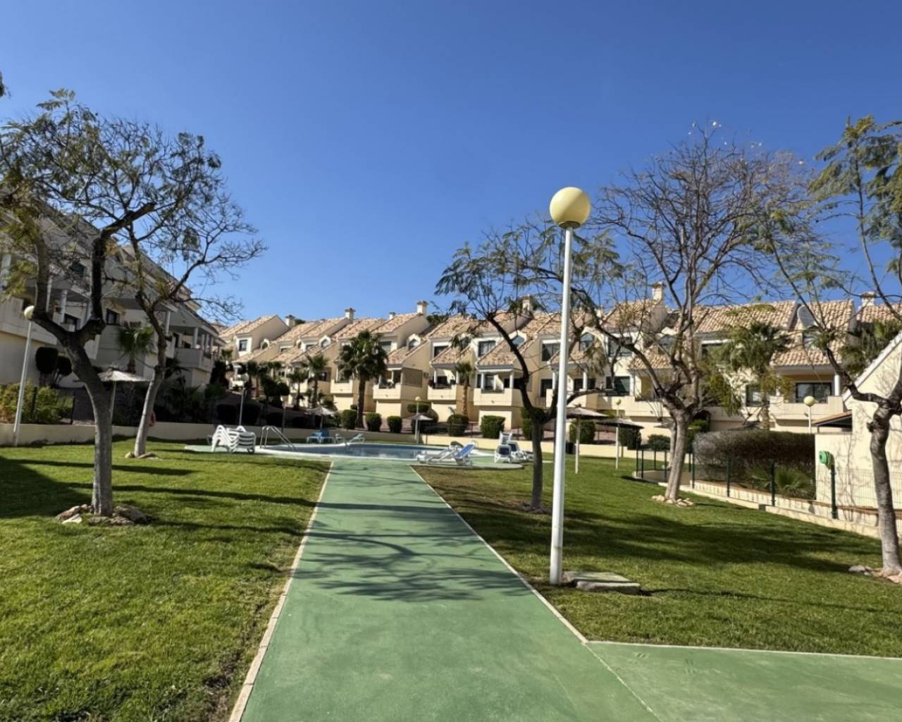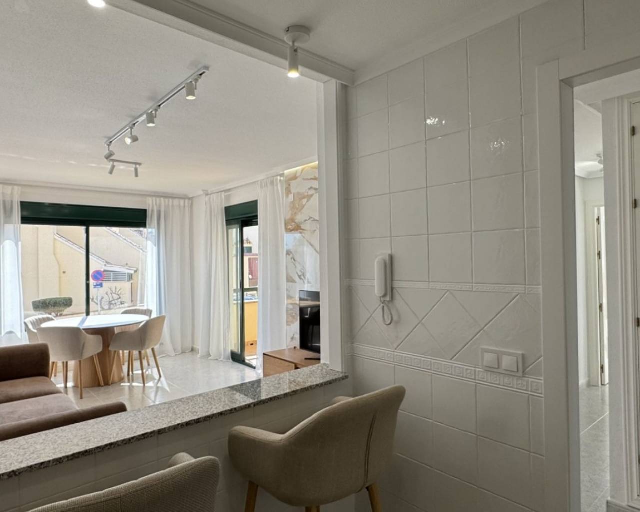 Located in the prestigious golf area of Lomas de Campoamor, this beautifully renovated south-facing apartment offers the perfect combination of modern design, comfort, and lifestyle. Positioned on an elevated ground floor with open views, the property enjoys plenty of natural light throughout the day and a high level of privacy. The apartment has a constructed area of 83 m² and features 2 spacious bedrooms and 2 modern bathrooms, including a stylish walk-in shower. The entire property has been fully renovated to a high standard, using premium materials such as large-format porcelain tiles and natural stone elements. The bright living space is complemented by designer furniture and a fully equipped modern kitchen with induction hob and quality appliances. Being fully exterior-facing, the apartment benefits from excellent light and ventilation, with no internal patios. Additional features include inverter air conditioning, central gas heating system, dual boiler, good sound insulation, concealed ambient LED lighting, and an integrated security system. The building also offers lift access for convenience. The property is sold fully equipped, including washing machine with direct drive, Smart TV, alarm system, mirrors, freestanding wardrobes, large beds, and designer furnishings, making it completely turnkey. Set within a well-maintained community, residents enjoy access to landscaped green areas and a communal swimming pool, all within walking distance to several renowned golf courses. This is a rare opportunity to acquire a fully renovated, high-quality apartment in one of the most sought-after golf areas on the Costa Blanca, ideal as a permanent residence, holiday home, or investment.