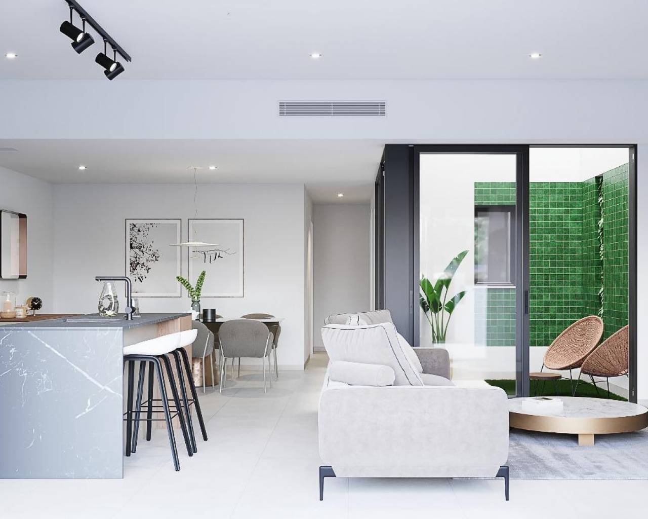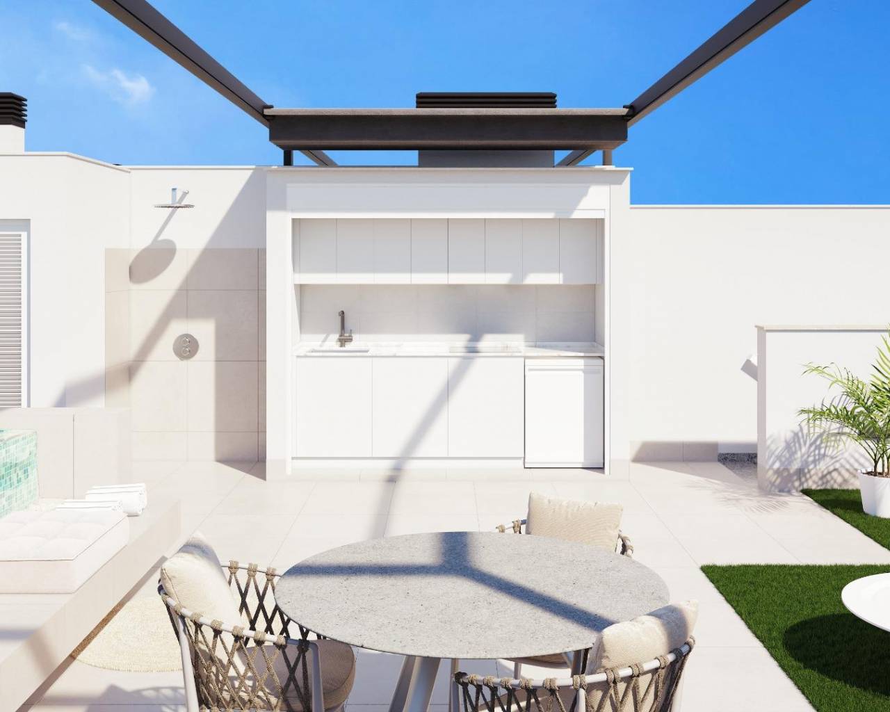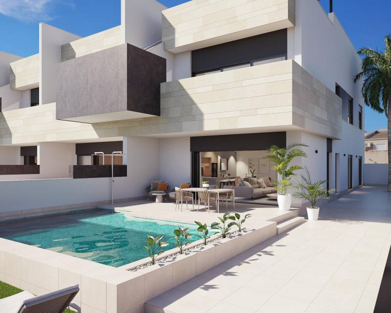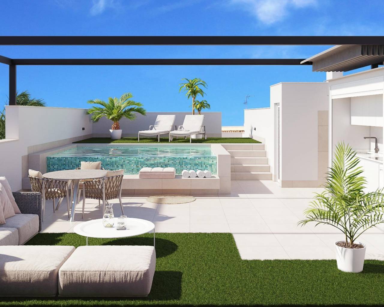 RESIDENCIAL DE OBRA NUEVA DE BUNGALOWS EN PILAR DE LA HORADADA Residencial exclusivo de obra nueva de modernos bungalow apartamentos en Pilar de la Horadada. Las unidades de planta baja tienen terrazas delanteras y traseras con jardín privado, piscina y plaza de aparcamiento. Las viviendas de planta alta tienen un gran solarium en la azotea con piscina infinita, aseo, cocina exterior, césped artificial y una pérgola, todo incluido en el precio del apartamento. Todos los bungalows tienen 3 dormitorios, 2 baños, uno de los cuales pertenece al dormitorio principal, amplia cocina americana / salón con una cocina totalmente equipada con todos los electrodomésticos y un enfriador de vino de la marca Bosch / Siemens, también un purificador de agua en la cocina. En el dormitorio principal tiene grandes armarios con puertas de cristal e iluminación interior. Los baños vienen completamente amueblados y con suelo radiante. . En el salón tiene grandes ventanas correderas hacia la terraza que se pueden empujar completamente en la pared, creando un espacio increíble en el apartamento. Todo el apartamento tiene aire acondicionado y persianas eléctricas en todas las ventanas. Todos los materiales son de la más alta calidad y el proyecto tiene un diseño único y exclusivo. Todas las viviendas disponen de plaza de aparcamiento privada. Pilar de la Horadada es un típico pueblo español en la parte más meridional de la Costa Blanca. La gran calle principal tiene supermercados, muchas tiendas, restaurantes y bares y algunas plazas encantadoras. Las hermosas playas de Torre de la Horadada y Mil Palmeras con paseo marítimo de arena fina está a sólo 5 minutos. Los aeropuertos de Corvera (Murcia) y Alicante están respectivamente a 40 y 55 minutos.