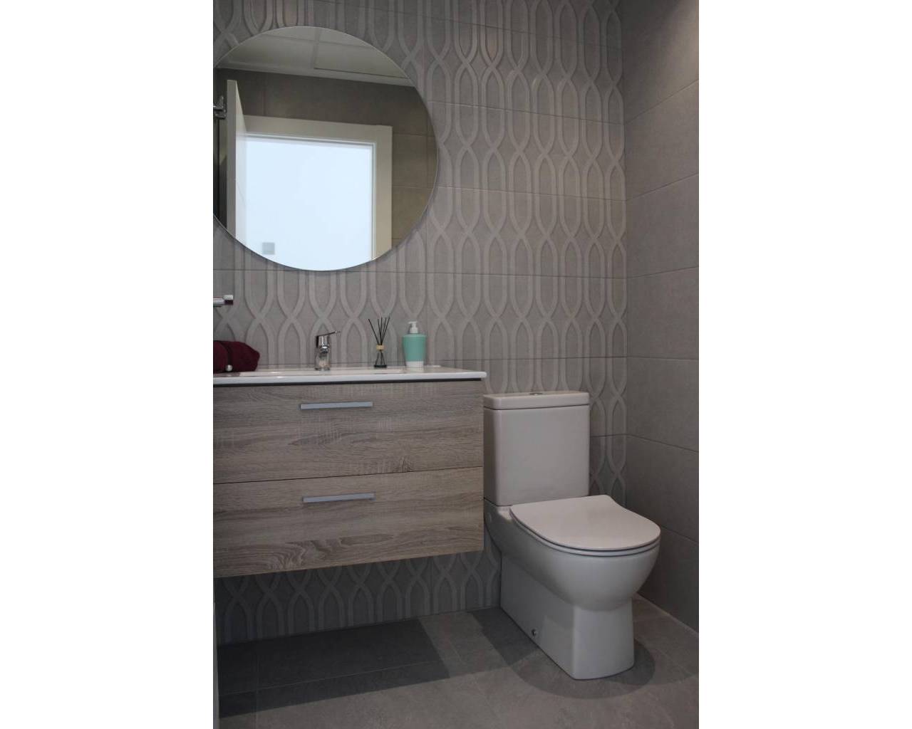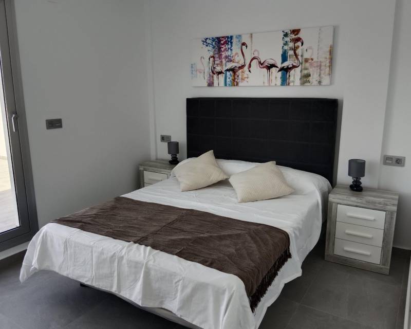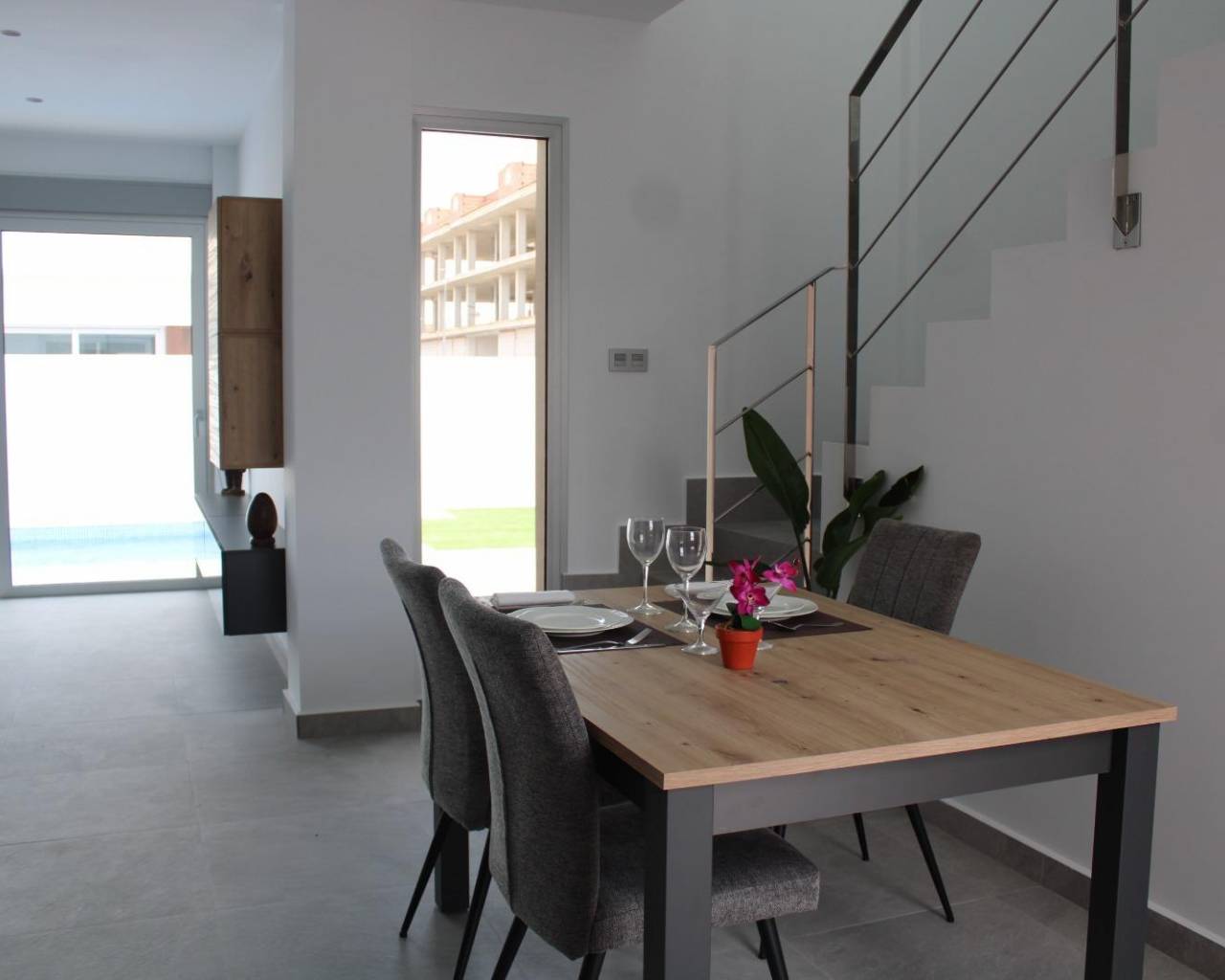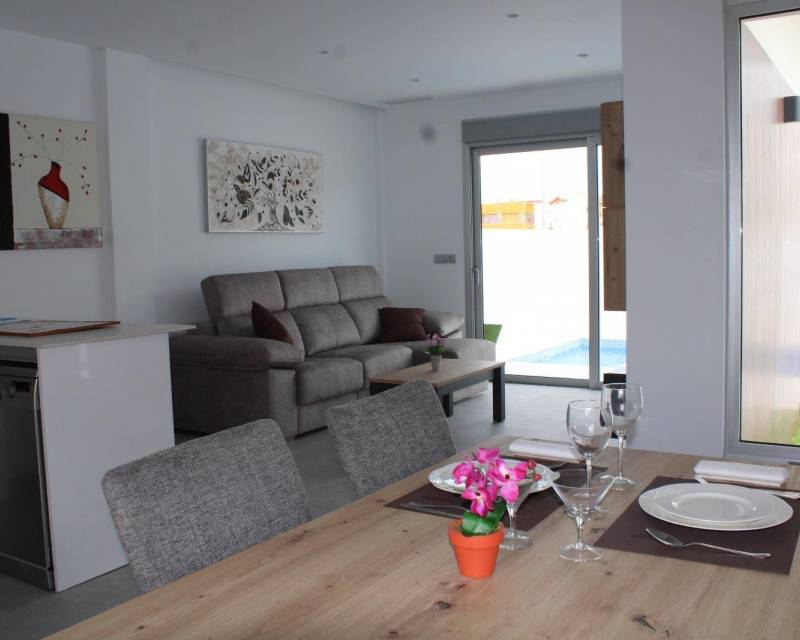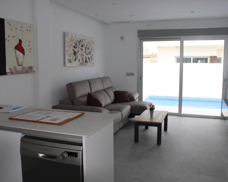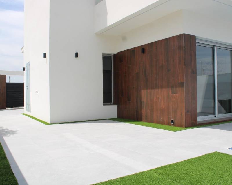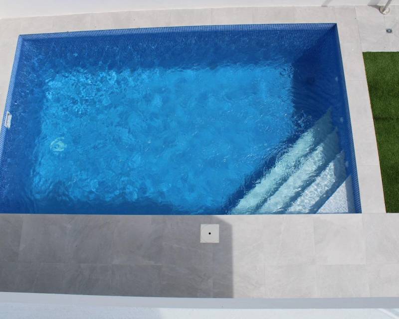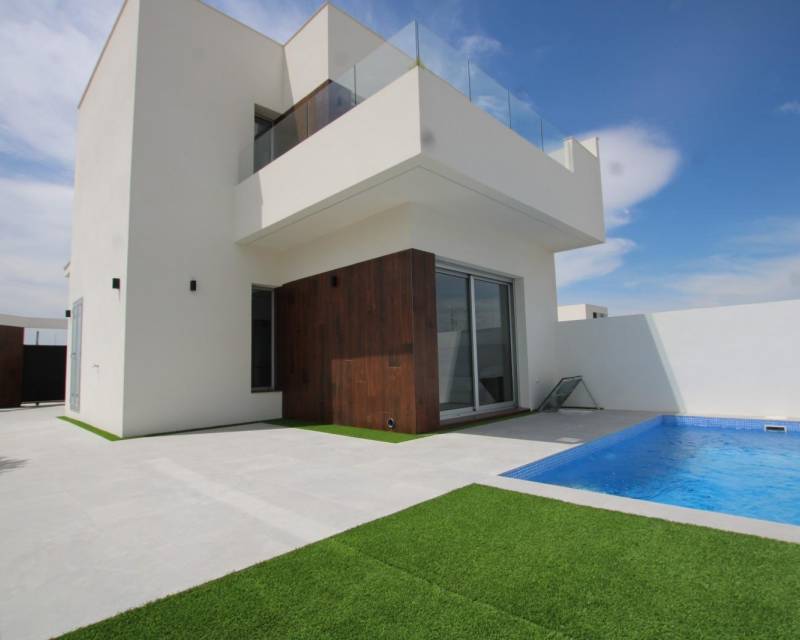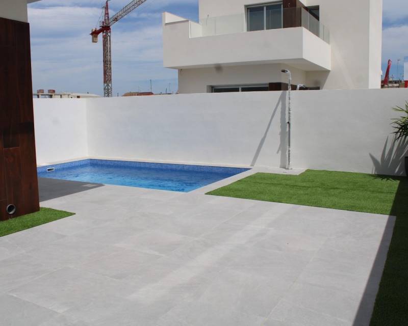 VILLAS DE OBRA NUEVA EN SAN FULGENCIO Villas independientes de nueva construcción situados en la localidad de San Fulgencio. Villas de 130 m2 construidos en parcelas de 180 m2, dispone de 3 dormitorios, 3 baños completos, 1 aseo, cocina americana con el salón-comedor, armarios empotrados, terrazas, solarium privado, jardín con piscina privada y plaza de parking. Se encuentra a 300 metros del centro del pueblo con todos los servicios, tiendas, restaurantes, ayuntamiento, banco. El pueblo de San Fulgencio está situado a unos 30 minutos del aeropuerto de Alicante-Elche, a 6km del campo de golf más cercano y a sólo 7km de la playa más cercana.