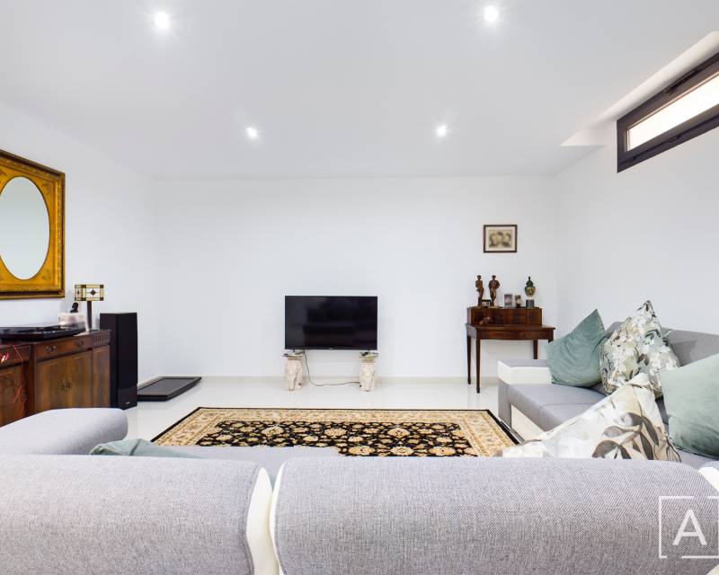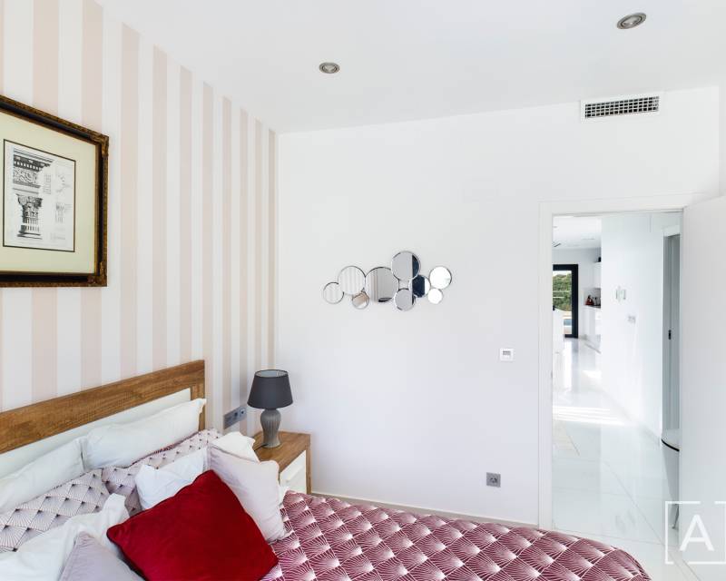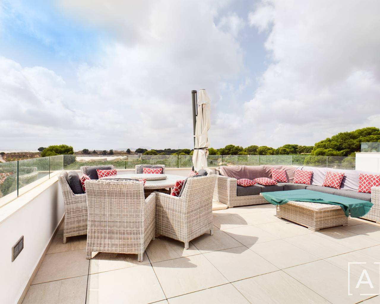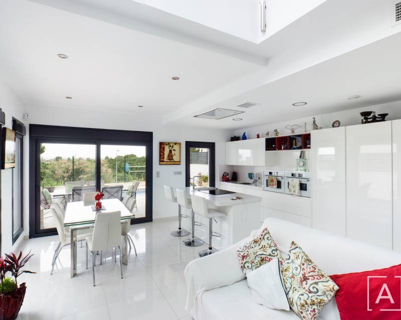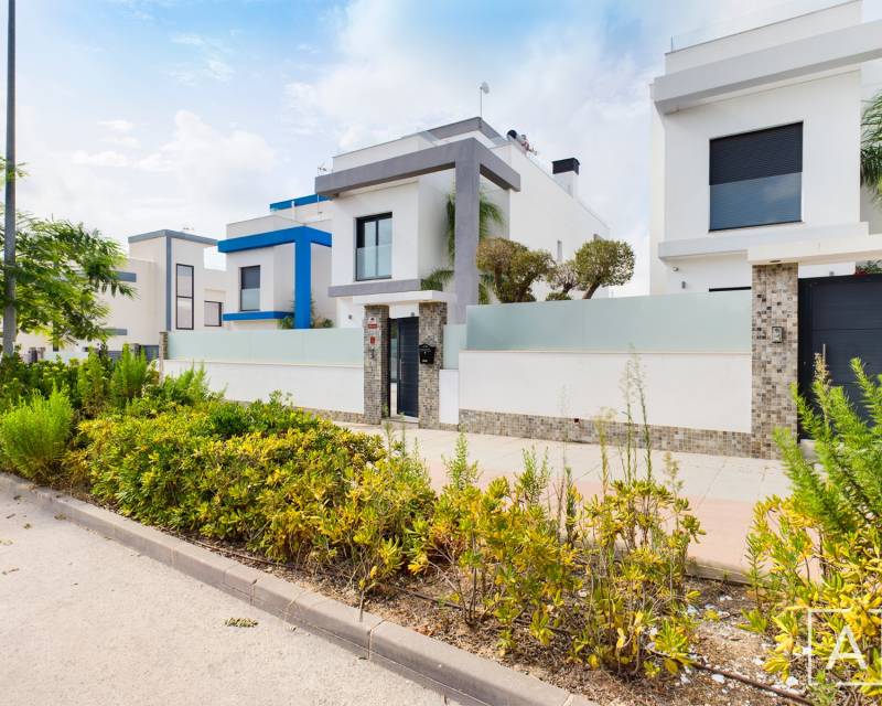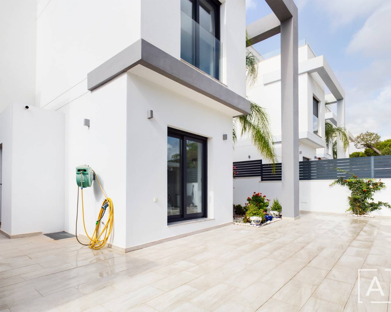 Nous sommes ravis de vous présenter cette magnifique villa de 4 chambres et 4 salles de bain située sur le parcours de golf Lo Romero à Pilar de la Horadada. Cette villa est meilleure que neuve avec un certain nombre de fonctionnalités, créant la villa de luxe ultime.Construite en 2019, elle se trouve au centre d'un terrain de 272m2. L'accès à l'avant se fait par une porte roulante, qui donne accès au parking pour 2 voitures, ou par une porte piétonne avec un interphone vidéo. Les deux portes sont à commande électronique. L'extérieur est principalement carrelé, créant une zone à faible entretien. Sur la terrasse arrière il y a une piscine, il y a aussi des stores électriques, une douche et des toilettes. En entrant dans la Villa, vous êtes immédiatement conscient de l'espace et de la lumière créés par le vitrage et la double hauteur de plafond. Sur la droite se trouve la cuisine entièrement équipée avec une variété d'électroménagers entremêlés dont 2 fours dont un avec un micro-ondes. , lave-vaisselle et céramique plaque. brûleur. Un îlot central sépare la cuisine de la salle à manger, qui bénéficie d'une vue sur la piscine et les citronniers derrière. La partie séjour profite d'un plafond à double hauteur. Il y a aussi une chambre double avec placards et une salle de bain avec douche. Tous les étages sont accessibles depuis l'ascenseur spécialement conçu qui a été installé pendant la construction et peut accueillir 4 personnes et est accessible en fauteuil roulant. l'escalier principal en verre et en marbre mène au sous-sol qui est actuellement configuré comme une "grotte pour hommes" avec une section de bar. Il y a une chambre supplémentaire ici qui a des armoires encastrées et une salle de bain avec douche. Le premier étage a une autre chambre, avec placards et douche en suite, le couloir qui offre une vue sur le salon, la cuisine mène à la chambre principale en suite. bénéficiant d'une vue sur la campagne et les chaînes de montagnes. La suite comprend un dressing et une salle de bains avec douche. Le solarium offre 360 degrés de la campagne environnante et est l'endroit idéal pour se détendre sur le canapé extérieur ou profiter d'un repas.
