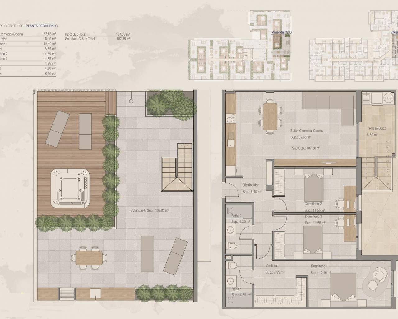 NOUVEAUX PENTHOUSES À TORRE-PACHECO Nouveau complexe résidentiel d'appartements à Torre Pacheco (Murcia) au cœur de la Costa Cálida. La deuxième phase comprend 25 appartements et penthouses avec 2 et 3 chambres à coucher. Les appartements modernes sont dotés d'une cuisine ouverte sur un salon-salle à manger spacieux et lumineux, avec accès à une grande terrasse. Les penthouses modernes disposent d'un solarium privé. Un parking souterrain et une salle de stockage sont disponibles en option moyennant un supplément. Complexe moderne avec piscine et jardins communs. Tout le confort est à portée de main. Il y a des supermarchés, des pharmacies, des banques, des écoles, des bars, des restaurants, la plage et l'aéroport sont à quelques minutes. Un club de golf se trouve également en ville, à proximité des appartements, et plusieurs terrains de golf sont situés à 10-25 minutes en voiture des appartements. L'autoroute AP-7 est également proche et la N-332 est également très facile d'accès, ce qui vous permet de vous rendre facilement dans d'autres régions telles que Pilar de la Horadada, San Pedro del Pinatar, Orihuela Costa, Torrevieja, Alicante, etc. L'aéroport international de Murcia Corvera se trouve à 20 minutes et l'aéroport d'Alicante à environ une heure.