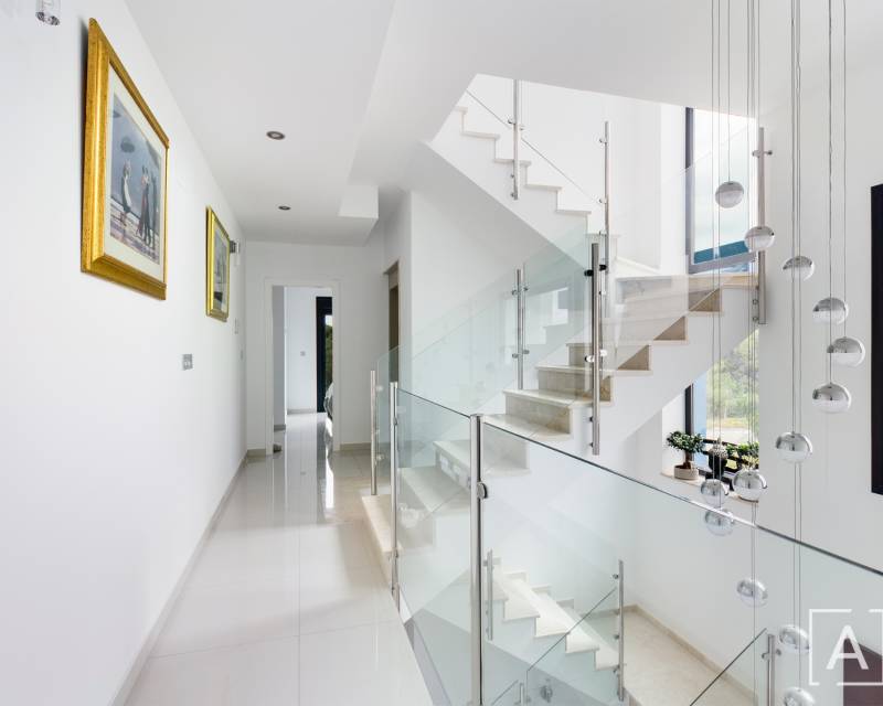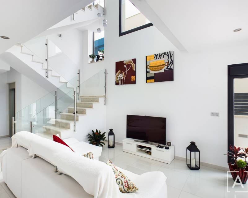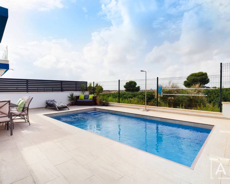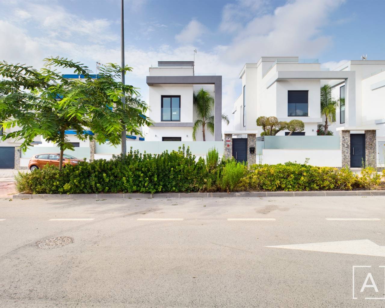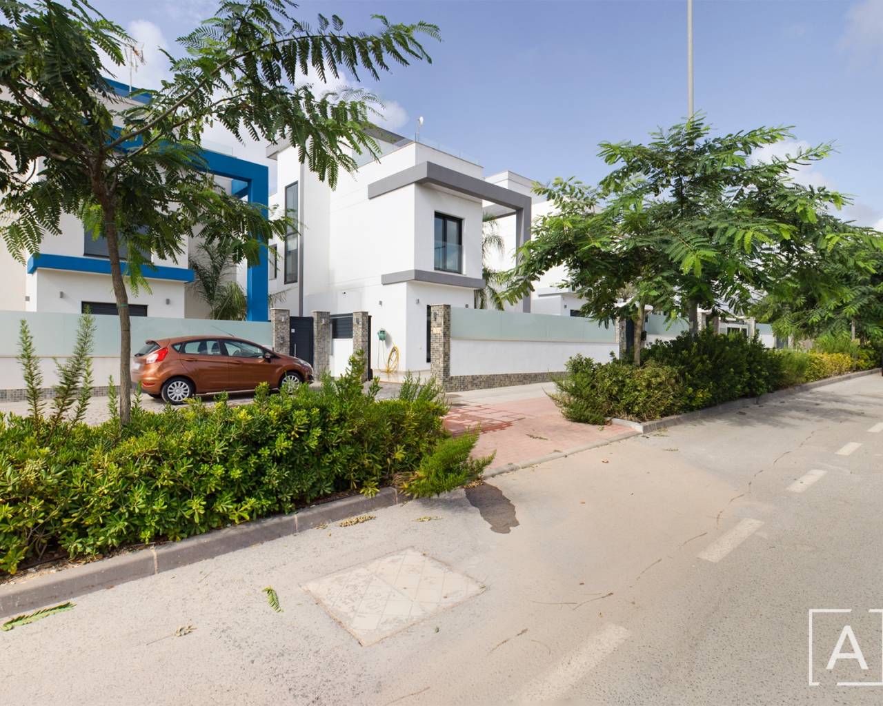 Nous sommes ravis de vous présenter cette magnifique villa de 4 chambres et 4 salles de bain située sur le parcours de golf Lo Romero à Pilar de la Horadada. Cette villa est meilleure que neuve avec un certain nombre de fonctionnalités, créant la villa de luxe ultime.Construite en 2019, elle se trouve au centre d'un terrain de 272m2. L'accès à l'avant se fait par une porte roulante, qui donne accès au parking pour 2 voitures, ou par une porte piétonne avec un interphone vidéo. Les deux portes sont à commande électronique. L'extérieur est principalement carrelé, créant une zone à faible entretien. Sur la terrasse arrière il y a une piscine, il y a aussi des stores électriques, une douche et des toilettes. En entrant dans la Villa, vous êtes immédiatement conscient de l'espace et de la lumière créés par le vitrage et la double hauteur de plafond. Sur la droite se trouve la cuisine entièrement équipée avec une variété d'électroménagers entremêlés dont 2 fours dont un avec un micro-ondes. , lave-vaisselle et céramique plaque. brûleur. Un îlot central sépare la cuisine de la salle à manger, qui bénéficie d'une vue sur la piscine et les citronniers derrière. La partie séjour profite d'un plafond à double hauteur. Il y a aussi une chambre double avec placards et une salle de bain avec douche. Tous les étages sont accessibles depuis l'ascenseur spécialement conçu qui a été installé pendant la construction et peut accueillir 4 personnes et est accessible en fauteuil roulant. l'escalier principal en verre et en marbre mène au sous-sol qui est actuellement configuré comme une "grotte pour hommes" avec une section de bar. Il y a une chambre supplémentaire ici qui a des armoires encastrées et une salle de bain avec douche. Le premier étage a une autre chambre, avec placards et douche en suite, le couloir qui offre une vue sur le salon, la cuisine mène à la chambre principale en suite. bénéficiant d'une vue sur la campagne et les chaînes de montagnes. La suite comprend un dressing et une salle de bains avec douche. Le solarium offre 360 degrés de la campagne environnante et est l'endroit idéal pour se détendre sur le canapé extérieur ou profiter d'un repas.