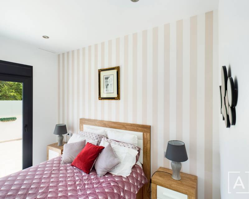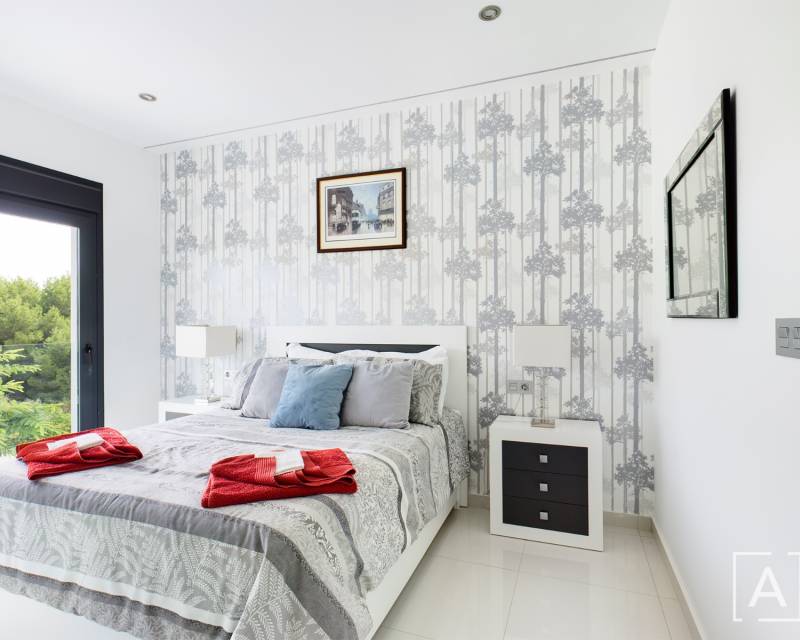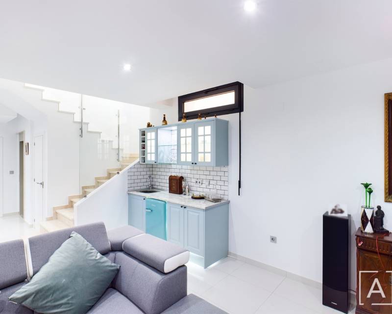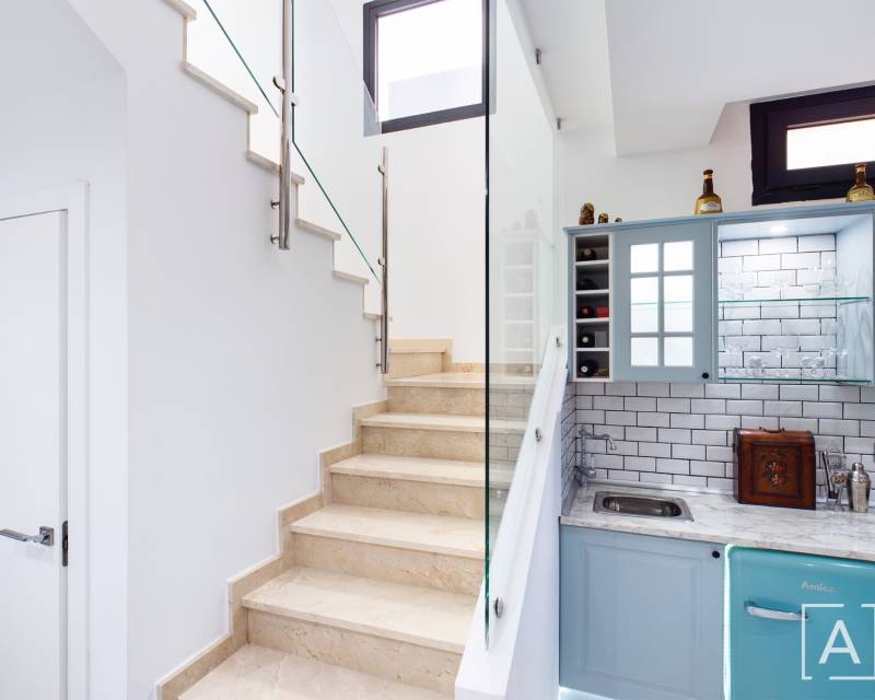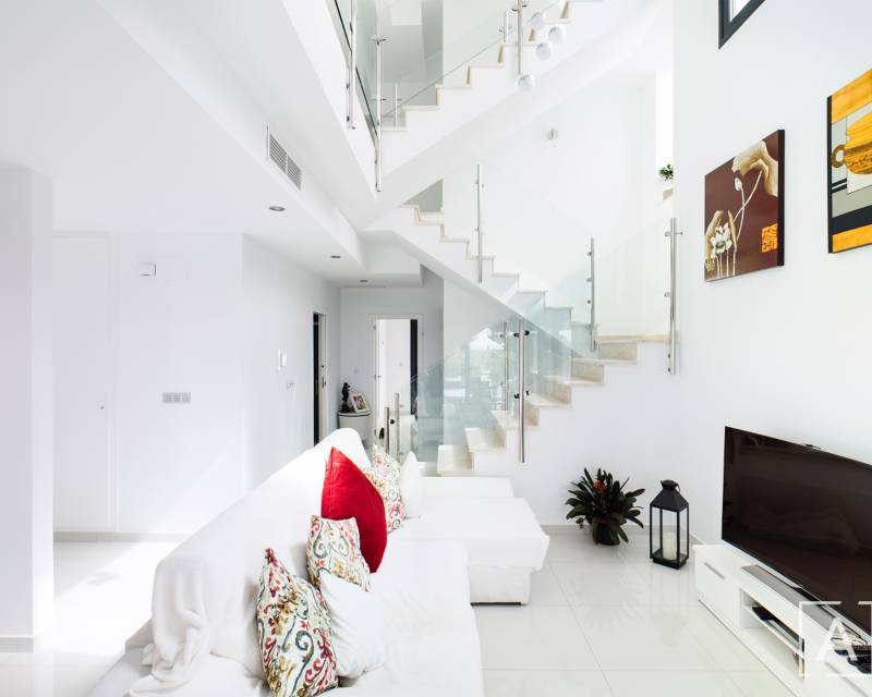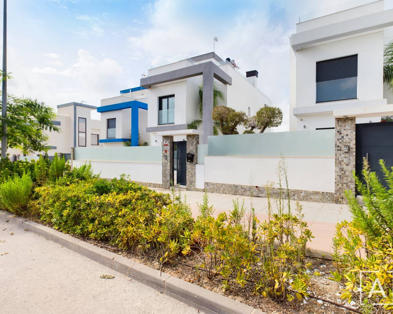 Nous sommes ravis de vous présenter cette magnifique villa de 4 chambres et 4 salles de bain située sur le parcours de golf Lo Romero à Pilar de la Horadada. Cette villa est meilleure que neuve avec un certain nombre de fonctionnalités, créant la villa de luxe ultime.Construite en 2019, elle se trouve au centre d'un terrain de 272m2. L'accès à l'avant se fait par une porte roulante, qui donne accès au parking pour 2 voitures, ou par une porte piétonne avec un interphone vidéo. Les deux portes sont à commande électronique. L'extérieur est principalement carrelé, créant une zone à faible entretien. Sur la terrasse arrière il y a une piscine, il y a aussi des stores électriques, une douche et des toilettes. En entrant dans la Villa, vous êtes immédiatement conscient de l'espace et de la lumière créés par le vitrage et la double hauteur de plafond. Sur la droite se trouve la cuisine entièrement équipée avec une variété d'électroménagers entremêlés dont 2 fours dont un avec un micro-ondes. , lave-vaisselle et céramique plaque. brûleur. Un îlot central sépare la cuisine de la salle à manger, qui bénéficie d'une vue sur la piscine et les citronniers derrière. La partie séjour profite d'un plafond à double hauteur. Il y a aussi une chambre double avec placards et une salle de bain avec douche. Tous les étages sont accessibles depuis l'ascenseur spécialement conçu qui a été installé pendant la construction et peut accueillir 4 personnes et est accessible en fauteuil roulant. l'escalier principal en verre et en marbre mène au sous-sol qui est actuellement configuré comme une "grotte pour hommes" avec une section de bar. Il y a une chambre supplémentaire ici qui a des armoires encastrées et une salle de bain avec douche. Le premier étage a une autre chambre, avec placards et douche en suite, le couloir qui offre une vue sur le salon, la cuisine mène à la chambre principale en suite. bénéficiant d'une vue sur la campagne et les chaînes de montagnes. La suite comprend un dressing et une salle de bains avec douche. Le solarium offre 360 degrés de la campagne environnante et est l'endroit idéal pour se détendre sur le canapé extérieur ou profiter d'un repas.