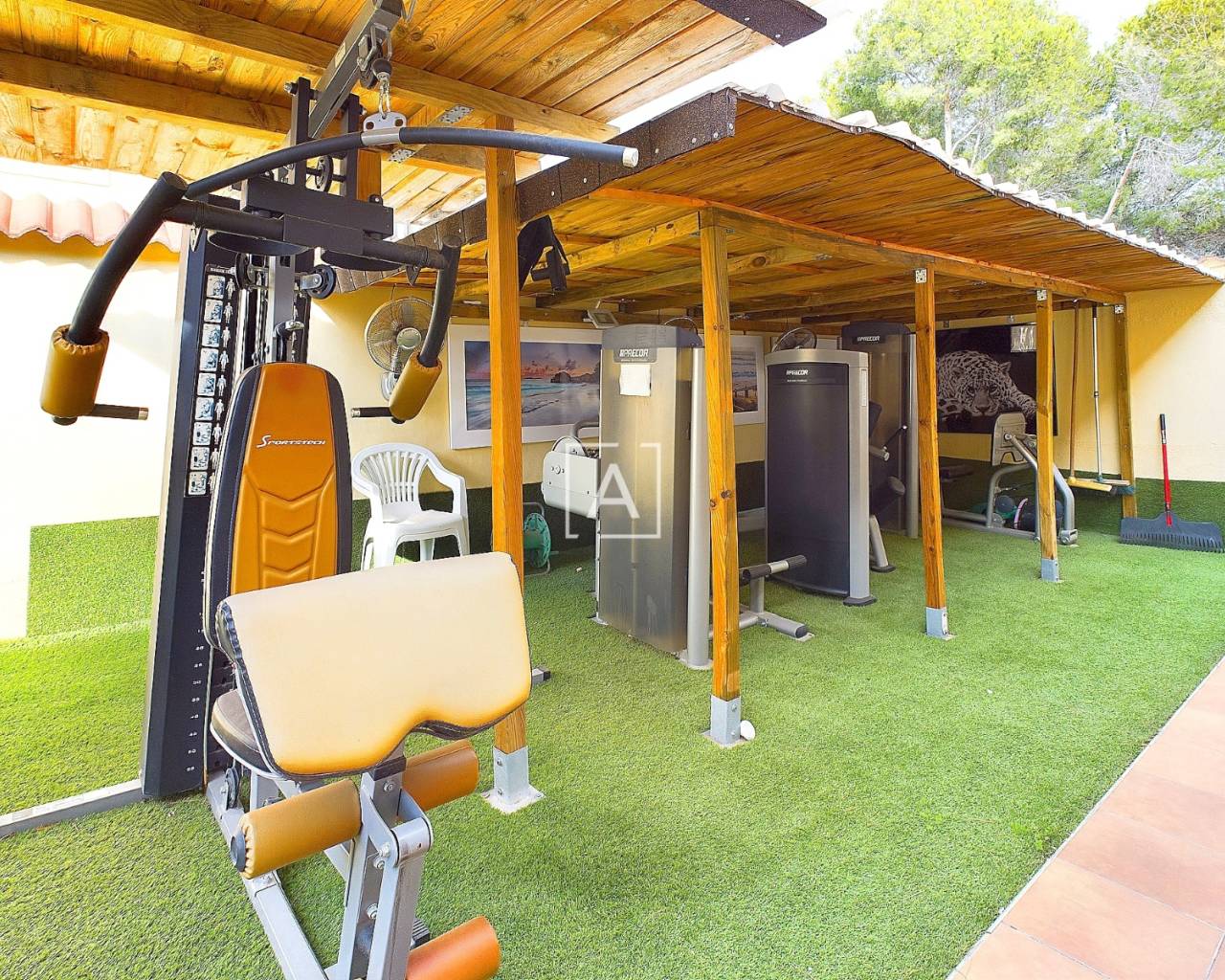 Les équipements supplémentaires comprennent un grand débarras et un atelier. Sur le côté de la villa, il y a une salle de sport couverte avec des équipements professionnels qui est incluse dans la vente, offrant un endroit idéal pour ceux qui aiment un style de vie actif. Pour plus de commodité, il y a un parking hors rue pour plusieurs voitures avec un abri pour voiture, le tout sécurisé par un portail électrique.