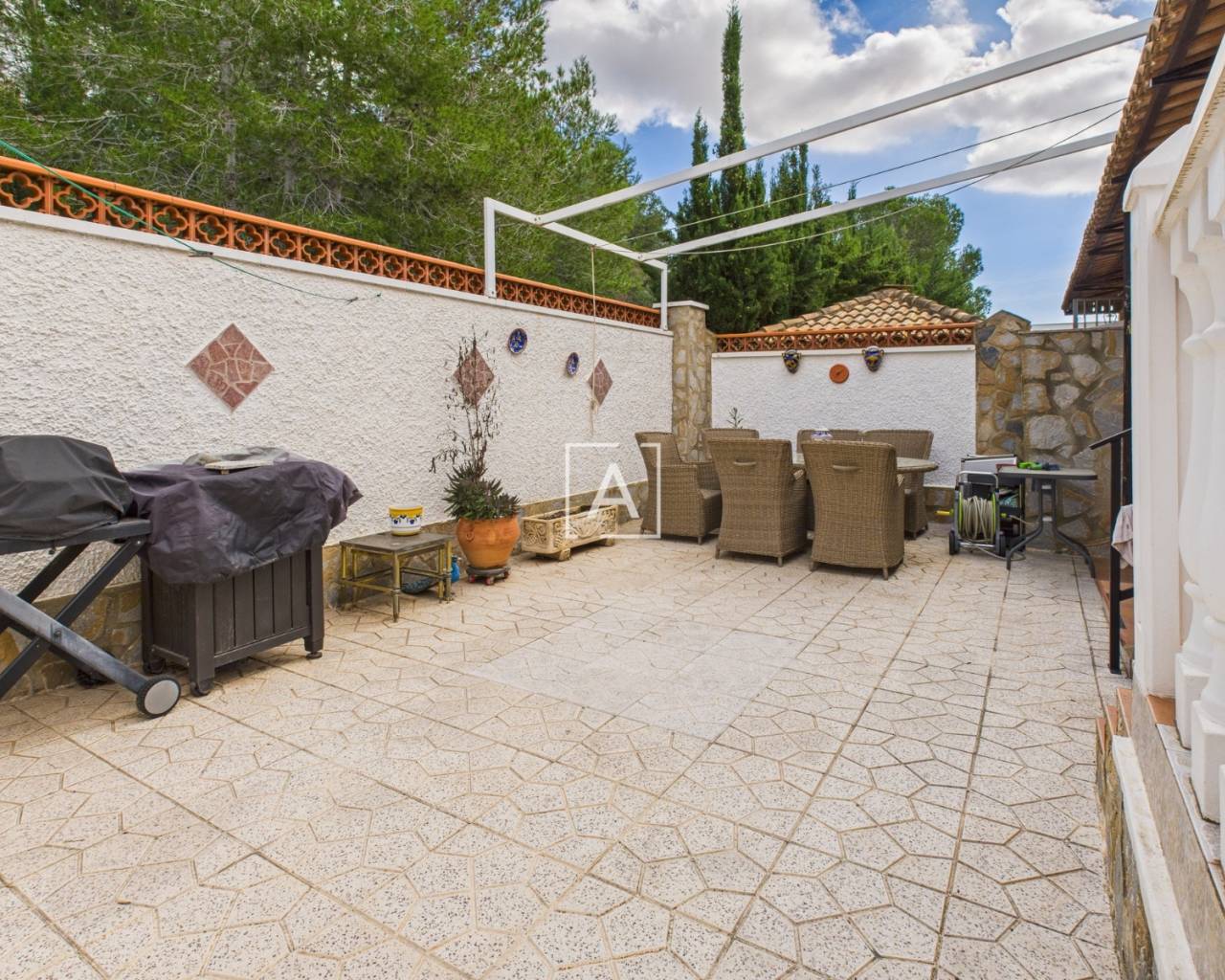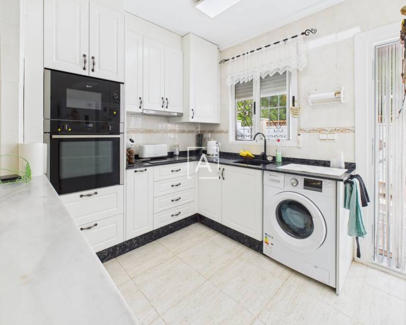 La cuisine offre de nombreux rangements, un bar et un accès direct au jardin arrière, idéal pour les repas en plein air et la détente. Un escalier extérieur mène à un appartement indépendant comprenant un séjour/chambre ouvert, une cuisine et une salle de bains – parfait pour accueillir des invités ou générer un revenu locatif. À l'étage, vous trouverez également un cellier et une véranda exposée plein sud.