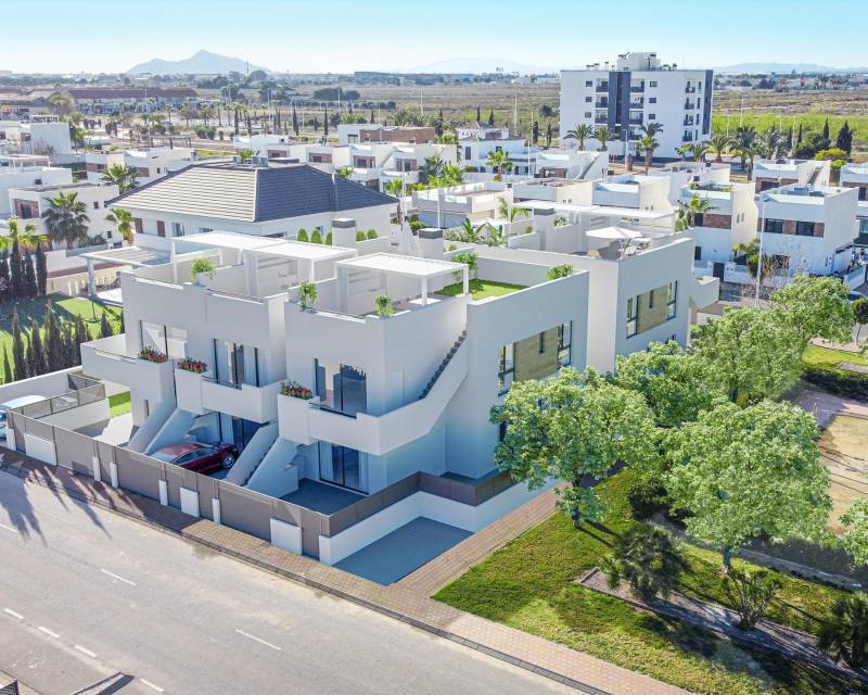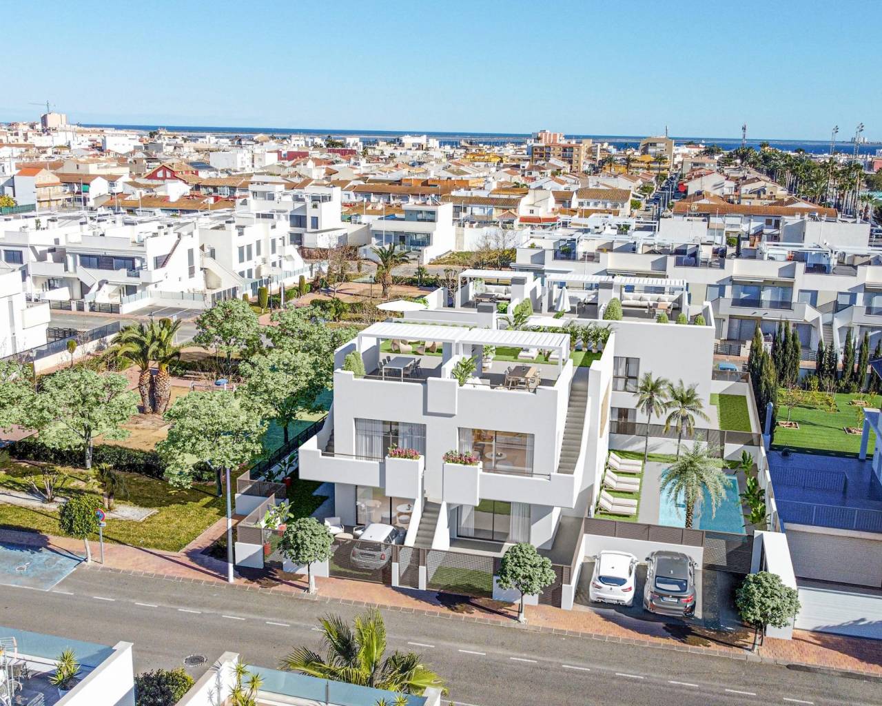 NEW BUILD BUNGALOWS IN SAN PEDRO DEL PINATAR New Build residential complex of bungalows in San Pedro Del Pinatar. Modern bungalows with 2 and 3 bedrooms, open plan kitchen with living room, fitted wardrobes, terrace. The top floor bungalow has private solarium. All bungalows has a parking space. It has common garden area with swimming pool. San Pedro del Pinatar's privileged location on the Mar Menor and Mediterranean coastline it attracts those with an interest in sailing and watersports, providing marina mooring and sailing clubs, while the beaches and natural mud baths attract those seeking safe sun, sea and sand. San Pedro del Pinatar has an established community and offers an excellent range of activities, including covered swimming pool and sports facilities, as well as a year round programme of social activities by the pleasant winter weather. The benefits of the mud baths, typical of the region, or the calm waters of the Mar Menor, have favoured the growth of Lo Pagán, which currently has all kind of amenities. In addition, it has an excellent location, just 5 minutes from the Commercial Centre Dos Mares. Murcia/Corvera airport is 30 minutes away and Alicante airport is an hour drive away.