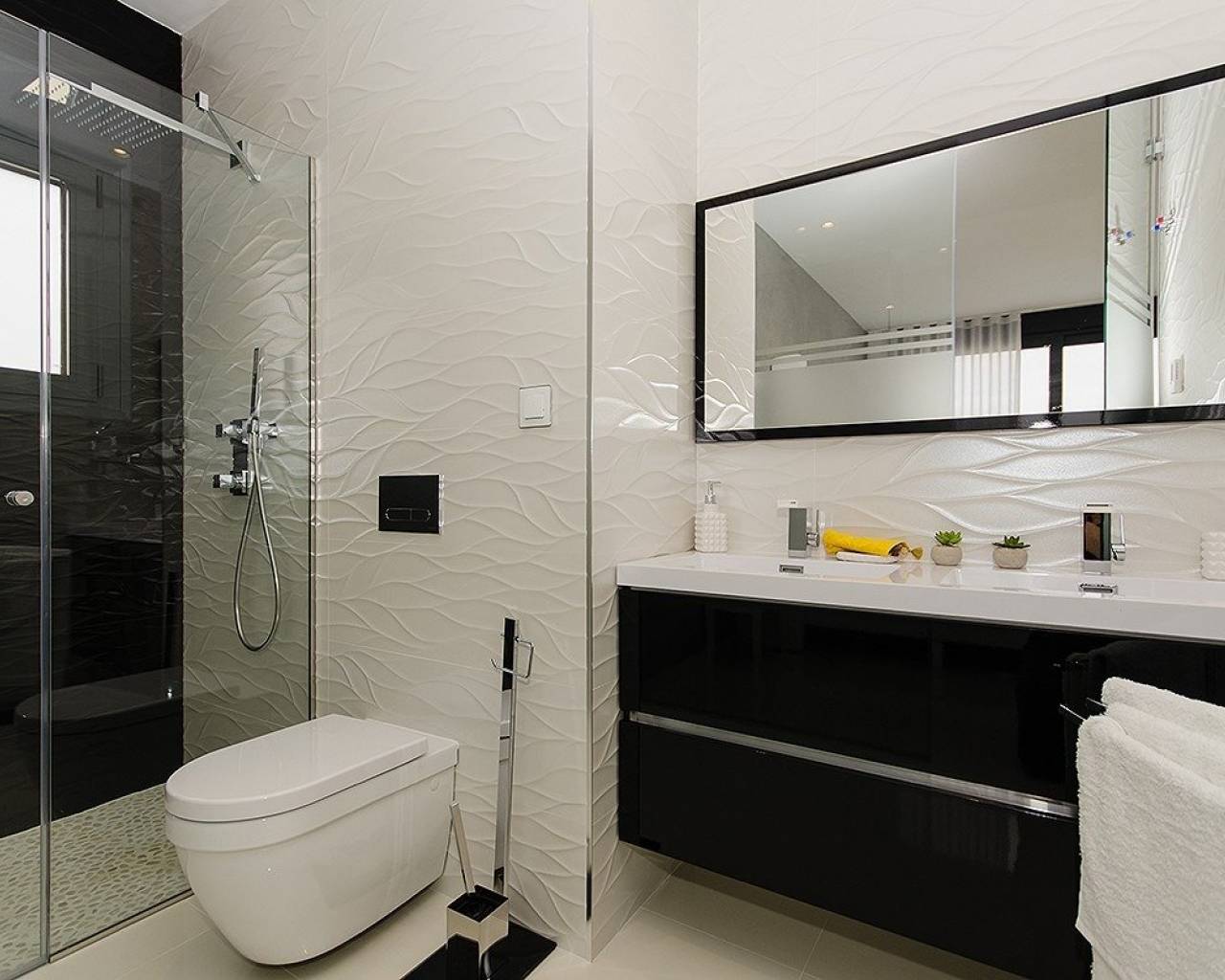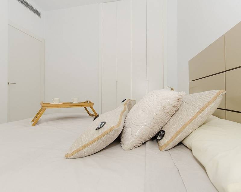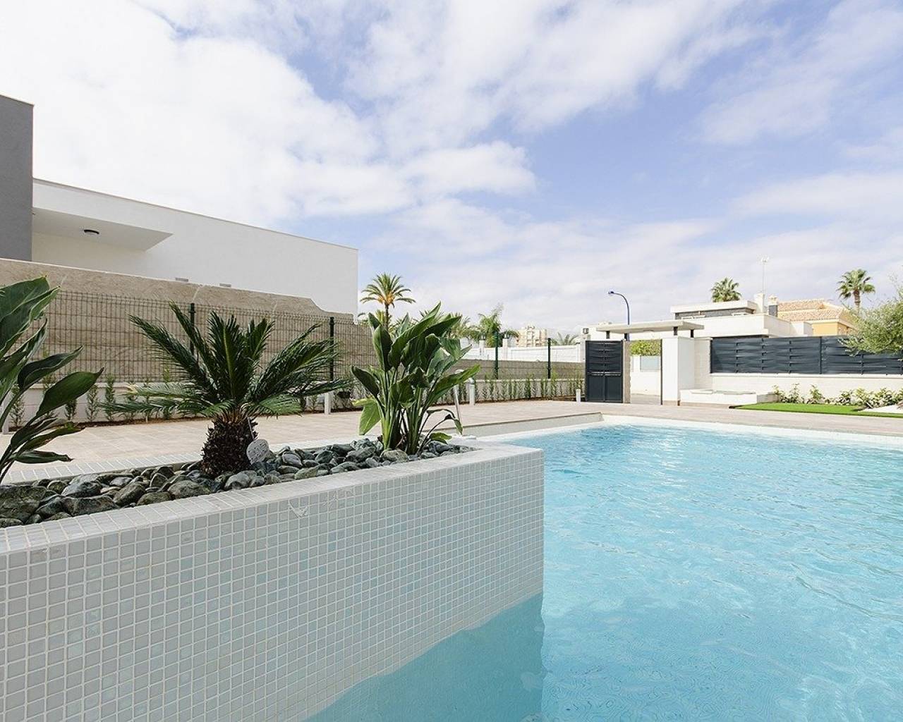 NEW BUILD VILLA IN ORIHUELA COSTA (CAMPOAMOR) Do you want to enjoy an exclusive vacation near the sea? Impossible not to fall for this ultra-modern villa in Orihuela Costa with 4 bedrooms, 2 bathrooms, private pool, garden and luxury extras, according to personal preferences. Its delicate infrastructure integrates with nature providing a quiet and isolated environment. Built with the highest quality materials, this elegant property is surrounded by abundant vegetation and a few meters from the cleanest beaches in Campoamor: Playa de la Glea, Aguamarina and Cabo Roig. It is a pleasure to have these three beautiful beaches that have been awarded with the Blue Flag within reach. Whenever you need a moment of reflection, you can go down to touch its crystal clear waters or lie down on its soft sand to read a book while listening to the placid sound of the sea. In the surroundings you will find all the essential services to live all year round: supermarkets, pharmacies, cafes, restaurants, shopping centers ... And if you are also enthusiastic about golf, less than 10 minutes away you can choose between three privileged golf courses of international recognition where put your aim to the test: Las Colinas Golf, Villamartín or Las Ramblas. The promotion includes several models of homes with 2,3,4 and up to 5 bedrooms. This particular villa consists of 4 double bedrooms, 2 bathrooms, a fully equipped American kitchen, an open living-dining room with great lighting, access to the garden and the beautiful pool. In addition, the price includes: Underfloor heating and mirror in bathrooms Indoor and outdoor lights Built-in wardrobes Security door Pre-installation of air conditioning Top brand appliances The house follows the trend of open concept design, enhancing spacious spaces and offering a greater sense of comfort and well-being in its interiors.