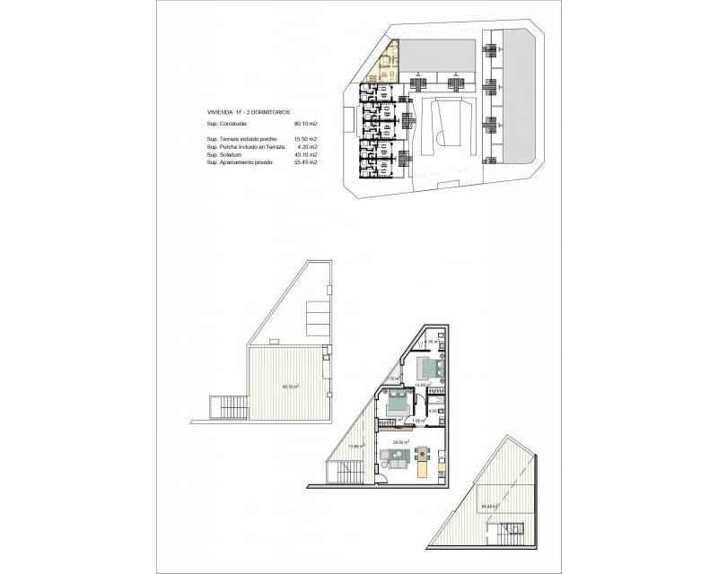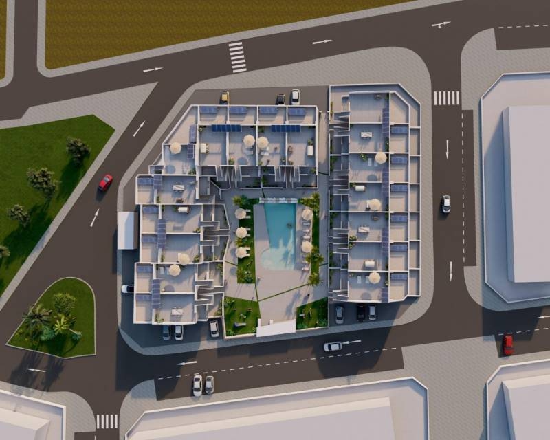 NEW BUILD BUNGALOWS IN ROLDAN New Build gated residential complex of bungalow apartments located in Roldán, Murcia. These exclusive bungalows are designed with 3 bedrooms and 2 bathrooms, terrace on the ground floor and with 2 bedrooms and 2 bathrooms and solarium for the upper floor. The interiors, elegant and functional, have high quality floors, fully fitted kitchens in white combined with imitation wood, including electrical appliances. The bathrooms have a vanity unit with washbasin and light. The bedrooms include lined wardrobes with drawers and sliding doors and each property has pre-installation for ducted air conditioning. The exteriors are not less impressive, including a communal swimming pool and a beautiful sport area and childrens playground on artificial grass to enjoy. Each property has parking space. Storerooms are optional at an extra cost. Roldan itself is a traditional town with all the local amenities you will need including Supermarkets, Restaurants, Bars, Health Clinic, Pharmacy, Police Station, Petrol Station, Mechanics, Dentists, Doctors and more. The nearby golf resorts of La Torre, & Terrazas are easily accessible, Corvera Airport is 15 minutes away & the beaches of the Mar Menor just 20 minutes drive.