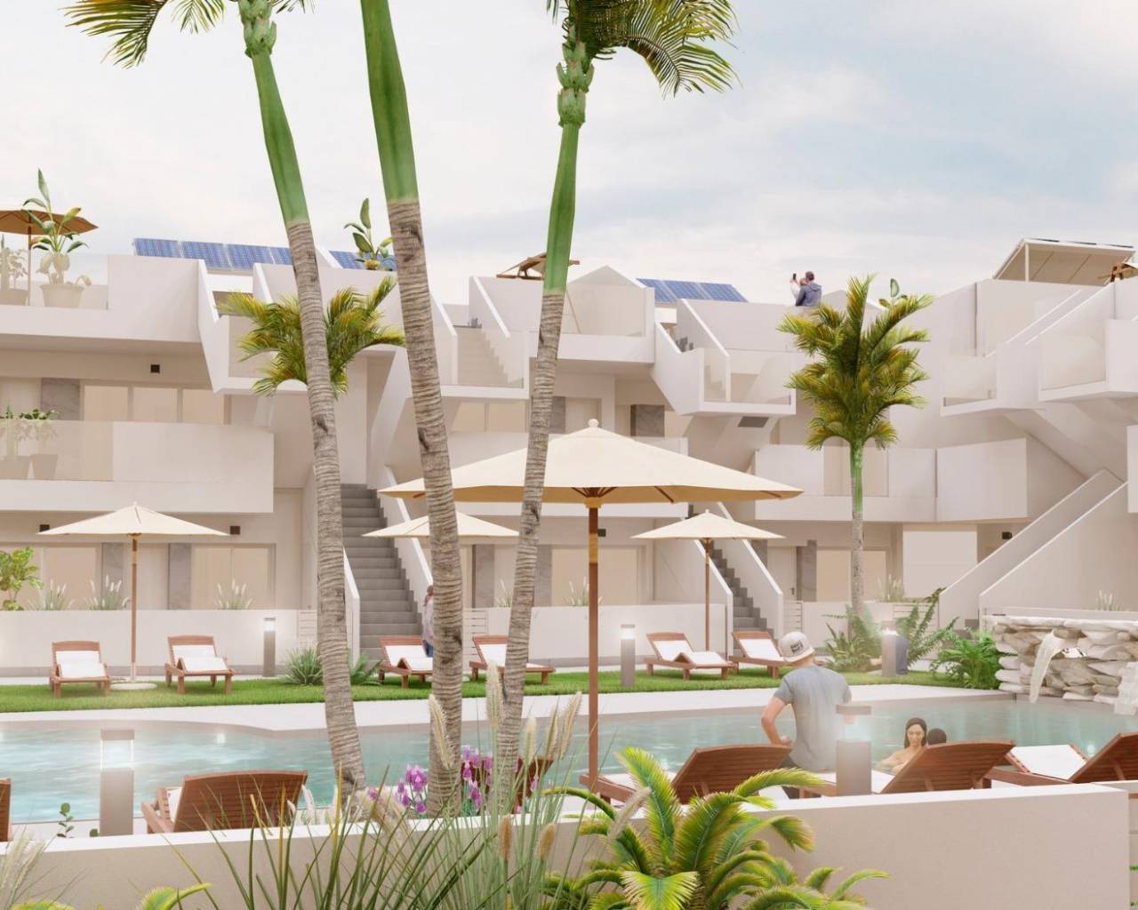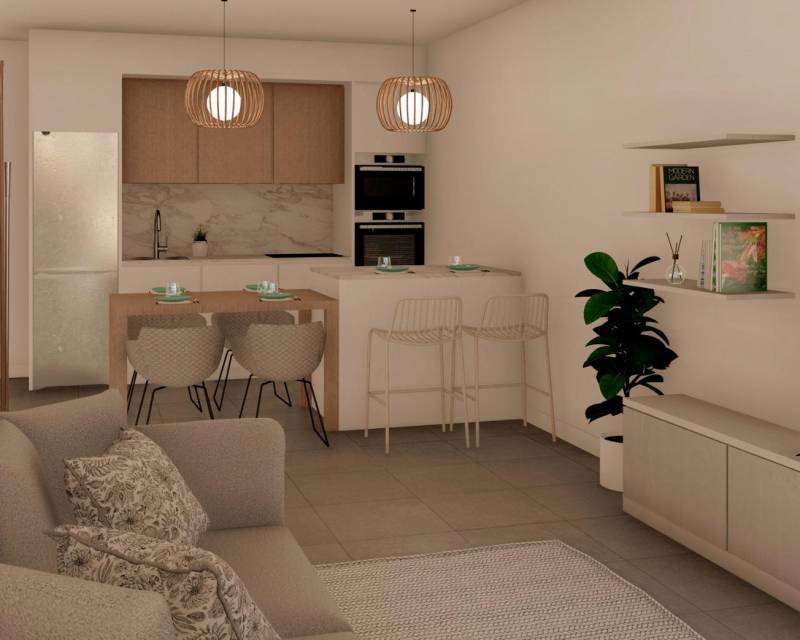 NEW BUILD BUNGALOWS IN ROLDAN New Build gated residential complex of bungalow apartments located in Roldán, Murcia. These exclusive bungalows are designed with 3 bedrooms and 2 bathrooms, terrace on the ground floor and with 2 bedrooms and 2 bathrooms and solarium for the upper floor. The interiors, elegant and functional, have high quality floors, fully fitted kitchens in white combined with imitation wood, including electrical appliances. The bathrooms have a vanity unit with washbasin and light. The bedrooms include lined wardrobes with drawers and sliding doors and each property has pre-installation for ducted air conditioning. The exteriors are not less impressive, including a communal swimming pool and a beautiful sport area and childrens playground on artificial grass to enjoy. Each property has parking space. Storerooms are optional at an extra cost. Roldan itself is a traditional town with all the local amenities you will need including Supermarkets, Restaurants, Bars, Health Clinic, Pharmacy, Police Station, Petrol Station, Mechanics, Dentists, Doctors and more. The nearby golf resorts of La Torre, & Terrazas are easily accessible, Corvera Airport is 15 minutes away & the beaches of the Mar Menor just 20 minutes drive.
