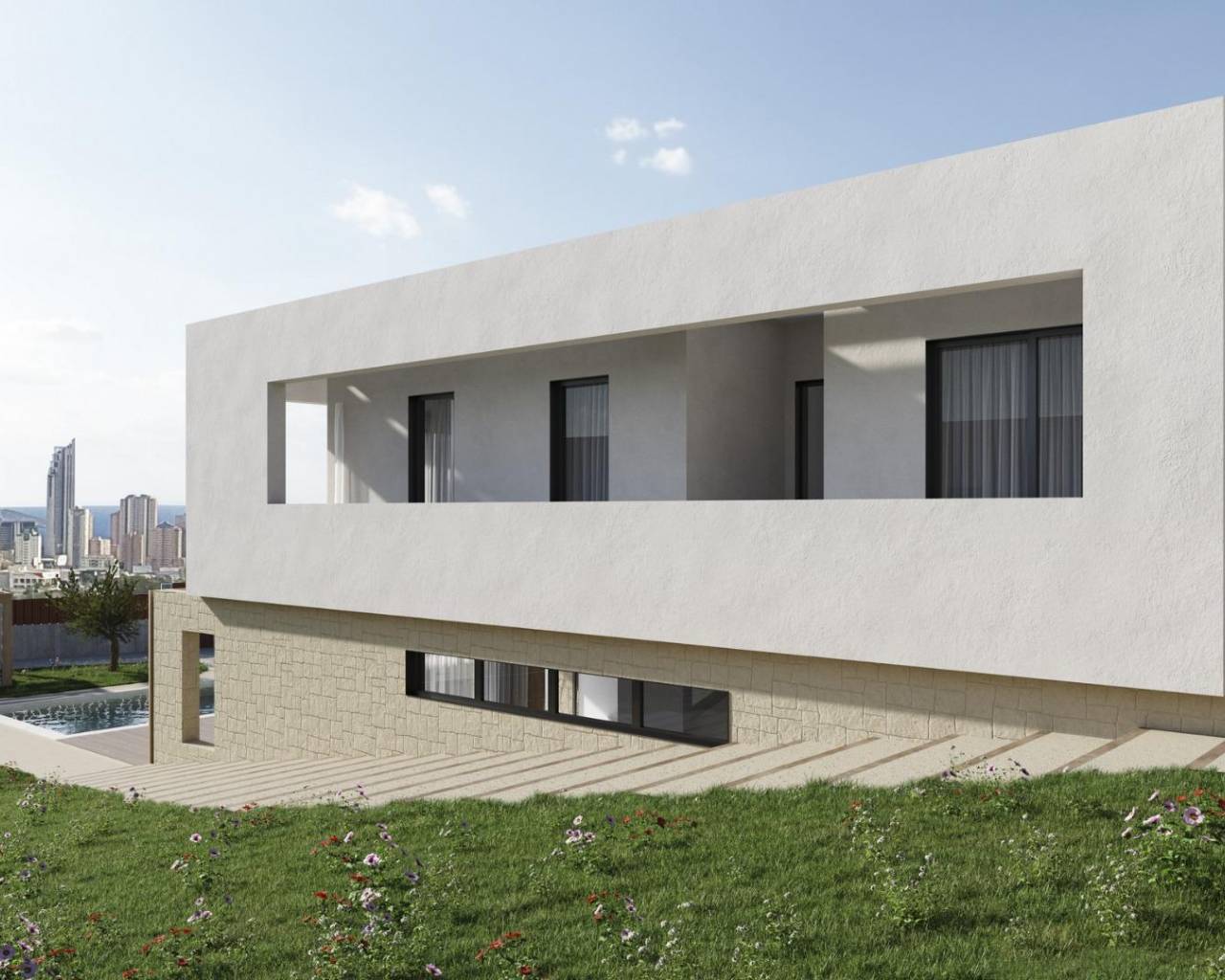 NEW BUILD VILLAS IN FINESTRAT New Build Modern villas in Finestrat. Villas with3 bedrooms and 3 bathrooms, open plan kitchen with lounge area, terrace with magnificent views over Benidorm, private garden with swimming pool and parking space. It is conceived as a fully walkable space with interior and exterior pathways that provide independent access to each floor. This design offers various perspectives of the architectural complex and its surroundings, with the sea and Sierra Cortina serving as a picturesque backdrop. The main entrance to the villa is located at the lower part of the plot, featuring ample parking for two vehicles. A water feature with lounge chairs introduces you to the ground floor, characterized by wide walls adorned with masonry. Extending seamlessly from the living room is a terrace, made possible by a large folding window. Wooden shutters on masonry walls provide a partially covered outdoor area for added comfort. The pool, with its aquamarine hues and gresite lining, sits adjacent to a pavement area crafted from non-slip porcelain tile with a wood-like appearance. This space also includes a barbecue area that can be customized to suit the user’s needs, with access from a paved zone through the natural terrain. Finestrat located in the Marina Baixa region of the Costa Blanca, close to neighbouring Benidorm and about 40 kilometres from the city of Alicante and the international airport. The village is situated on the mountainside of Puig Campana and offers beautiful views of the mountains, the coast and the Mediterranean Sea. Benidorm is just a five-minute drive from the properties and offers all the services you would need including shops, bars, restaurants, supermarkets, banks, pharmacies and several private international schools.