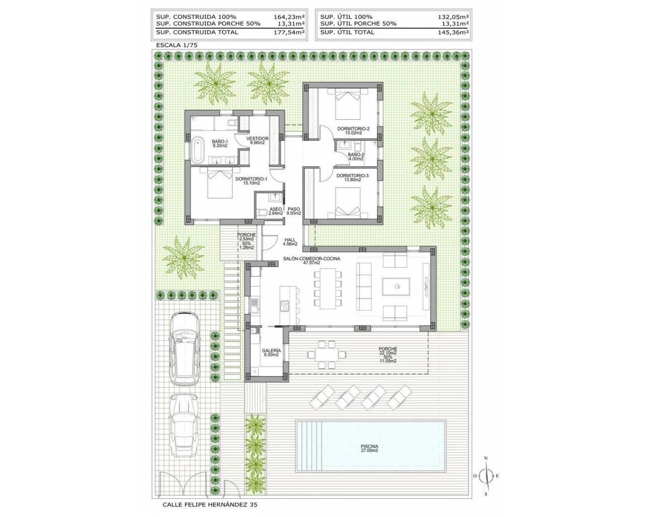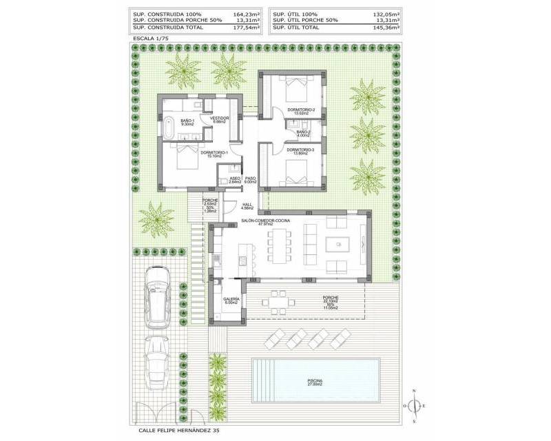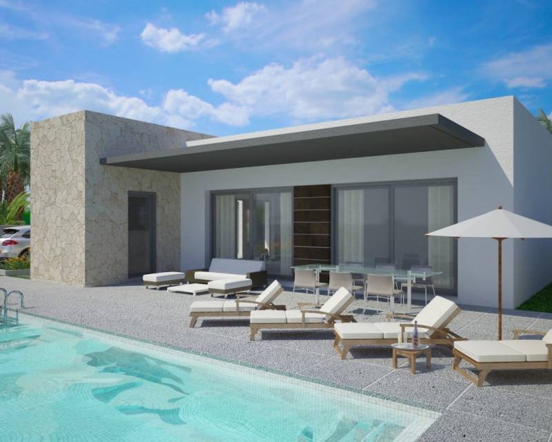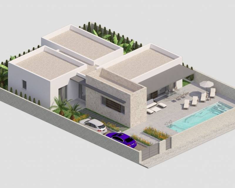 NEW BUILD MODERN VILLAS IN BENIJOFAR New Build villas located in Benijófar, a privileged area of the Costa Blanca, equipped with all services, 20 minutes from Alicante Airport, near the beautiful beaches of Guardamar and several golf courses. It is a modern style villas consisting of spacious living-dining room with an open-plan kitchen, 3 bedrooms( one of them en-suite) and 3 bathrooms. It also has a private plot with terrace, parking area, private pool, Mediterranean-style garden with great views. The house also has hot and cold air conditioning, video intercom and security door. Benijofar it is a lovely village with a charming church and all services such as supermarkets, pharmacies, banks, restaurants and natural park located very close to the villas. There are several golf courses close by as well as water parks in nearby Rojales and Torrevieja. Benijófar located a few minutes from the N-332 and AP-7. Just 30 minutes from Alicante airport, 10 minutes from the beaches of Guardamar and Torrevieja.