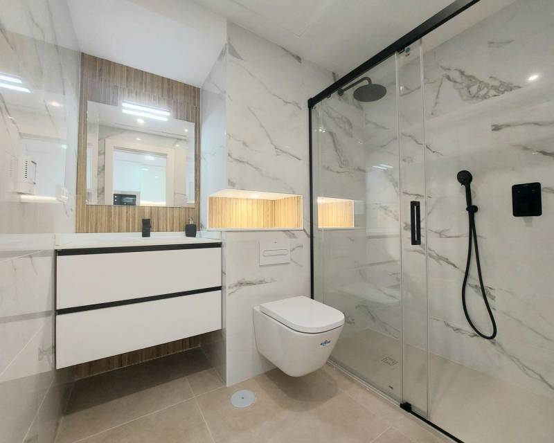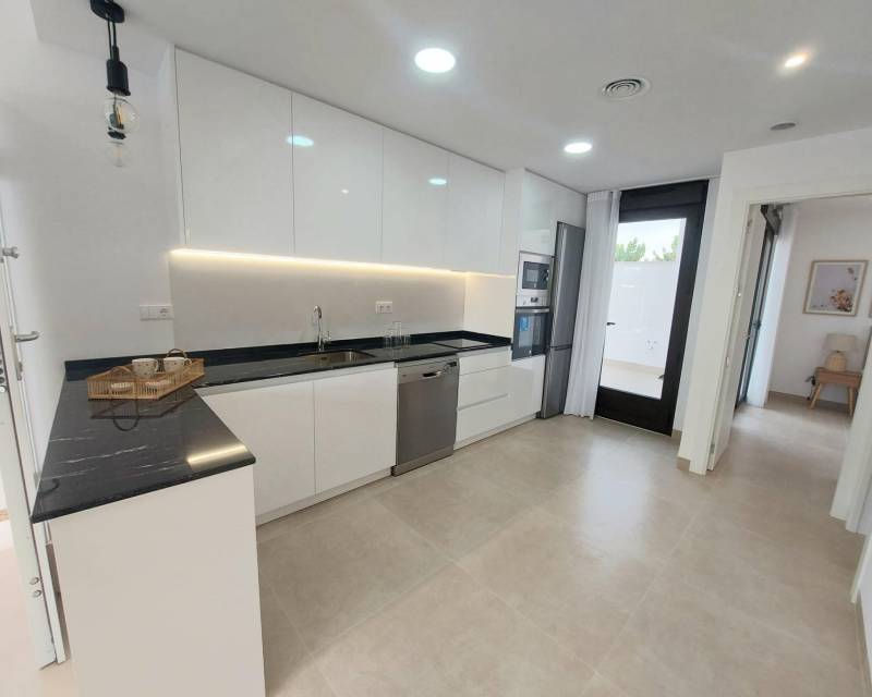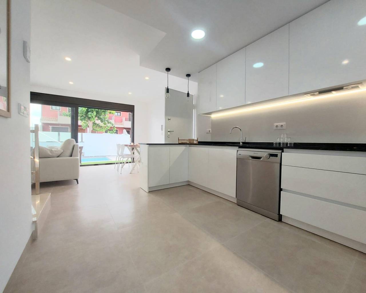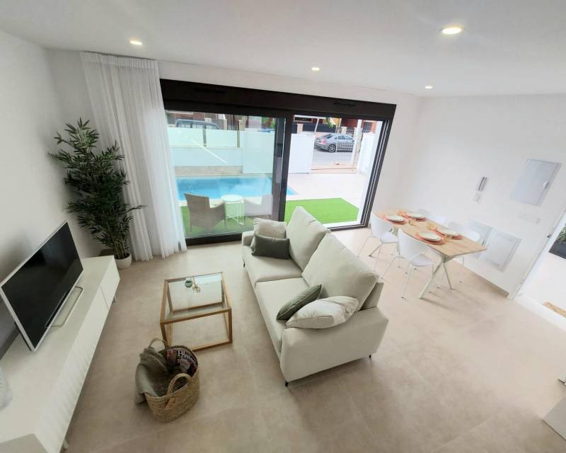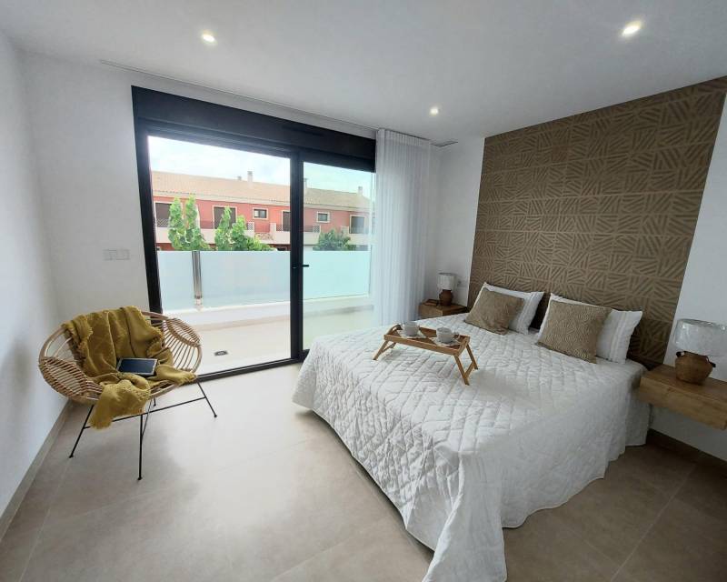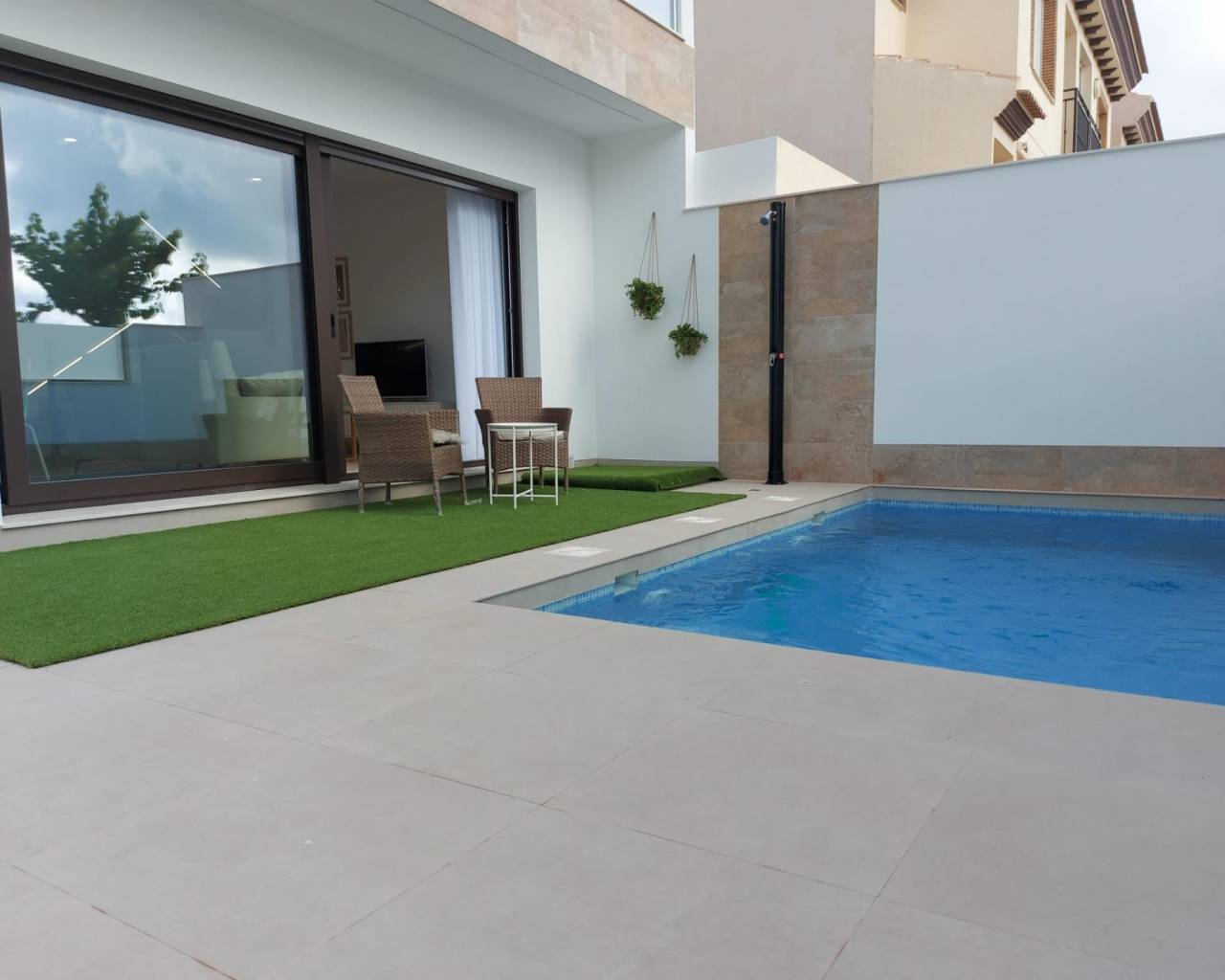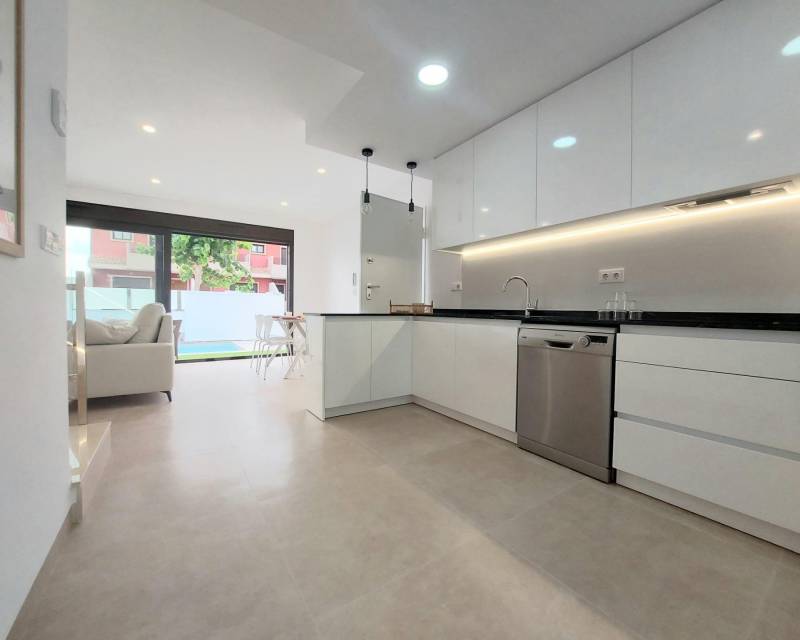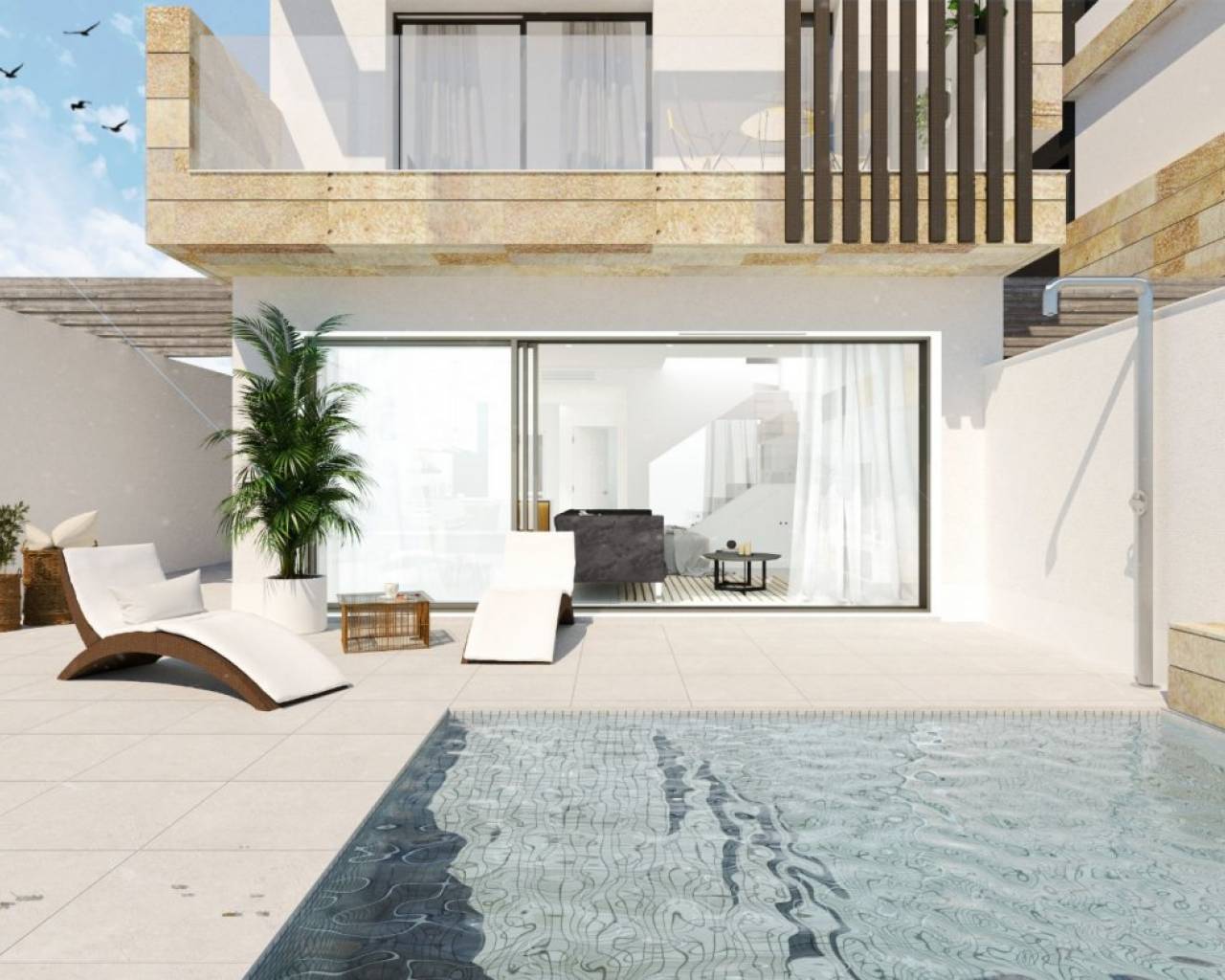 NEW BUILD VILLAS IN SAN PEDRO DEL PINATAR New Built modern villas located near the centre of San Pedro del Pinatar. Villas build over 2 floors, has 3 bedrooms, 3 bathrooms, open plan kitchen with the lounge area, fitted wardrobes, private garden with the pool and off road parking space, private solarium. From the living room you have direct access to the terrace and the pool. Villas comes with pre-installed ducted A/C, LED lighting package, motorized blinds, appliance package, intercom, aerothermic hot water system and private pool. Nearby you will find supermarkets, restaurants, shops and pharmacies. Within a short drive you can reach several golf courses or the shopping centre Dos Mares. The beautiful beach of Lo Pagan is a few minutes away. San Pedro del Pinatar's privileged location on the Mar Menor and Mediterranean coastline it attracts those with an interest in sailing and water sports, providing marina mooring and sailing clubs, while the beaches and natural mud baths attract those seeking safe sun, sea and sand. San Pedro del Pinatar has an established community and offers an excellent range of activities, including covered swimming pool and sports facilities, as well as a year round programme of social activities by the pleasant winter weather. The benefits of the mud baths, typical of the region, or the calm waters of the Mar Menor, have favoured the growth of Lo Pagán, wich currently has all kind of amenities. In addition, it has an excellent location, just 5 minutes from the Comercial Center Dos Mares