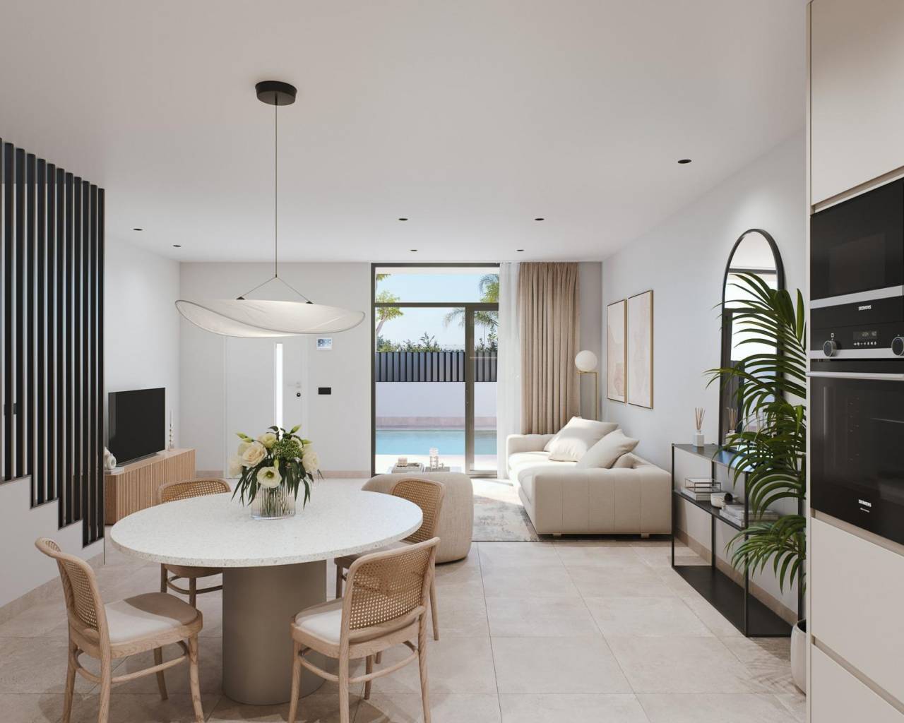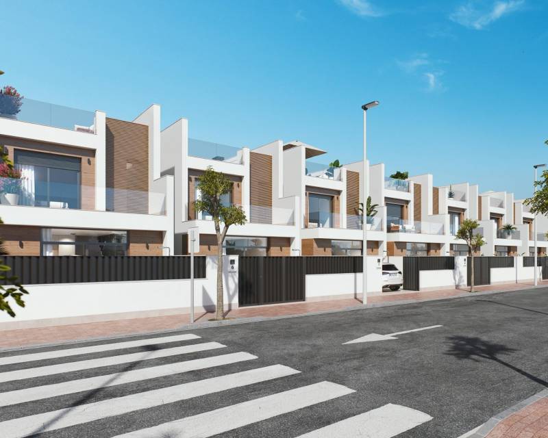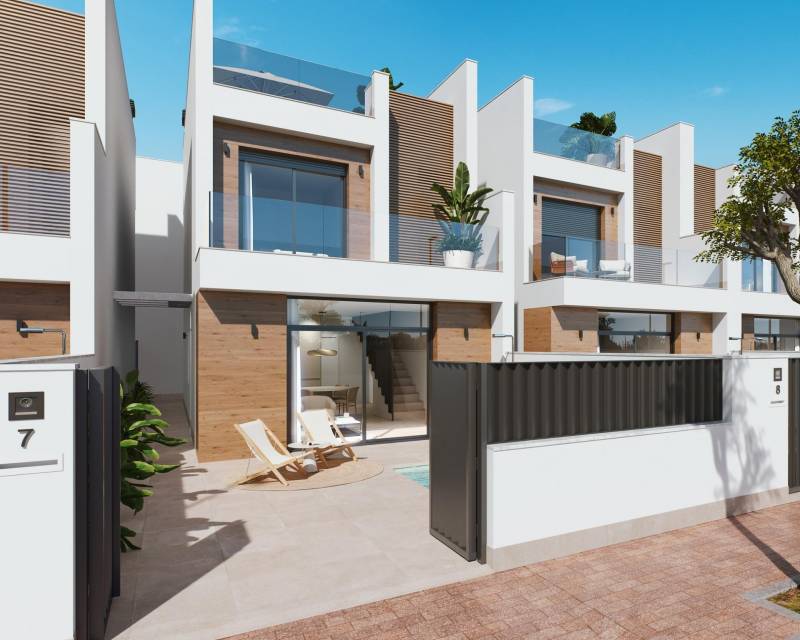 NEW BUILD VILLAS IN SAN PEDRO DEL PINATAR New development of villas and townhouses in San Pedro del Pinatar, Murcia. Luxury residential complex made up of 16 townhouses and detached villas, all with private swimming pool, terrace, solarium and parking space within the plot. Each property has 3 bedrooms and 2 complete bathrooms, as well as a dressing room in the master bedroom. The properties have been designed with a contemporary style and an open concept, consisting of a fully fitted kitchen and a living-dining room. The development is located in San Pedro del Pinatar, Murcia, surrounded by all amenities, sports facilities, close to several golf courses and 5 minutes from the Mediterranean Sea and the beaches of the Mar Menor. The property will meet the highest standards and will be equipped with: Private swimming pool with LED lighting and outdoor shower. Fully fitted and equipped kitchen with oven and microwave in column, built-in dishwasher and fridge freezer, ceramic hob and extractor hood. LED lighting: inside the property (dining room, kitchen, corridors and bathrooms), as well as in outdoor areas. Motorised blinds in living room and master bedroom. Dressing room in master bedroom, with shelves, drawer unit, pull-out bars and mirror. Wardrobes lined with drawers. Complete bathrooms with washbasin unit, wall-hung toilet with built-in cistern, mirror, rain-effect shower and screens. Pre-installation of underfloor heating in bathrooms. Pre-installation of air conditioning ducts. Pre-installation of solar panels. Solarium. Parking inside the plot. San Pedro del Pinatar's privileged location on the Mar Menor and the Mediterranean coast attracts those with an interest in sailing and water sports, providing moorings at the marina and sailing clubs, while the beaches and natural mud baths attract those seeking sun, sea and sand for safety. The benefits of the mud baths, typical of the region, or the calm waters of the Mar Menor, have favoured the growth of Lo Pagán-San Pedro del Pinatar, which now has all kinds of amenities. It also has an excellent location, just 5 minutes from the Dos Mares Shopping Centre. Murcia/Corvera airport is 30 minutes away and Alicante airport is an hour's drive away.