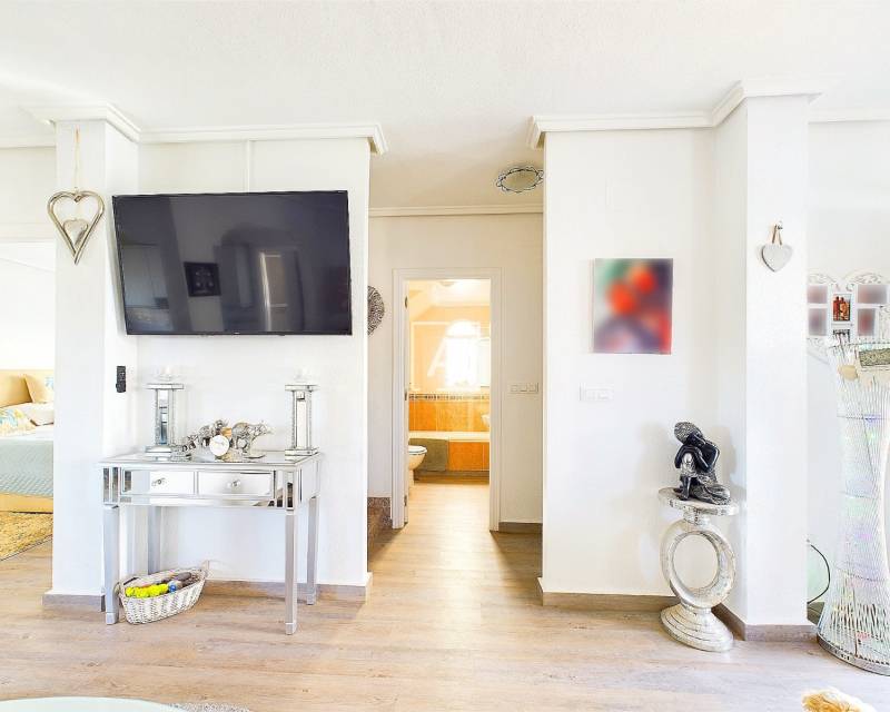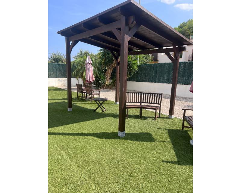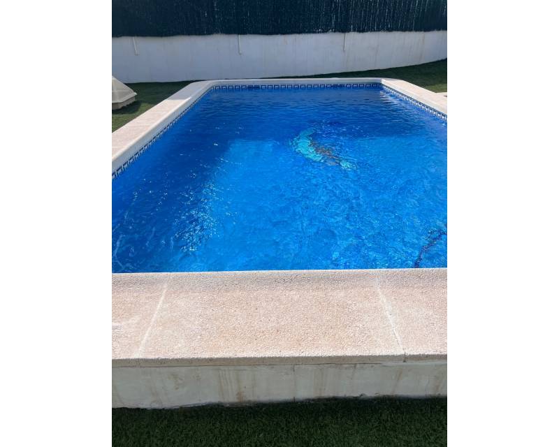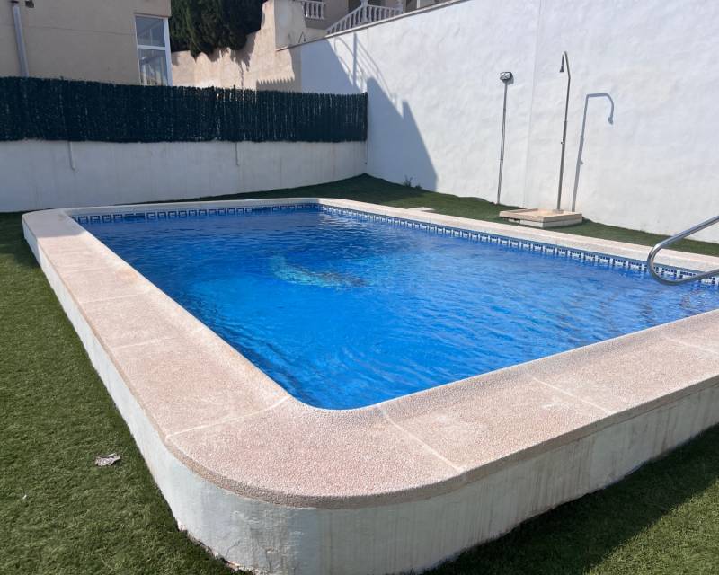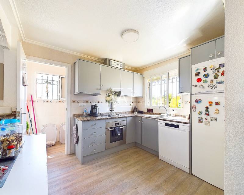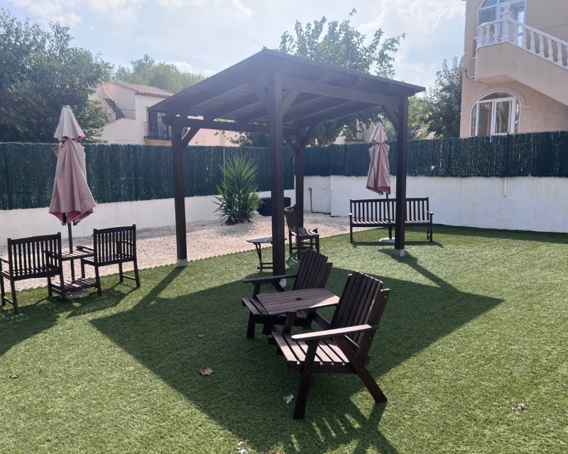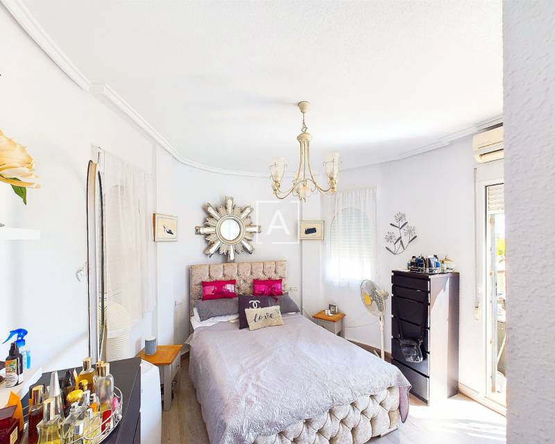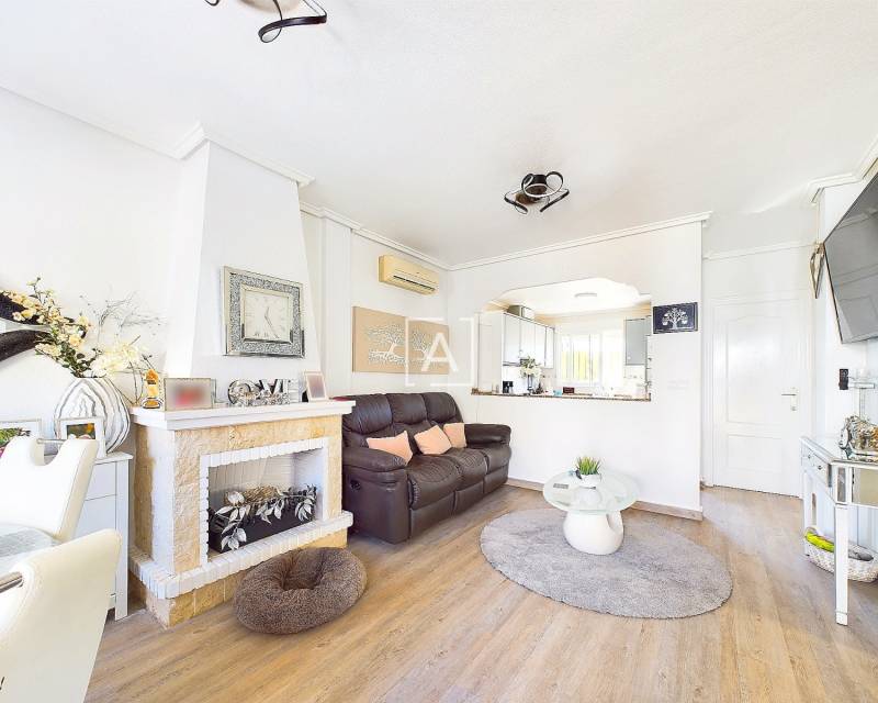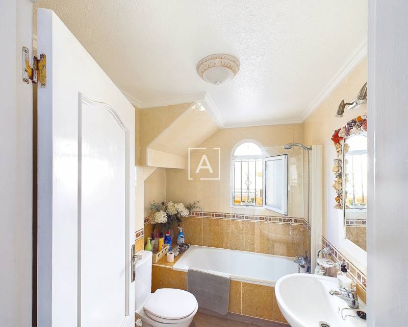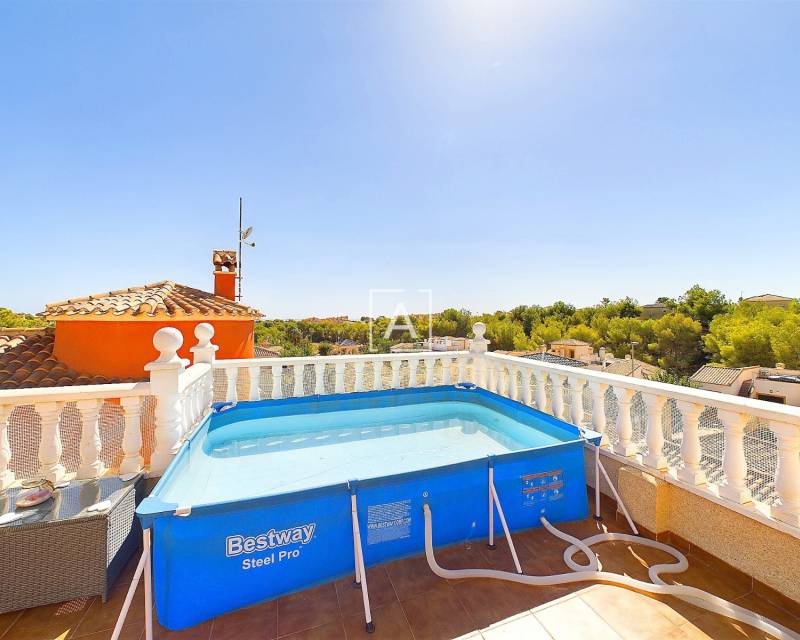 We are delighted to present this exclusive listing, a spacious 3 bedroom 2 bathroom detached Villa in the sought after area of Pinar de Campoverde. In addition this property also features an apartment comprising of living area, bathroom/ dressing area and storage.On the ground level there is a living/dining room with open fire and air con unit. Off the lounge is a well fitted American style kitchen and utility room.On this floor are 2 good sized bedrooms and a bathroom with bath and shower over. On the second floor is a bathroom,again with bath and shower over and a bedroom. Off the bedroom is a solarium and an additional room. The current owners use this as a dressing room however it could be used as an additional guest bedroom/hobby room. Taking some steps down from the ground level is the separate apartment which features a large open plan living area ,” jack and gill” bathroom and bedroom with dressing area and additional storage. It would be possible to install a kitchen this providing a completely independent living accommodation.Outside the apartment is a private south facing seating area. The outside is low maintenance and provides outdoor seating area and parking for 1 car. There is a community pool. Viewing is highly recommended. This property is located close to amenities