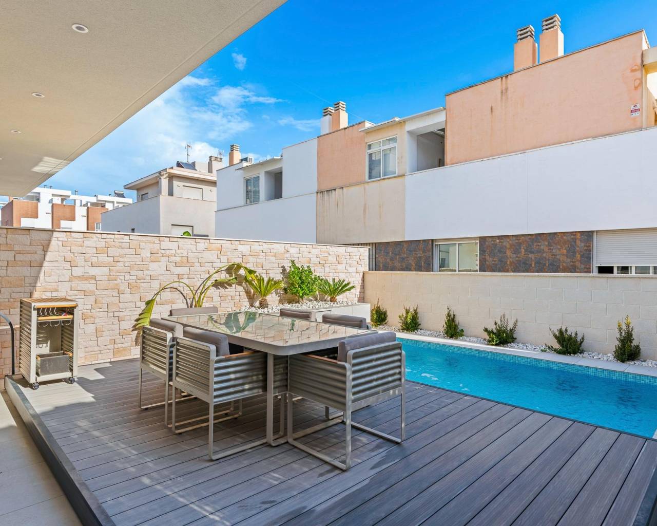 NEW BUILD SEMI-DETACHED VILLAS IN GUARDAMAR DEL SEGURA New Build residential of 8 semi-detached villas in Guardamar del Segura. Semi-detached villas with 4 bedrooms and 4 bathrooms build over 3 floors, open plan kitchen with dinning/lounge area and the large gardens and parking space on the plot. Guardamar del Segura is a town located on the Costa Blanca South. With its 11 kilometers of natural beach and its large pine forest. Guardamar is a quiet town to live in, it has all the services throughout the year such as restaurants, bars, shops, banks, places for leisure, etc. Every Wednesday, in the central streets of the town, a market is organized where many people go to buy products such as food, clothing, furniture, animals, etc. It is a great claim and inhabitants of the surrounding town come to Guardamar every Wednesday to visit the market. Guardamar del Segura has a large port with activities throughout the year, it has a large sports centre with paddle tennis, tennis, soccer and a large heated swimming pool that works all year round. It also has a library where there is free wifi and computers. Guardamar del Segura is only 20km away from the Alicante - Elche (El Altet) airport, where there are many flights every day with connections to the main European cities, due to the demand for tourists on the Costa Blanca.