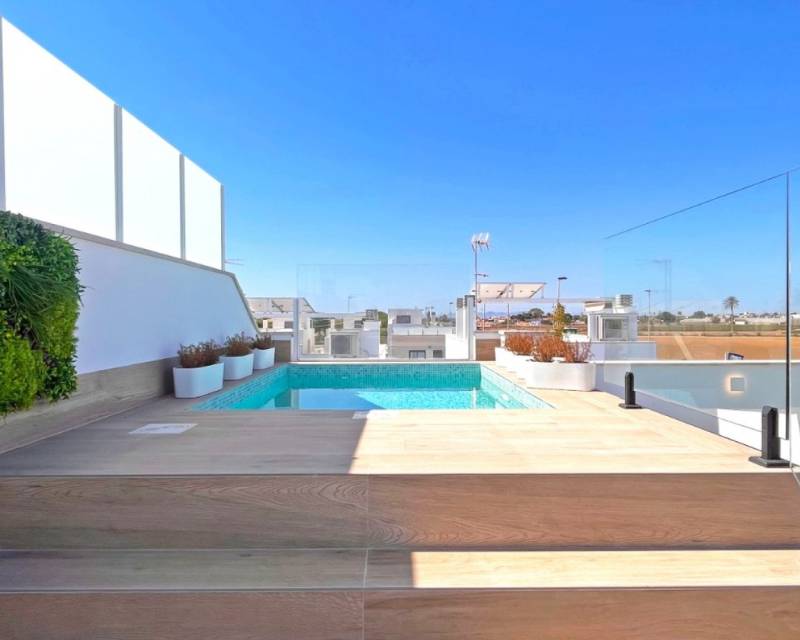 NEW BUILD RESIDENTIAL COMPLEX IN TORRE DE LA HORADADA New Build residential complex of bungalow apartments in Torre de la Horadada only 450m from the beach. All properties has 3 bedrooms, 2 bathrooms, open plan kitchen with the lounge area, fitted wardrobes and terrace. Beautiful bungalows on the ground floor has private garden with the pool, bungalow on the top floor has private solarium with the pool. All properties has private parking. Torre de la Horadada is located south of Alicante in a beautiful location on the coast. The beautiful beaches of Torre de la Horadada and Mil Palmeras have fine sand beautiful promenade. There are lots of restaurants, bars and shops, also water sports, diving and snorkelling. It is well connected just 40 minutes from Alicante and Murcias Corvera airports, with large commercial shopping centres and multiple golf courses all within easy reach.