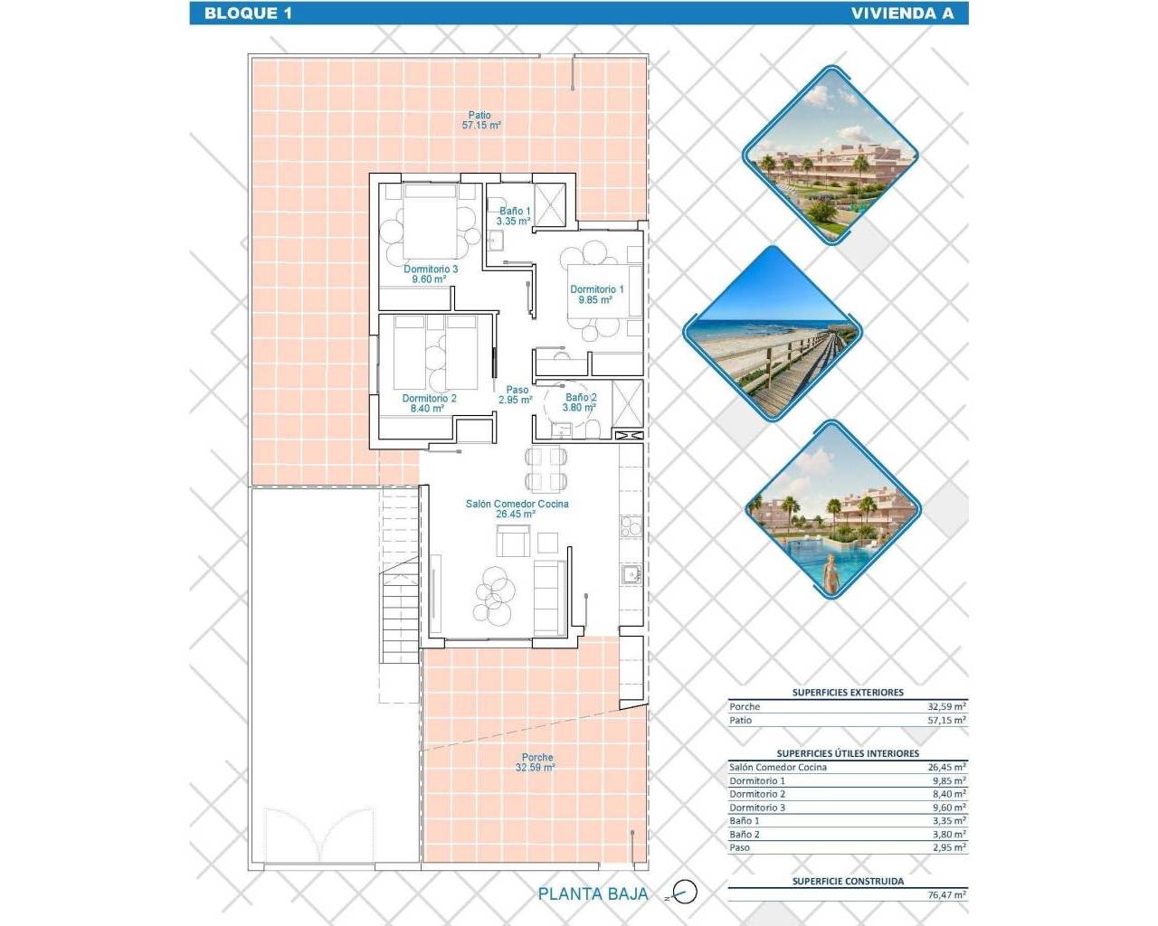 Exclusive New Development in Pilar de la Horadada, Costa Blanca, Spain Modern Homes Close to the Sea Discover this new residential complex in Pilar de la Horadada, a privileged location on the Costa Blanca. Only 2 km from the beach, this project offers a wide variety of 3 bedroom, 2 bathroom properties, with private parking included in the price. The development has spacious communal areas, including a communal swimming pool, landscaped gardens and a children's play area, ideal for the whole family to enjoy. Different Typologies to suit your Lifestyle This development offers various housing options: Ground floor apartments with private gardens. Middle floor flats with large terraces. Penthouses with private solarium. Ground floor bungalows with private garden. Top floor bungalows with private garden and solarium. Townhouses and semi-detached houses with garden and solarium. All homes have been designed in a modern and functional style, using high quality materials and contemporary finishes. Equipment and Qualities The properties are equipped with: Pre-installation of ducted air conditioning. Exterior aluminium carpentry with thermal break and double glazing. Reinforced access door for greater security. Aerothermal system for efficient hot water production. Built-in wardrobes with LED lighting. Bathroom furniture and screens included. Pilar de la Horadada: A Privileged Place to Live in Pilar de la Horadada is a coastal town at the southern end of the Costa Blanca, with an exceptional climate and an excellent quality of life. Its lively main street offers a wide variety of shops, supermarkets, restaurants and essential services. Just a 5 minute drive away, you will find the stunning beaches of Torre de la Horadada and Mil Palmeras, with golden sand a lovely promenade. In addition, the area has cycle paths, hiking trails and multiple sporting activities. Distances to Key Points Lo Romero Golf Course - 5 km (10 minutes drive). Corvera Airport (Murcia) - 40 km (40 minutes by car). Alicante Airport - 55 km (55 minutes by car). Zenia Boulevard Shopping Centre - 15 km (15 minutes by car). Torre de la Horadada Marina - 3 km (5 minutes by car). Request More Information Today Don't miss this opportunity to purchase a brand new property in one of the best areas of the Costa Blanca. Contact us now for more details and to arrange a viewing.