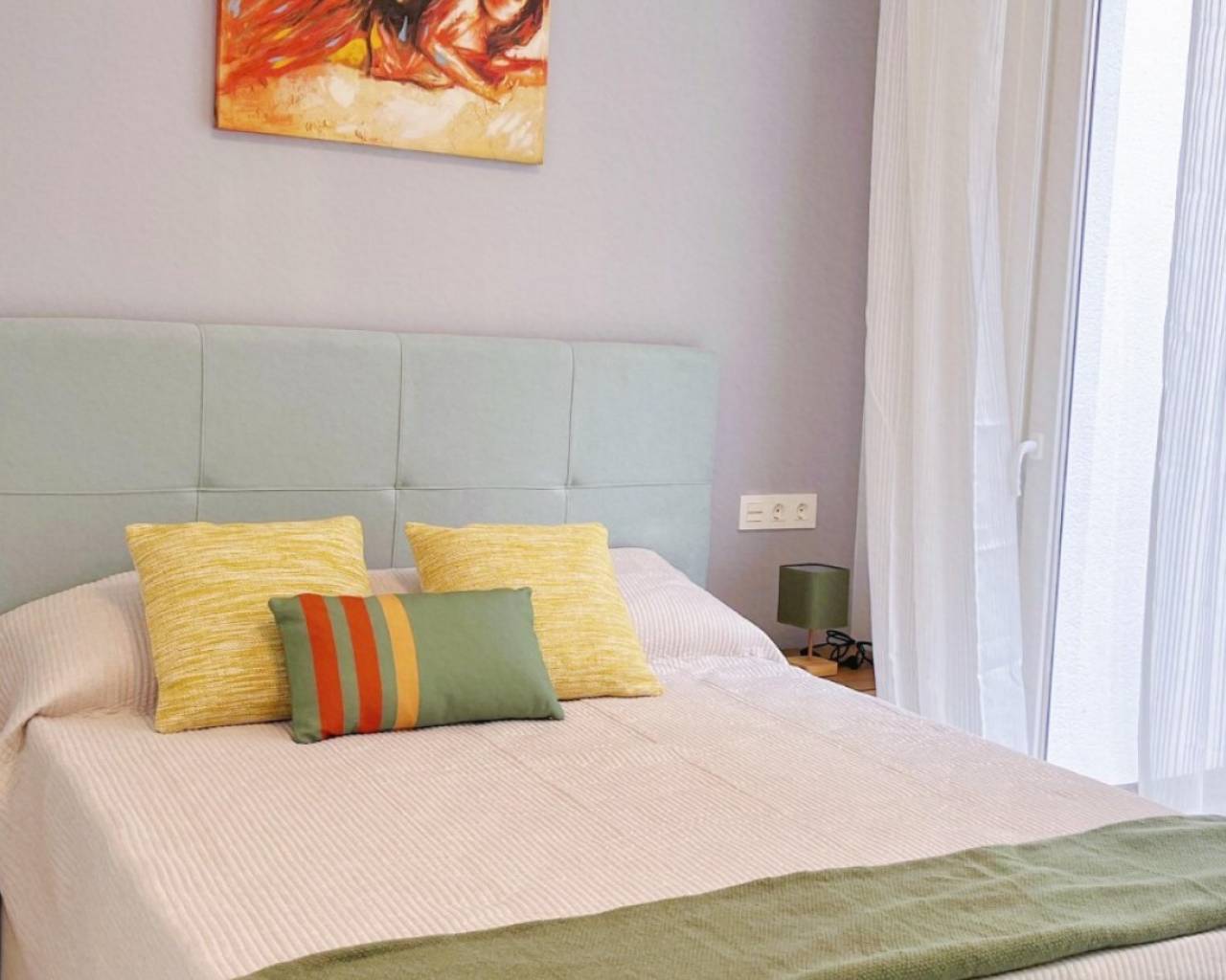 Located in the prime beachfront area of Avenida de la Purísima, just steps from Playa del Cura, this stylish ground floor apartment offers the perfect balance of coastal lifestyle and modern elegance. With 90 m² of built space, the home features 2 spacious bedrooms, 2 luxurious bathrooms, and a beautifully designed private patio—making it ideal as a permanent residence, a premium holiday home, or an attractive rental investment. Inside, the apartment boasts a bright open-plan living and dining area, floor-to-ceiling windows, and sleek interior finishes. The contemporary kitchen is fitted with top-quality BOSCH appliances, matte black countertops, and elegant cabinetry. Both bedrooms are tastefully furnished with designer wardrobes and plush bedding, while the master suite opens directly to a private patio featuring an outdoor shower, artificial grass wall, and wood accents—a peaceful space to unwind after a day at the beach. The two bathrooms are finished with high-end ceramic and marble-look tiles, LED-lit mirrors, and walk-in glass showers for a touch of hotel-style comfort. Key Features: 2 bedrooms and 2 bathrooms Private internal patio with outdoor shower Fully furnished and move-in ready BOSCH kitchen appliances Elegant white marble-effect floors LED mirrors and designer finishes Fitted wardrobes and extra storage East-facing with natural light throughout Heating and air conditioning Accessible entrance for reduced mobility Surrounded by shops, restaurants, and 24h pharmacy Just 100 meters from the sea This is a rare opportunity to own a fully renovated, turnkey apartment in one of Torrevieja’s most sought-after locations, combining modern comfort, unbeatable convenience, and timeless style. Book your private viewing now!