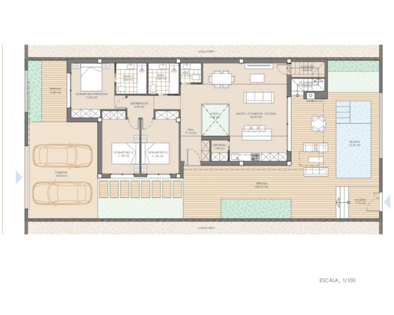 NEW BUILD VILLAS IN SAN JUAN DE LOS TERREROS The contemporary and innovative architecture of modern villas arrives to create a residential complex located in the town of San Juan de los Terreros in Pulpí, Almería, in southern Spain. These carefully crafted homes and residential complex combine an exceptional level of design and quality with the highest standards of sustainability and well-being. Homes meticulously designed by the technical team of architects, so that light, spaciousness, and orientation endow each home and plot with a special character. Unique spaces that open the door to a new lifestyle to enjoy. The foundation and structure of the houses are resolved with reinforced concreate and under ten-year warranty coverage. Façades designed to reduce the energy demand of the house, combined with various materials to achieve an aesthetic consistent in terms of composition and colour as reflected in the infographics. Spacious terraces equipped with solid parapets to provide safety on the terrace railings, granting amplitude and luminosity. The exterior enclosures of the plot will be treated with the same materials used in the house, ensuring integration into the residential complex. Ventilated and insulated flat roofs on slabs, with different finishes according to their location and use. The entrance door to the house will be armoured. The doors to the master bedroom, secondary bathrooms, and toilets will include locks. The exterior carpentry will consist of windows and French windows made of lacquered Aluminium with roll-up blinds made of aluminium slats, motorized in living rooms. Video intercom system, which guarantees individual access control for each of the houses. The bathrooms will be equipped with a sink, toilet, and shower, and the toilets will have a toilet and sink. The bathrooms feature modern design sanitary appliances, made of vitrified porcelain finished in white, from the Roca brand Gap model, with chrome or matte black single-lever faucets to choose from. The shower enclosures will be fixed with 8mm tempered glass with a length of 80cm. Each pre-installation is designed for a system of up to 10 panels, which can be installed with a solar inverter connected to the home’s electrical grid to minimize electricity consumption. These panels will be integrated onto the roof, in the installation area, hidden from the exterior of the dwelling. Air entry to the dwellings will be ensured by incorporating a micro ventilation system in the windows of living rooms and bedrooms. Independent smoke exhaust for kitchen extractor hood. A home automation pre-installation in the dwelling with preparation for a future installation of home automation for controlling room climate and heating, blinds, and possible intruder alarm systems. Pre-installation of video surveillance in the parking area and interior zones of the plot. Each dwelling will have a fully installed kitchen finished in matte white, according to design, with a GOLA system. The interior cabinets will be white, with hinged doors and drawers with brakes under the ceramic hob, ready to install visible appliances. Appliances are not included. Bedrooms with built-in wardrobes will be delivered with sliding doors in matte white. These homes will feature energy efficiency and savings along with low pollution. They are designed with a focus on greater efficiency for lower energy consumption, promoting rational energy use while also caring for the environment, quality, and climate comfort within the dwelling. Low-emissivity glass prevents heat loss to the exterior, resulting in economic savings by retaining heat in the home during winter and preventing heat from entering during summer. The HVAC and hot water systems are designed with individual systems to maximize the consumption and efficiency of each dwelling. San Juan de los Terreros is a coastal hamlet belonging to the municipality of Pulpí. It is known for its magnificent beaches, the last ones in Andalusia. Off the coast of San Juan de los Terreros, there are two small islets of volcanic nature that form the Natural Monument of Isla de Terreros-Isla Negra. The most characteristic monument of the town is the Castle of San Juan de los Terreros, built in 1764 on a promontory from which, on clear days, a large part of the coastlines of Almería and Murcia can be seen. Integrated in the tranquillity and beauty of its own nature, bathed by beaches and coves of crystalline water, classified among the best in Spain. Surrounded by protected natural landscapes that fill us with calm and at the same time, recharge us with energy, thanks to a vibrant gastronomic, social, and sports offer. Exclusive restaurants, sports clubs, and of course, excellent golf courses overlooking the sea like Aguilón Golf. A perfect destination to enjoy with family all year round. 607