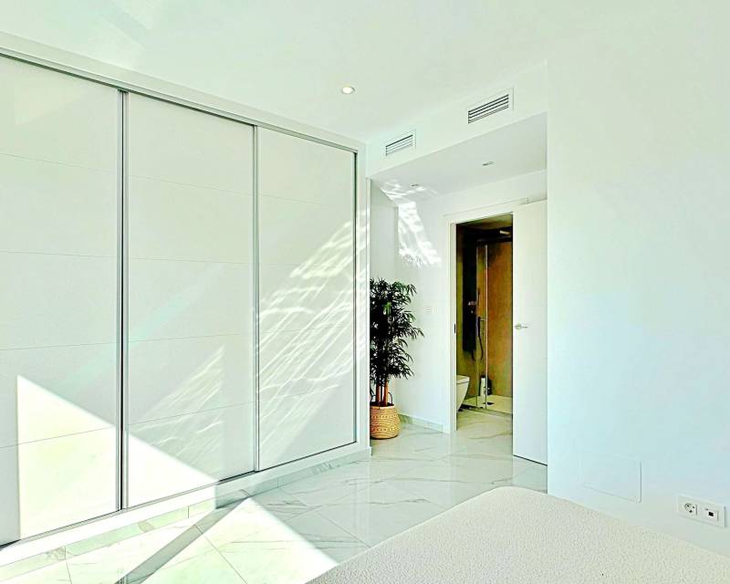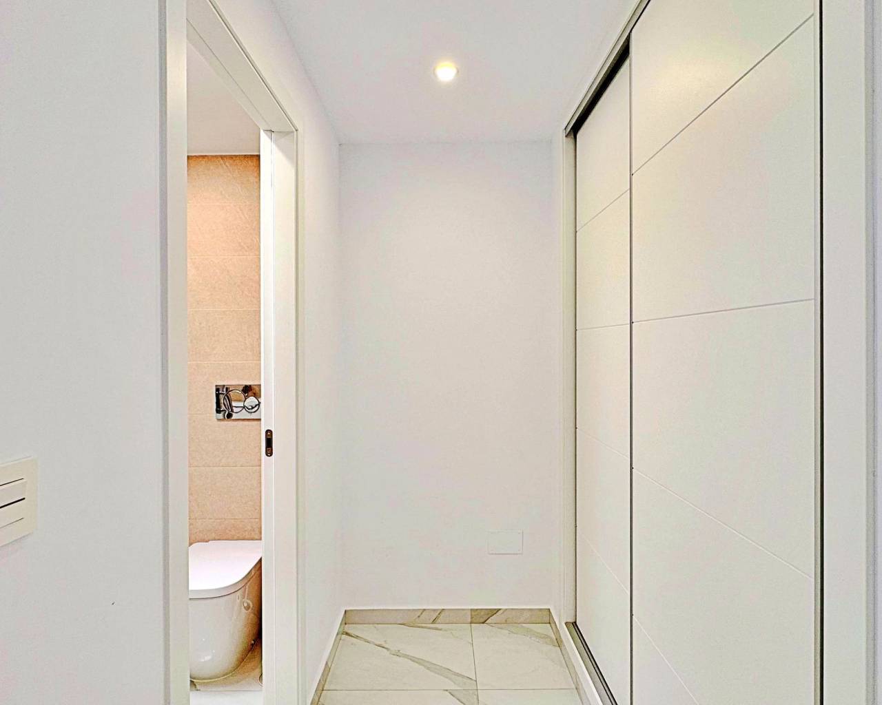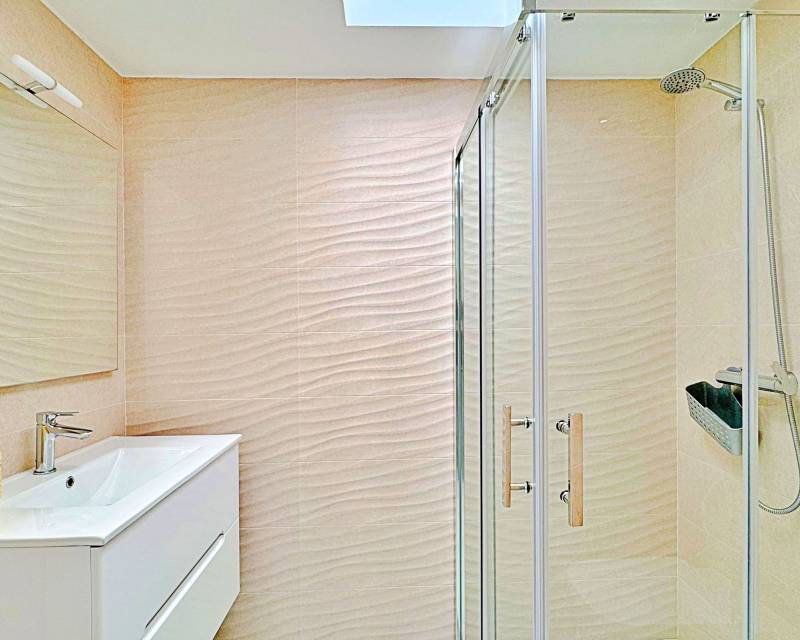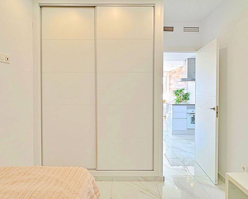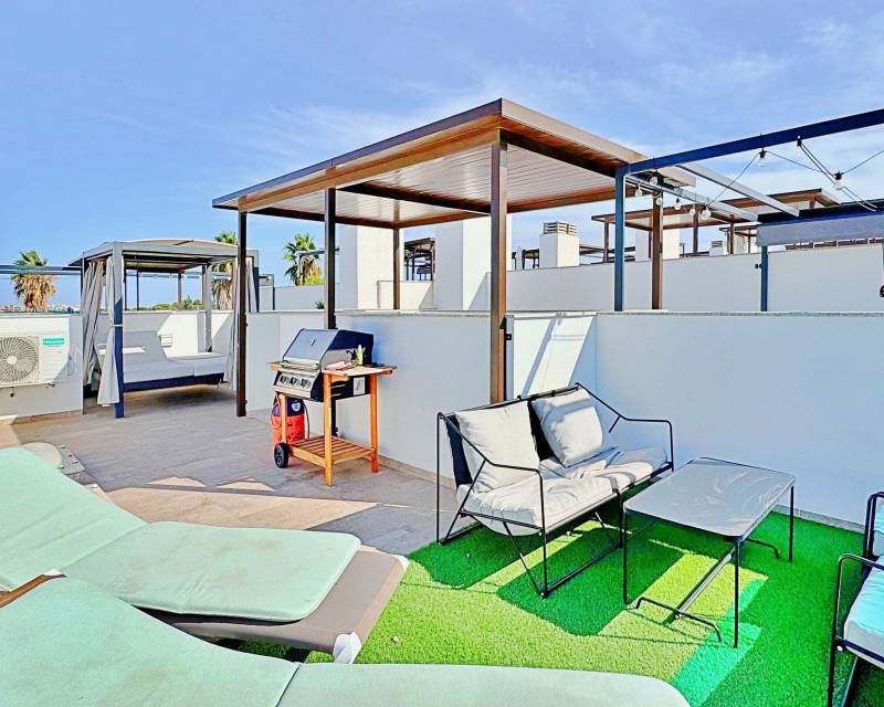 This three-bedroom, three-bathroom duplex townhouse is located in the exclusive residential area of Los Balcones in Torrevieja. The property stands out for its modern design, bright interiors and spacious terraces that allow you to enjoy the Mediterranean lifestyle all year round. On the ground floor, the house features a private 22 m² garden with space for outdoor dining. Inside, there is an open-plan living room with an elegant feature wall, connected to a fully equipped modern kitchen with appliances and breakfast bar. This level also includes a bedroom with fitted wardrobes, currently adapted as a study, and a complete bathroom with shower. Upstairs, there are two further bedrooms, both with fitted wardrobes. The master bedroom is particularly bright and has direct access to a private terrace with views of the residential area and the swimming pool. This floor also offers two additional bathrooms with modern finishes. The property also benefits from a large private solarium with open views of the Torrevieja lagoon, equipped with a chill-out area, pergola, barbecue and sun loungers — perfect for outdoor gatherings or simply relaxing in a peaceful setting. The residential complex offers large communal areas with a swimming pool surrounded by palm trees and green spaces, creating an ideal environment for families or those seeking a relaxed lifestyle. Los Balcones is one of the most established residential areas of Torrevieja, with all services nearby: supermarkets, schools, pharmacies, sports facilities and Torrevieja University Hospital. The beaches of Punta Prima and Torrevieja are less than 4 km away, making this property an excellent choice both as a permanent residence or a holiday investment.