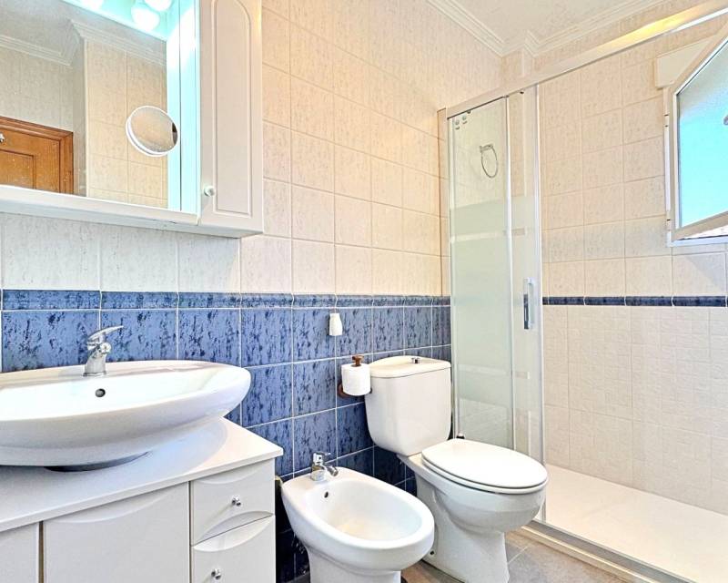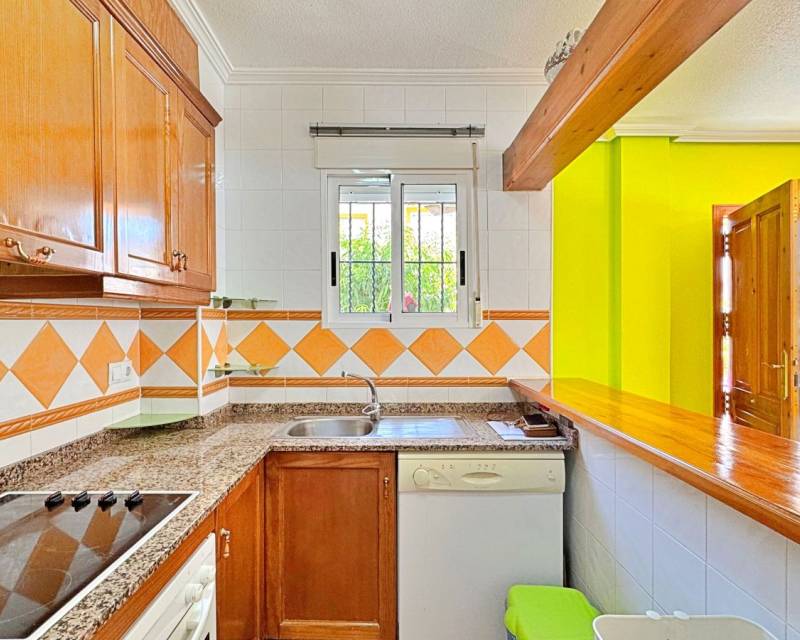 Semi-detached villa located in a private residential complex with a communal swimming pool, in a quiet and well-connected area. The property offers 86 m² built, distributed over two floors, with bright rooms and a layout designed for comfort. On the ground floor, there is a spacious living-dining room with direct access to the terrace, a fully equipped open-plan kitchen with breakfast bar, and a guest toilet. The upper floor includes two double bedrooms with fitted wardrobes, one of them with access to a private terrace, as well as a complete bathroom with shower. The outdoor areas are one of its main highlights: a private 20 m² solarium with open views, perfect for enjoying the Mediterranean climate, and an 80 m² plot with a covered terrace and a paved lateral area with independent access from the street. The property is sold fully furnished and equipped, ready to move into. The complex also offers a communal pool surrounded by green areas, creating a safe and family-friendly environment with all amenities nearby: supermarkets, restaurants, schools and public transport. An excellent opportunity for those looking for a ready-to-enjoy home, whether as a permanent residence, a holiday home or a rental investment on the Costa Blanca.