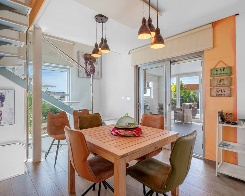 This impressive villa in Benijófar combines luxurious living with practical possibilities. The top floor features a very spacious master bedroom, a large dressing room, and a generous bathroom. The bedroom opens onto an extensive terrace, perfect for sunbathing or enjoying the views. The ground floor (approx. 85 m²) is currently set up as a practice area, with one large main room and two adjoining treatment rooms. It also includes a laundry room, a large storage area, and a separate room for the boiler and heating system. This level offers plenty of potential: the treatment rooms could easily be converted into additional bedrooms, and the entire ground floor could serve as a guest house or self-contained apartment. Please note: no photos of this floor are currently available. On the first floor is the spacious living area with open kitchen, fully equipped with Miele appliances and finished to a high standard. This floor also includes a large bedroom with an ensuite bathroom and a separate toilet, with direct access to a terrace. Large sliding doors from the living room lead to the private pool and sunny terrace, seamlessly connecting indoor and outdoor spaces. A bright and spacious office is also available. Outside, next to the pool, there is a poolhouse with storage, a separate toilet and shower, and a covered outdoor kitchen/bar, perfect for entertaining or relaxing in the sun. This villa offers the perfect combination of luxury, comfort, and functionality – ideal for those seeking a high-end home with both private living space and a fully equipped practice area.