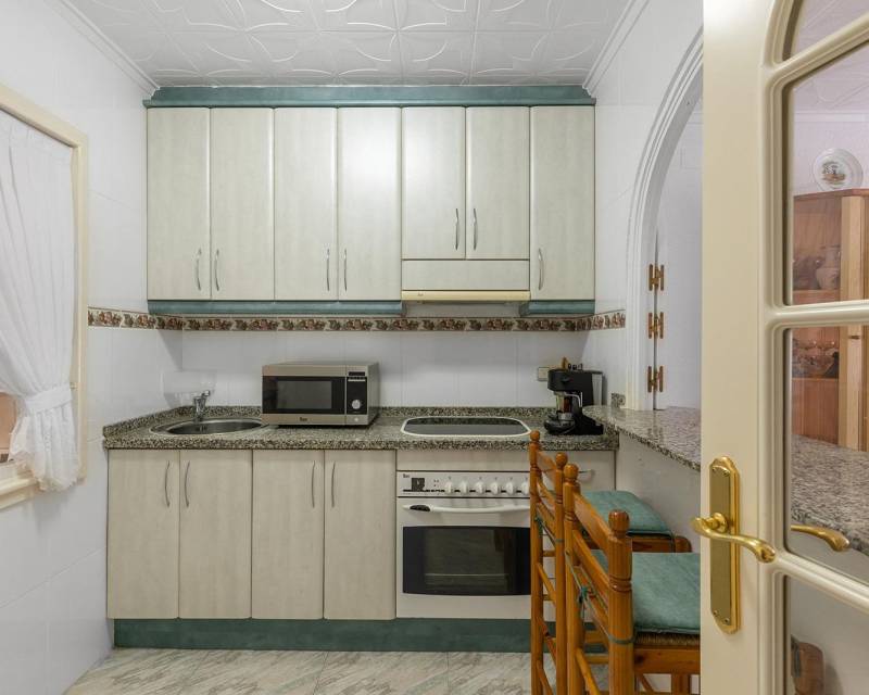 Attractive ground-floor townhouse, with no neighbours above, located in the quiet La Torreta III residential area, just 2,000 metres from the Habaneras shopping centre.~The property has two bedrooms, a bathroom, a bright living room with a fully equipped open-plan kitchen and a practical utility room. ~Outside, it has a huge, very sunny private plot of around 28 m2 with a carport, barbecue area and shower, perfect for enjoying the outdoors all year round.~Its surroundings offer tranquillity and pleasant views of nature, creating an ideal environment for both year-round living and holiday stays. ~It is sold fully furnished and equipped, in good condition, and ready to move into. There are no community fees. ~~~