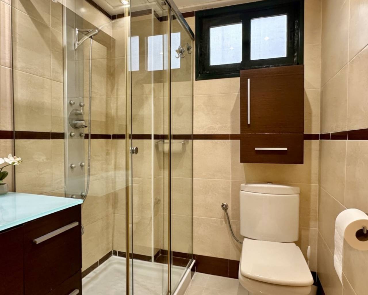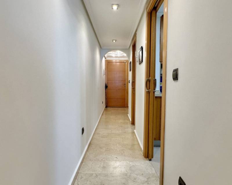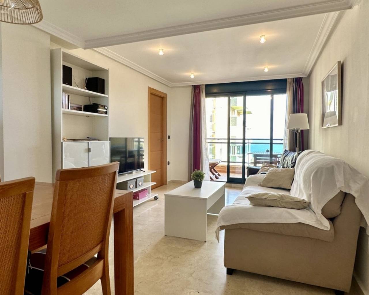 Discover a bright and comfortable apartment located just 100 metres from the sea in one of Guardamar’s most sought-after coastal areas. Positioned on the second floor with lift access, this east-facing home offers beautiful sea views from both the living room and the master bedroom. With a total area of 78 m², the property features a spacious living room, a fully equipped modern kitchen with Silestone countertops, induction hob, dishwasher, osmosis water system, flat extractor fan and a large pantry with automatic lighting. The apartment includes two bedrooms and two bathrooms — one of them en-suite with a bathtub. The second bathroom features a hydromassage shower column and thermostatic taps. Sliding doors in the kitchen and bathrooms optimise space and add a sleek touch. Additional features include fitted wardrobes, LED lighting throughout, central air conditioning (recently renewed), new mattresses, 43" and 32" LED TVs, internet, a safe, an awning on the terrace (renovated this year), and a large storage room. A private parking space in the garage is included. Located just steps from restaurants, supermarkets and schools, this home offers exceptional convenience and a true Mediterranean lifestyle — all within 100 metres of the sea.