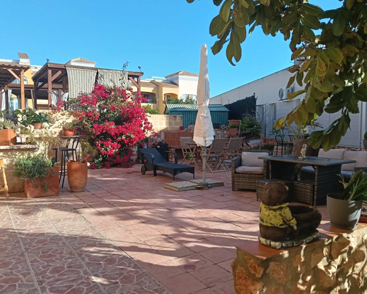 Charming ground-floor apartment in Los Montesinos, a quiet and easily accessible neighborhood, perfect for permanent living or a holiday on the Costa Blanca. The property offers 63 m² of living space and a generous 167 m² private plot, which has been transformed into a beautiful garden terrace, ideal for outdoor living. There is a lovely barbecue area with a bar, various seating areas, and lush greenery. Upon entering, you will find an inviting veranda, perfect for breakfast al fresco or relaxing. This veranda is enclosed and therefore usable year-round. Inside, the apartment comprises two bright bedrooms, both with fitted wardrobes, and a recently renovated bathroom. The separate kitchen offers a comfortable and functional space, fully equipped with appliances and with access to a practical utility room used as a laundry room. The apartment is equipped with air conditioning in the living room, ensuring year-round comfort. The current owners have made many improvements to the property, including new flooring, Mediterranean tiles on the walls, a new bathroom, and more. Thanks to its south-facing location, the apartment receives abundant natural light throughout much of the day, creating a warm and inviting atmosphere. It is ready to move into and is offered unfurnished, allowing you to decorate and furnish it entirely to your own taste. The property is part of a well-maintained residential complex with a communal swimming pool, perfect for cooling off during the summer months. It also includes a private shaded parking space, a storage room, and a reinforced security door for added convenience and security. The location is excellent:Just 15 minutes from the beaches40 minutes from the airport3 minutes from leisure areas, shops, and amenities10 minutes from golf courses A property with great potential, exceptional outdoor spaces, and a strategic location, ideal as a primary residence, second home, or investment.