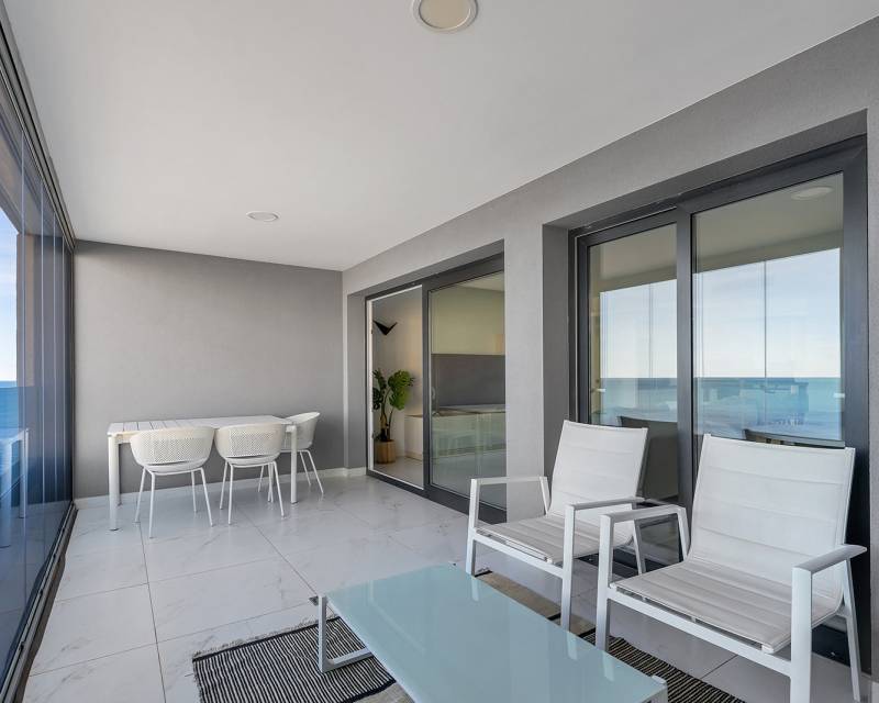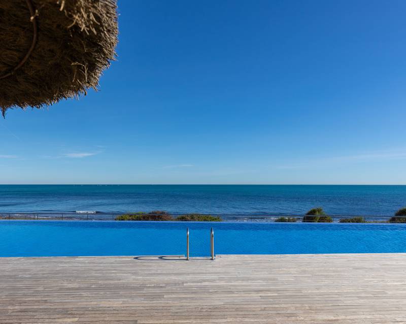This exclusive 5th-floor apartment is located in the prestigious Posidonia residential complex, on the seafront in Punta Prima. Originally designed with three bedrooms, the property was modified off-plan to offer 94 m² of pure comfort, now distributed into two spacious bedrooms and two bathrooms, gaining exceptional spaciousness in the living areas. Its key strength lies in its double orientation and outdoor spaces: a 16 m² terrace with unobstructed views of the sea and the bay of Torrevieja, and a second 12 m² rear terrace facing south with views towards La Manga, guaranteeing sun, natural light, and cross ventilation throughout the day. The property is sold fully furnished, with an underground parking space and storage room included. The complex features high-standard common areas and security. Located within walking distance of amenities, supermarkets, and coves, it is approximately 45 minutes from Alicante Airport, combining luxury and comfort in one of the most sought-after areas of the Costa Blanca.