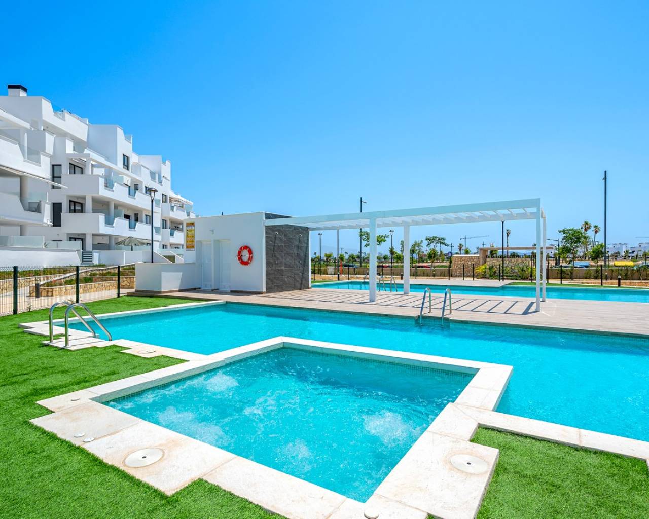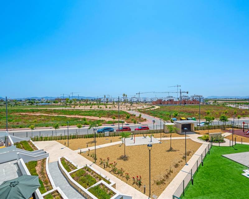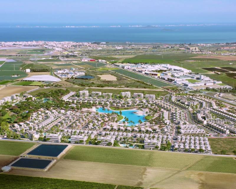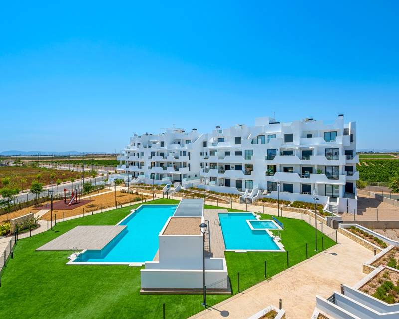 Discover this modern corner apartment with 2 bedrooms and 2 bathrooms in the prestigious Santa Rosalía Lake & Life Resort, an exclusive and fast-growing community located between the coastline and the golf courses of the Murcia region. The apartment, southwest facing, is filled with natural light and offers beautiful views over the resort and the swimming pool. The open living area with a fully fitted modern kitchen flows seamlessly onto the spacious private terrace, the perfect place to relax in the sun or enjoy the sunset. The master bedroom has its own en-suite bathroom, while the second bedroom connects to a stylish guest bathroom. Built with high-quality materials and equipped with air conditioning, the apartment ensures year-round comfort. This property is part of the Levansur Home Five development with a total of 60 apartments divided over 4 buildings, featuring 2 communal swimming pools and a heated pool. At the heart of the resort lies a stunning crystal-clear lake surrounded by beach clubs, walking paths, water sports, restaurants and leisure areas. Santa Rosalía offers a unique lifestyle where nature, relaxation and luxury come together perfectly. Whether you are looking for a holiday retreat, a permanent home or an investment with great potential, this corner apartment offers it all, comfort, style and a prime location in one of the most sought-after resorts on the Costa Cálida.