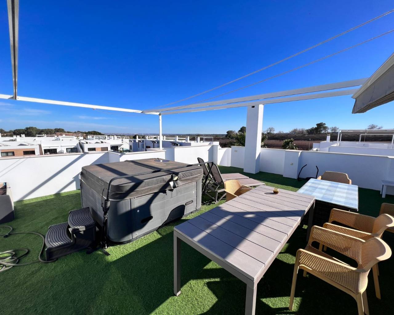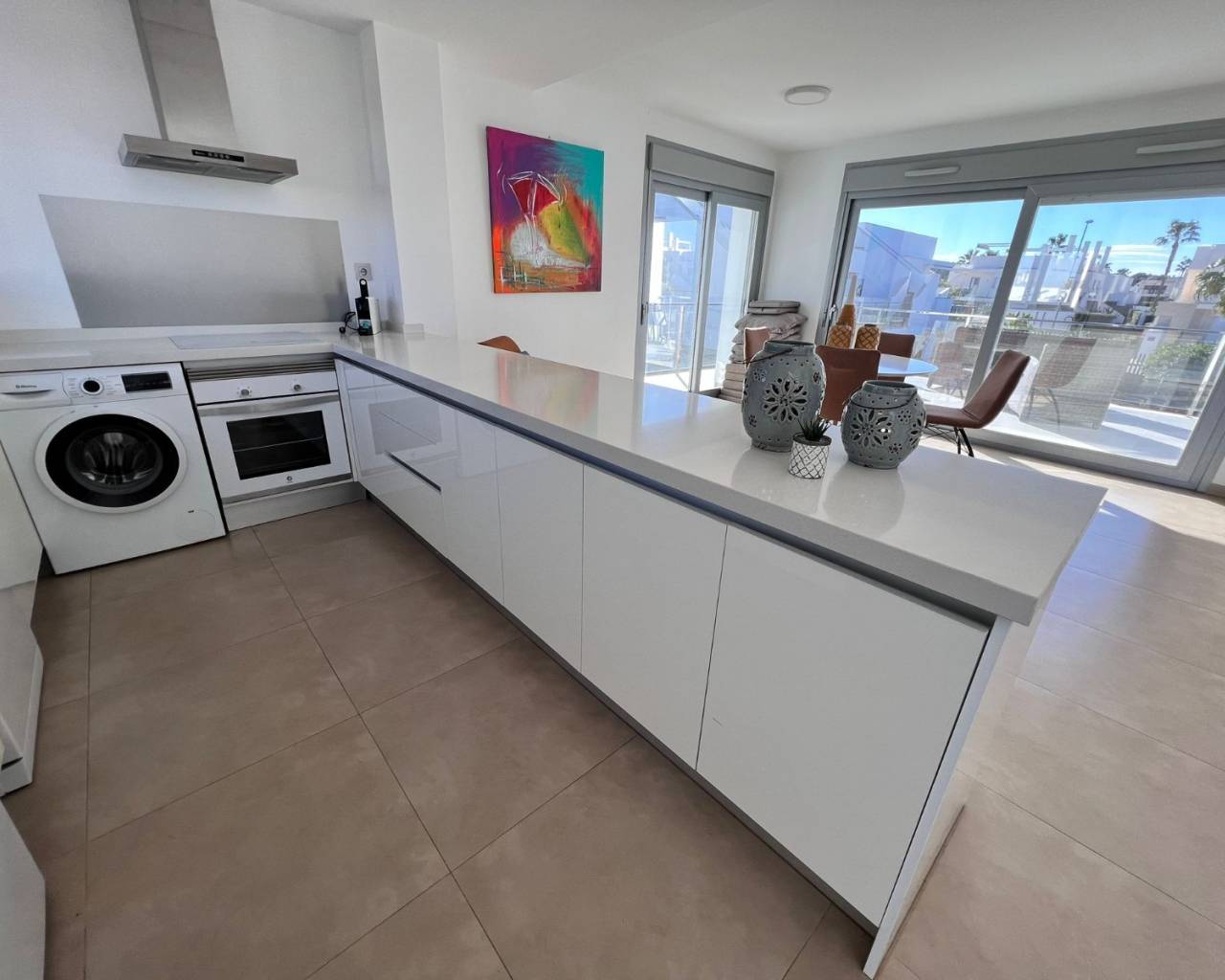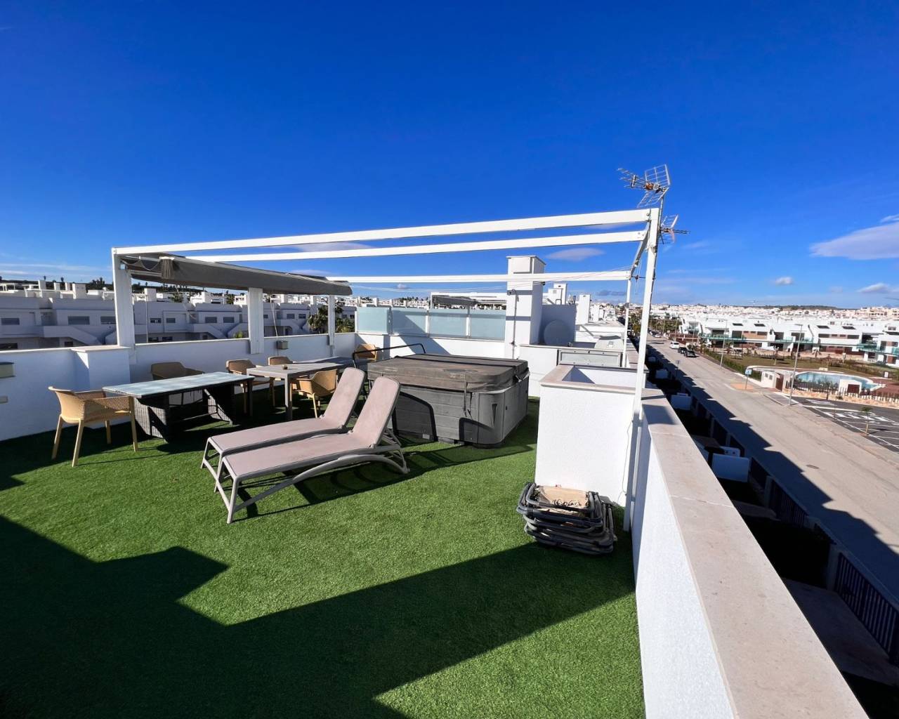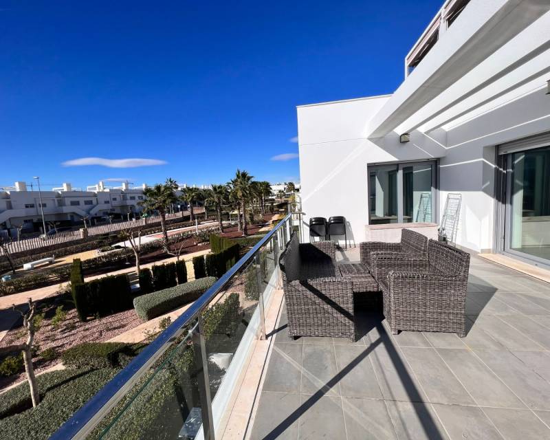 Discover this magnificent first-floor apartment, ideal as a permanent residence, a second home on the coast, or a sound investment. With 83 m² of living space, the property stands out for its excellent layout, abundant natural light, and impeccable condition: ready to move in. The apartment offers a spacious and inviting living-dining room, seamlessly connected to a modern, fully equipped open-plan kitchen. This bright and airy space creates a comfortable and functional atmosphere, perfect for enjoying time with family and friends. It features two double bedrooms with built-in wardrobes, designed to maximize storage space, and two full bathrooms, one of which is en-suite, providing both comfort and privacy. The southwest orientation ensures excellent natural light throughout much of the day, creating a warm and inviting ambiance. Furthermore, you can enjoy the Mediterranean climate on the private terrace and solarium, perfect spaces for relaxing, sunbathing, or sharing moments outdoors. There is a spacious terrace just off the living room, with access to the stairs leading up to the solarium. Up here you will find a beautiful space, which has a wonderful jacuzzi and large outdoor seating and dining area. Key Features:83 m² of living space2 bedrooms | 2 bathroomsFully equipped open-plan kitchenFurnished and including kitchen appliancesCommunal swimming poolPrivate parkingSecurity doorIntercom2 built-in wardrobesSun terrace and solariumExcellent condition Prime location:Just 20 minutes from the beaches5 minutes from the golf course10 minutes from leisure areas and amenities40 minutes from the airport Located in a quiet yet well-connected area, this apartment combines comfort, location, and quality of life in an exceptional Mediterranean setting.A unique opportunity to enjoy the sun, the sea, and tranquility all year round.