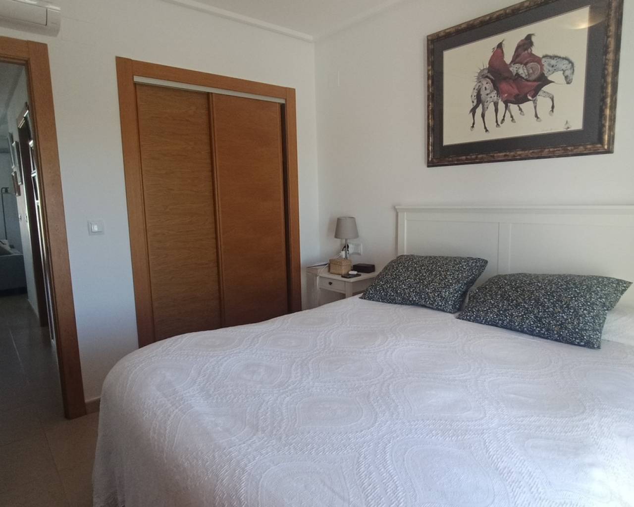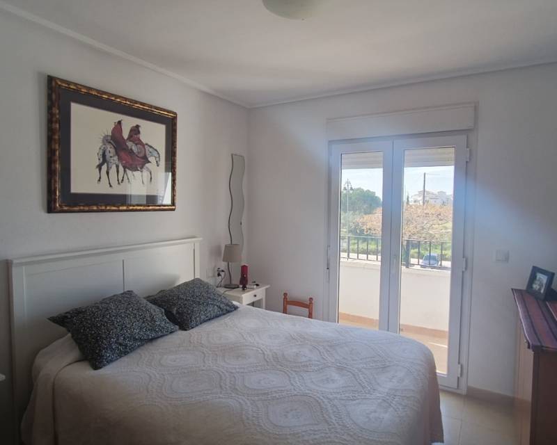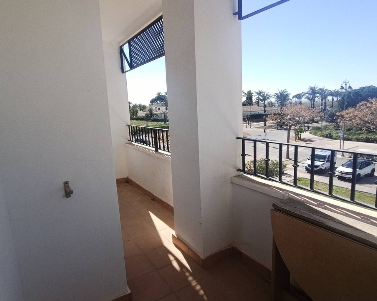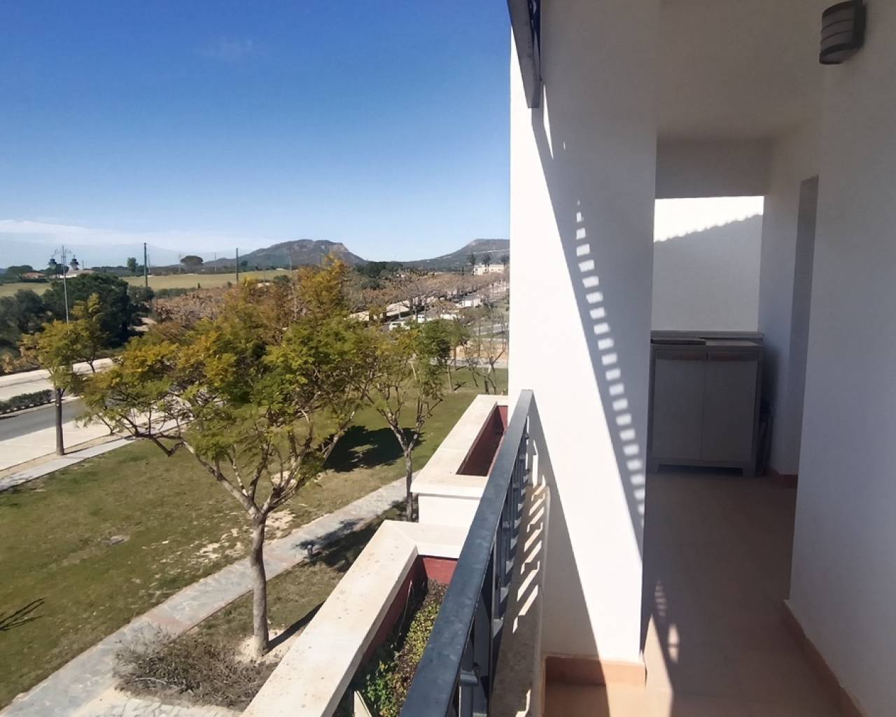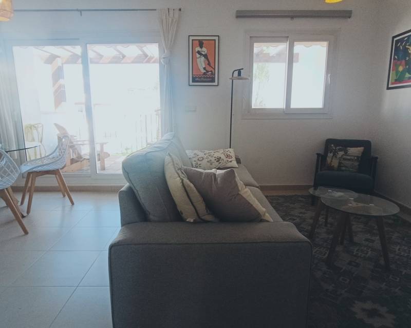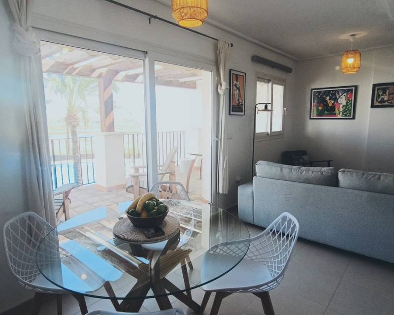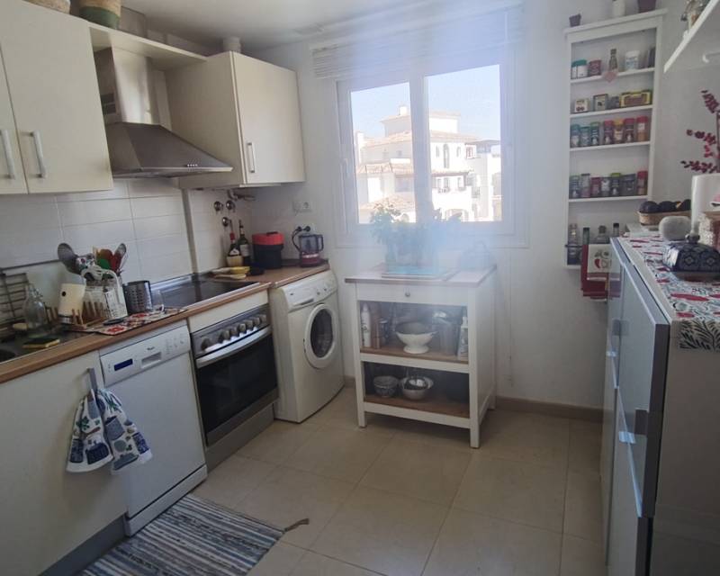 This light, bright and exceptionally spacious apartment on Calle Adriático truly has it all — spectacular golf and lake views, dual terraces, lift access, underground parking, and an enviable position just 200 metres to the town centre restaurant and supermarket.The apartment opens into a generous living–dining area featuring an attractive curved wall design that creates a defined dining space. The room is furnished with a glass dining table and chairs, comfortable sofa, auxiliary seating, and storage units, offering a welcoming and practical layout.Large patio doors lead directly onto the spacious east-facing terrace, where you can enjoy spectacular open views across the swimming pool, golf course and lake. Perfect for morning coffee and sunrise views, this terrace benefits from one of the resort’s most sought-after orientations while remaining conveniently close to the bar and amenities.To the left of the entrance hallway is the impressively large, square kitchen — fully fitted with ample cabinetry and complete with fridge-freezer, washing machine, dishwasher, ceramic hob, oven and extractor fan. A kitchen window frames beautiful golf course views, making it both bright and enjoyable to work in.The curved wall in the living room leads through to an inner hallway giving access to the sleeping accommodation.On the left is a spacious family bathroom, fitted with shower, WC and vanity unit.There are two bedrooms:Master bedroom with double bed, fitted wardrobes, bedside cabinets and air conditioningSecond bedroom currently arranged with a single sofa bed and air conditioningBoth bedrooms benefit from patio doors opening onto a second west-facing terrace, enjoying mountain views and evening sunshine — ideal for relaxing at the end of the day. With doors open to both east and west terraces, the apartment benefits from excellent natural airflow and a wonderful cross-breeze.The property is sold fully furnished as seen and is located in a prestigious building with lift access. An underground parking space is included in the sale.Set within the beautiful Hacienda Riquelme Golf Resort, residents enjoy:19 communal swimming poolsLandscaped gardens24-hour securityGolf course and driving rangeSports facilitiesOn-site supermarket and restaurantThe charming village of Sucina is just a short drive away, with the coast and airport approximately 20 minutes by car.This is an ideal lock-up-and-leave holiday home, yet spacious enough for comfortable permanent living. Early viewing is highly recommended.
